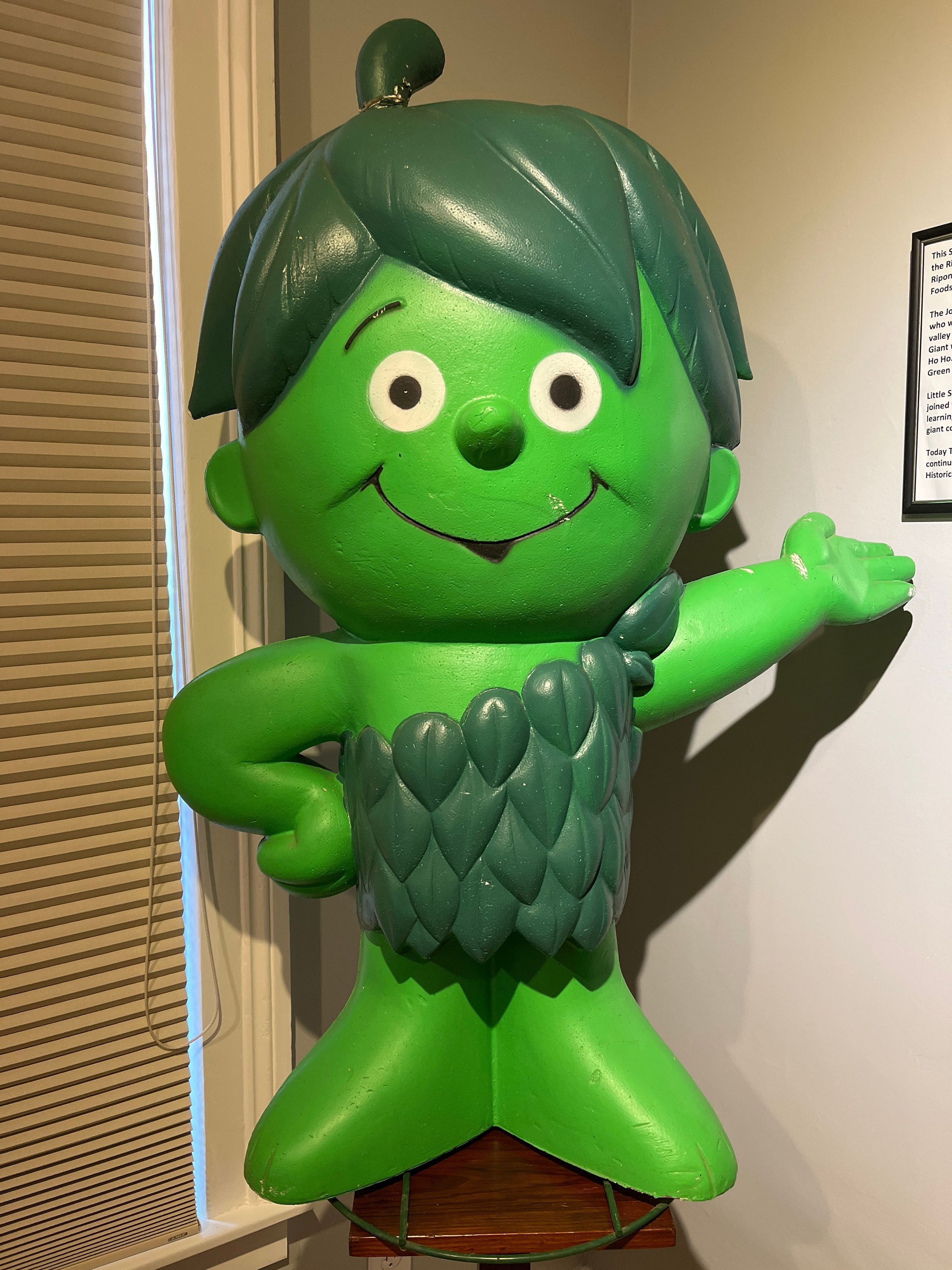 A 3' 8" foam painted statue of Green Giant "Sprout" standing on metal wire base. Stem on cap seems to have been broken off and glued back on. A very few dents and spots where white foam is exposed. In excellent condition. Date not known.