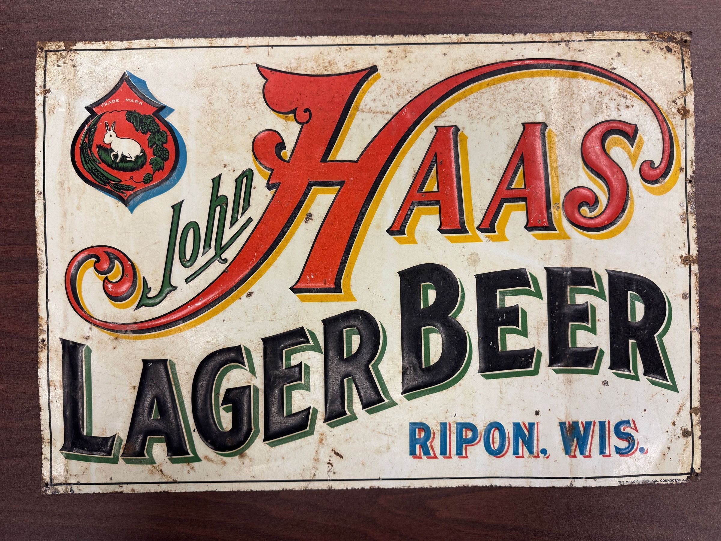 John Haas Lager Beer, Ripon, Wis., metal sign. Date range 1907-1915.