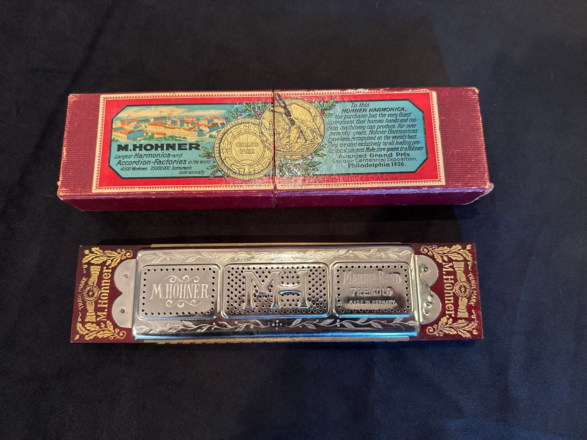 Hohner "Marine Band" 8 3/8" long "Tremolo" harmonica only slightly used. In maroon lidded box. Intact but worn. Belonged to Mildred Schweisow b. 1917, d. 2001. Not dated but after 1926. Stored in music cabinet in Pickard House parlor.
