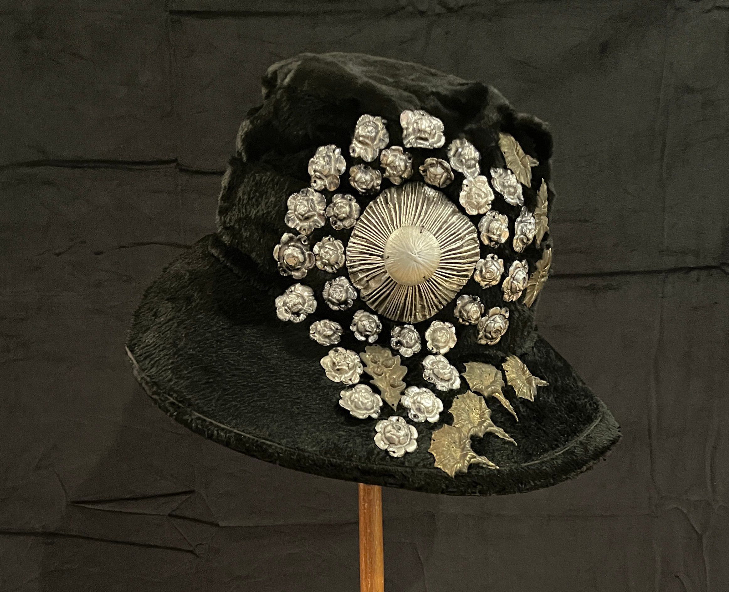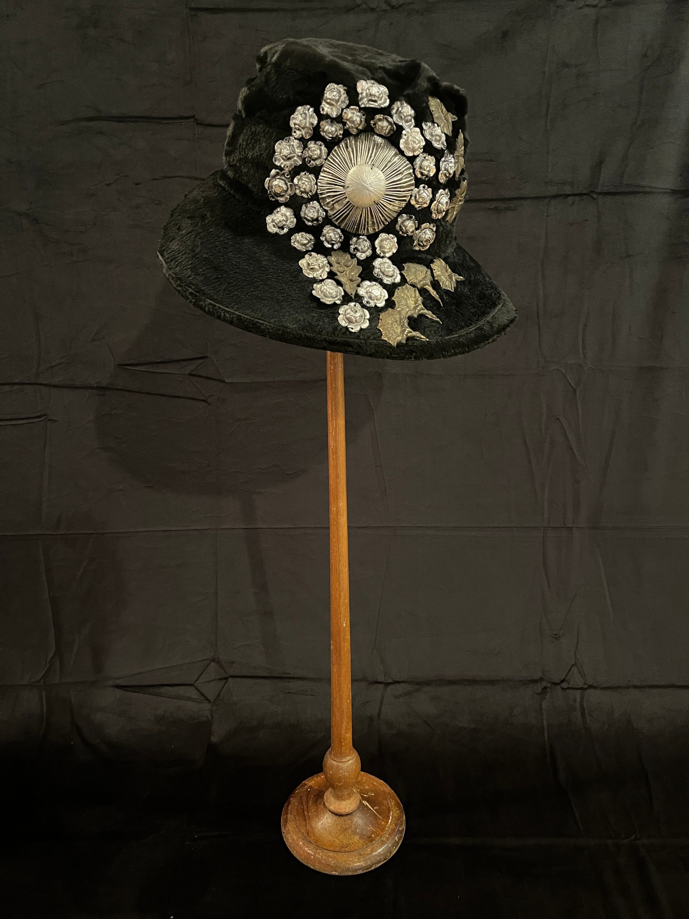 Woman's velvet hat, c 1927. In the 1920’s, hats continued to get lower on the brow and closer fitting on the head. The “cloche hat”, a bell-shaped piece that sometimes covered the wearer’s head almost entirely, became a staple of the period. Rather than tall feathers or blooms adorning the hats, design was seen through elaborate detailing in shape. The black velvet hat on display has art deco style metallic embellishments.Acquisition