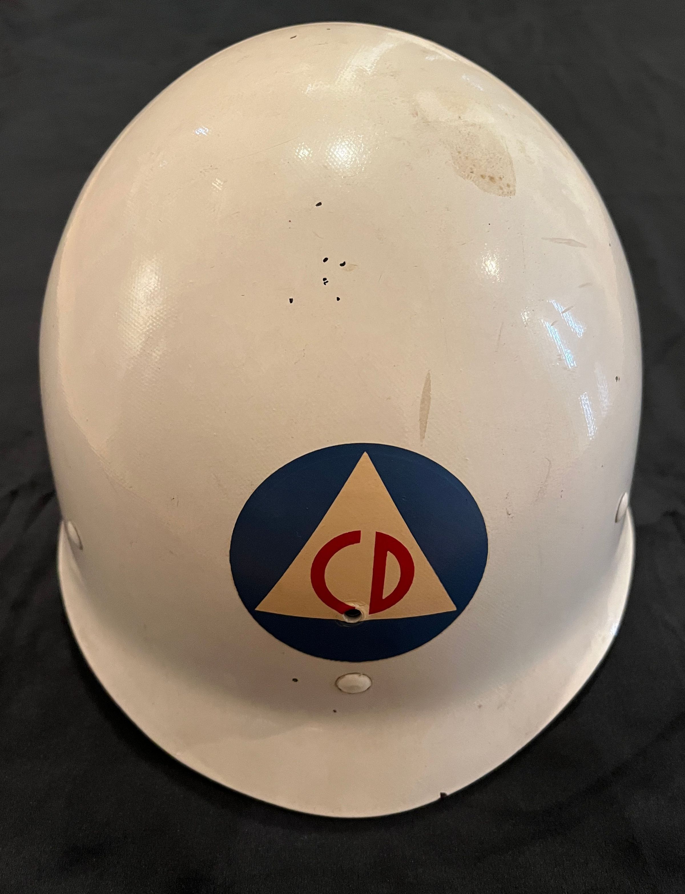Civil Defense hard hat: Hat worn by Wm. Brandt, Civil Defense volunteer in mid 1950's in Ripon, WI, when Russian Communist aggression was feared in U.S. Workers were also trained in how to respond to any local disaster. White exterior with brown interior.Context
