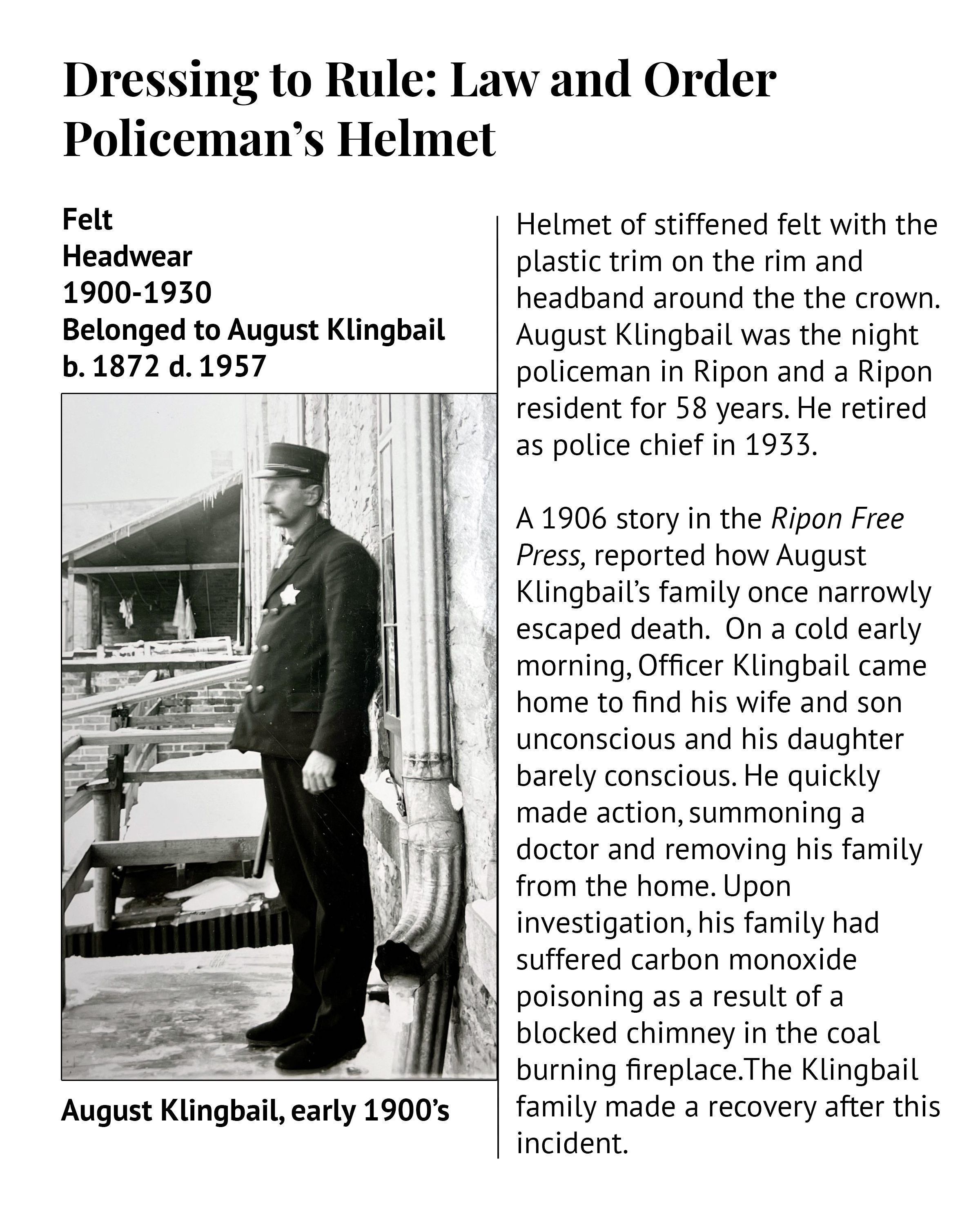 A 1906 story in the Ripon Free Press, reported how August Klingbail’s family once narrowly escaped death. On a cold early morning, Officer Klingbail came home to find his wife and son unconscious and his daughter barely conscious. He quickly made action, summoning a doctor and removing his family from the home. Upon investigation, his family had suffered carbon monoxide poisoning as a result of a blocked chimney in the coal burning fireplace.The Klingbail family made a recovery after this incident.Collection