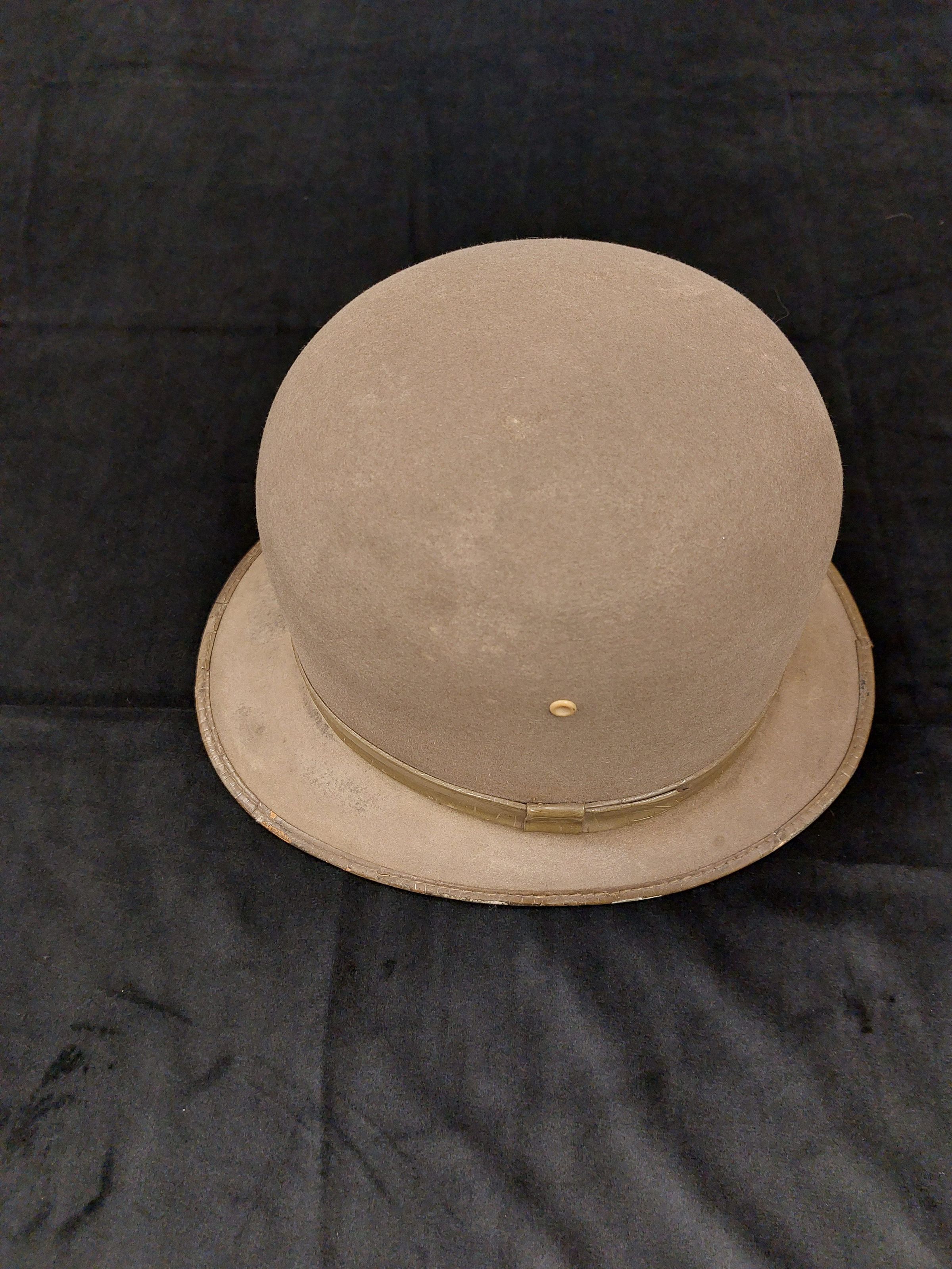 Belonged to August Klingbail, night policeman in Ripon from c. 1900 to the late 1930's. Society owns a picture of him wearing helmet. Mr. Klingbail lived at 344 Washington St. He was Frank Farvour's maternal grandparent. Olive drab in color. Appears to be made of a stiffened felt-like material with plastic trim on rim and headband around outside of crown. Trim is worn, all soiled but body of helmet is intact and in displayable condition.Context