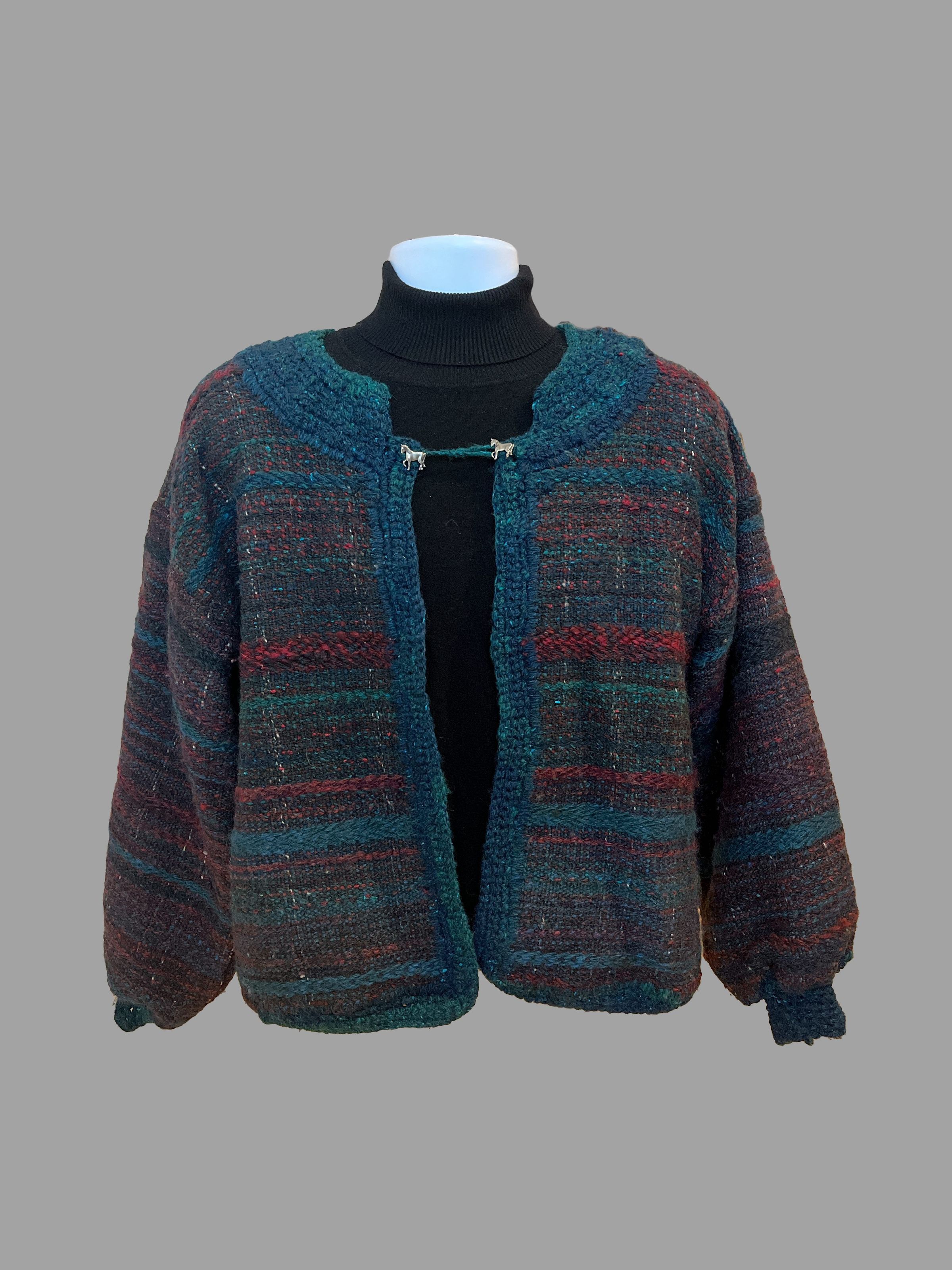 Handspun/handwoven teal and red woman's jacket with pewter horse buttons