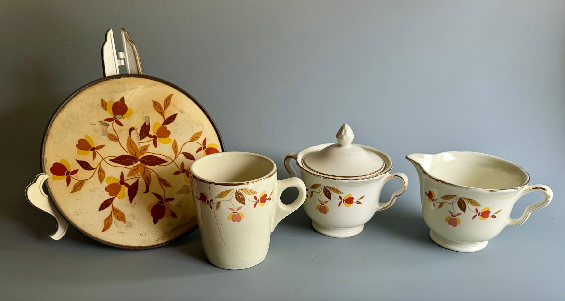 Jewel Tea Co. dishes: creamer, sugar bowl with lid, coffee mug, and hot plate. Decorated in the "Autumn Leaf" pattern. Manufactured by the Hall china company from 1933 to 1976.Context