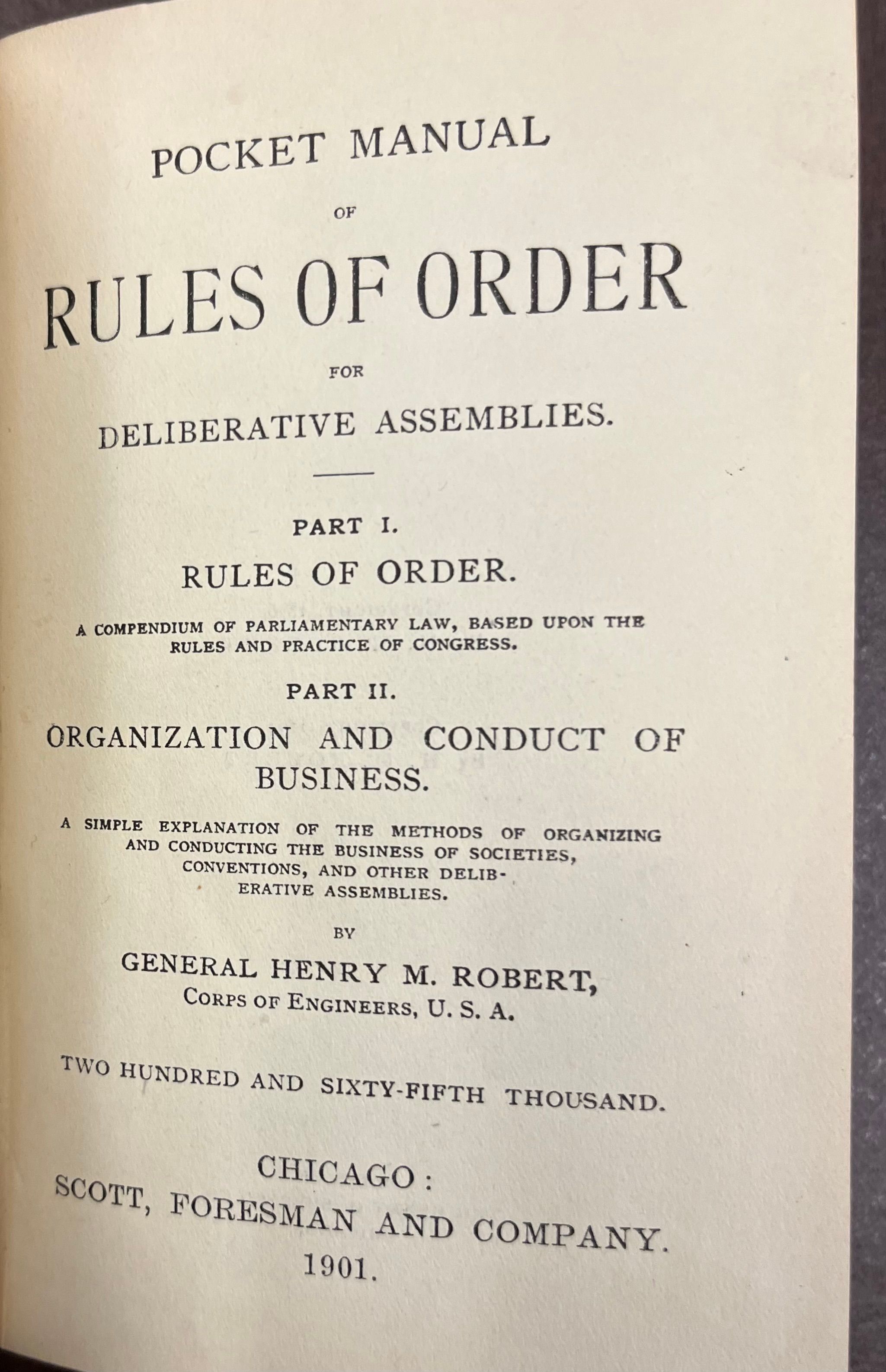 The 1901 "Pocket Manual of Rules of Order for Deliberative Assemblies" covers the basic rules of order for organizing and conducting meetings.
