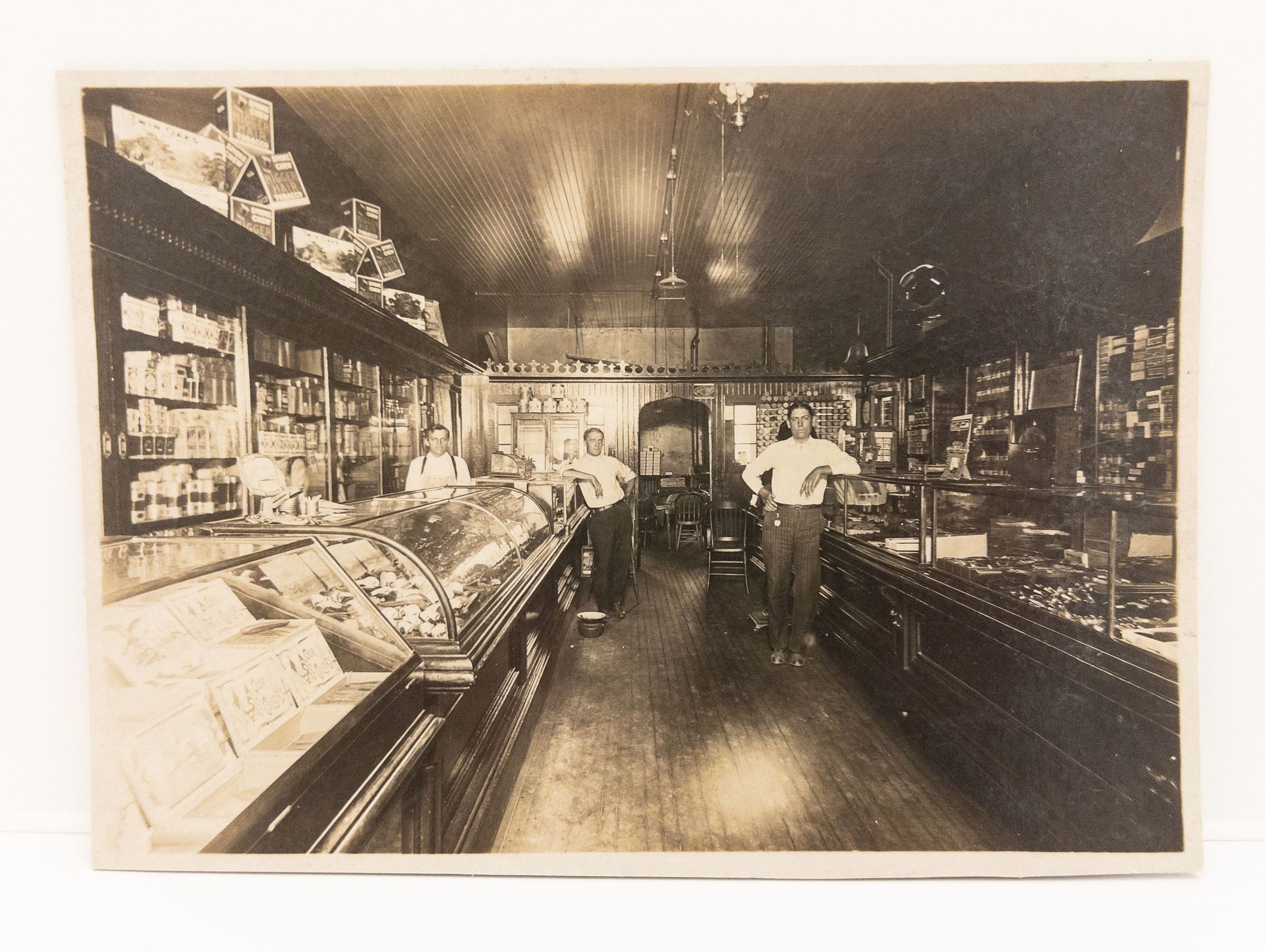 Black & white 5 x 7 photograph of interior of Luetke Tobacco, 209 Watson. Writing on back says :Grandpa Luetke - Henry - Uncle Corky's father behind counter in tobacco shop - Watson St, Ripon. Similar interior to 2006.0343.0188 except for flooring and lighting. Note boxes on top of display shelving that say Smoke, Chew Nigger Hair Tobacco.Acquisition