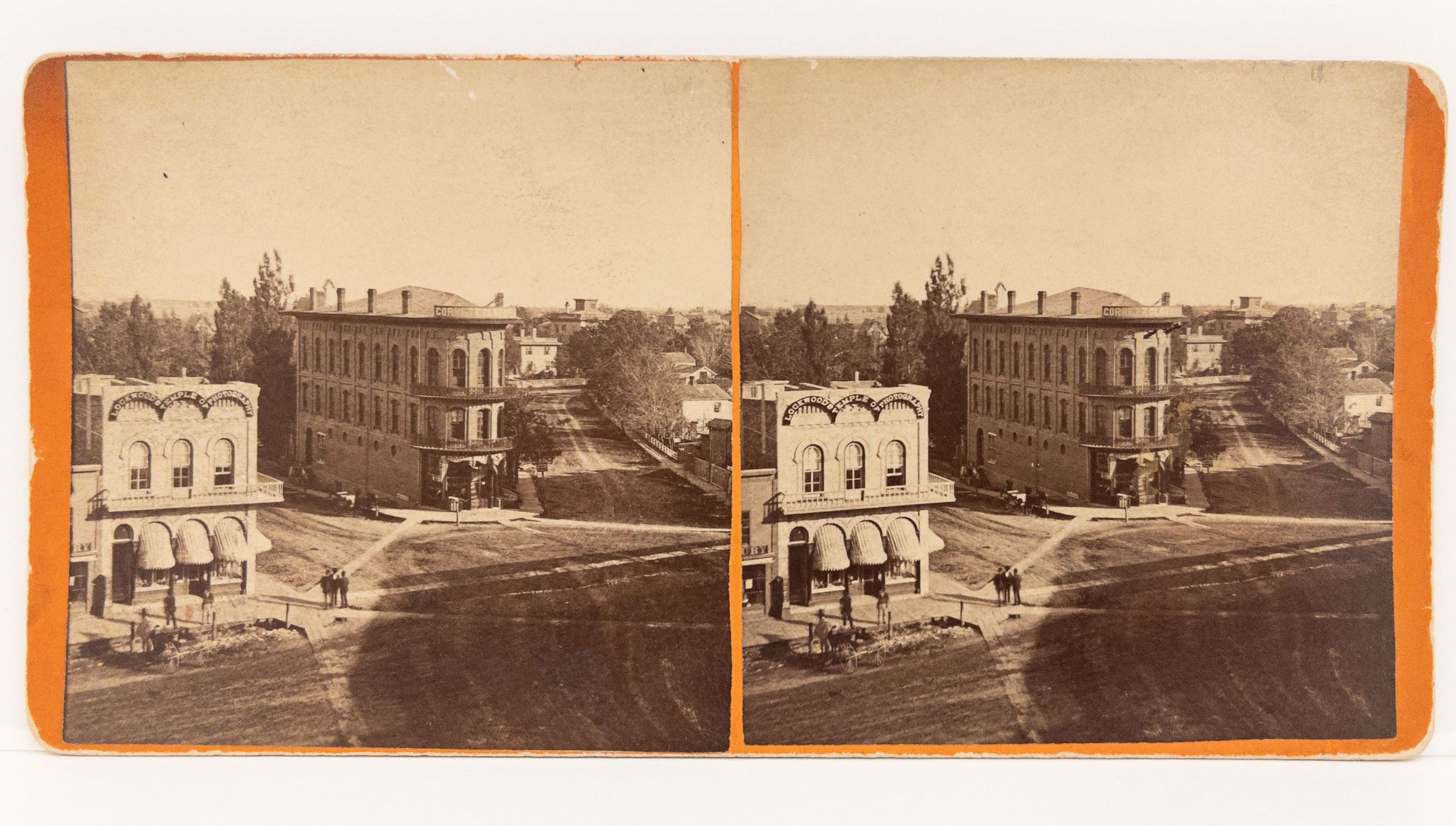 Stereograph 3.5 x 7 of Sumner Block and Greenways c. 1870s. Looking east from 100 block west on the Square. G. Lyman house (aka Republican House) also visible in the background. Lockwood Temple of Photography visible. Wm. Lockwood lost all negatives in 1875 building fire. Corbett's Clothing sign at top of Greenway's Block (burned down 1885). Note wood plank street crossings.
