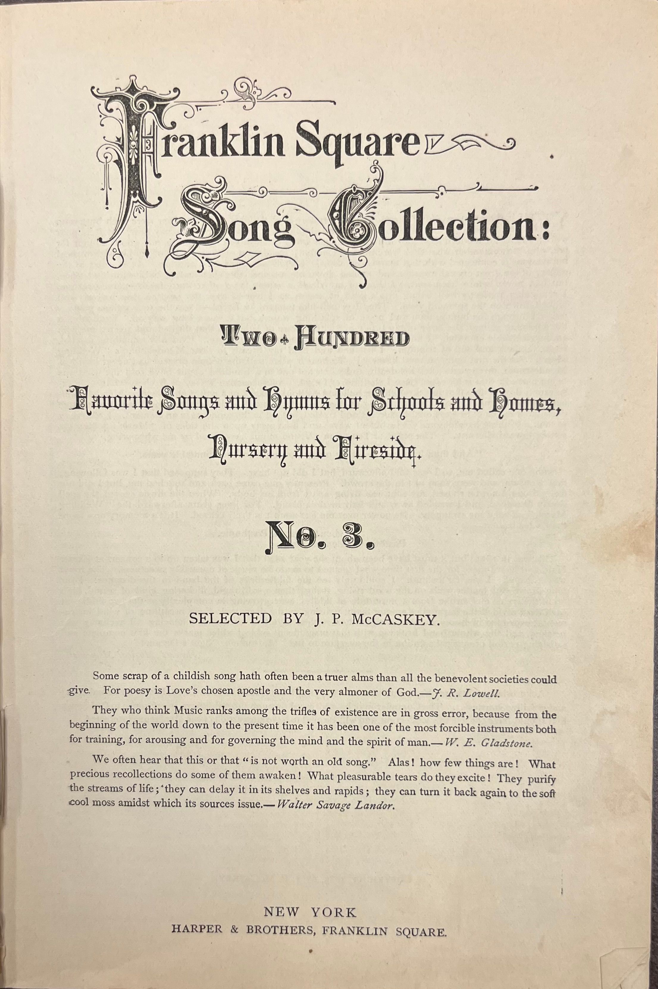 Franklin Square Song Collection: Two-hundred favorite songs and hymns for schools and homes, nursery and fireside No. 3 selected by J.P. McCaskey