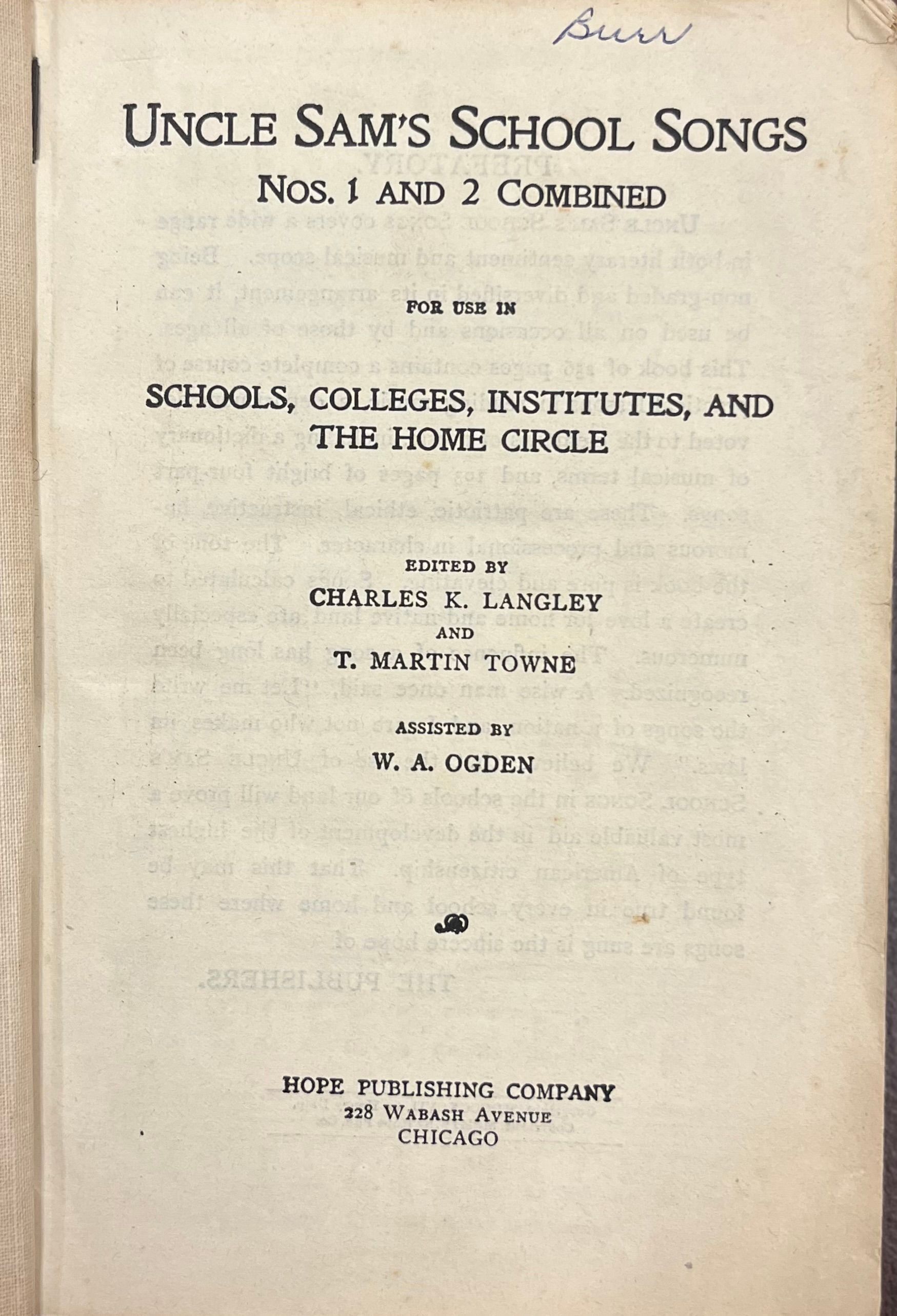 Uncle Sam's School Songs Nos. 1 and 2 Combined for use in schools, colleges, institutes and the hoe circle edited by Charles K. Langley and T. Martin Towne assisted by W.A. Odgen.