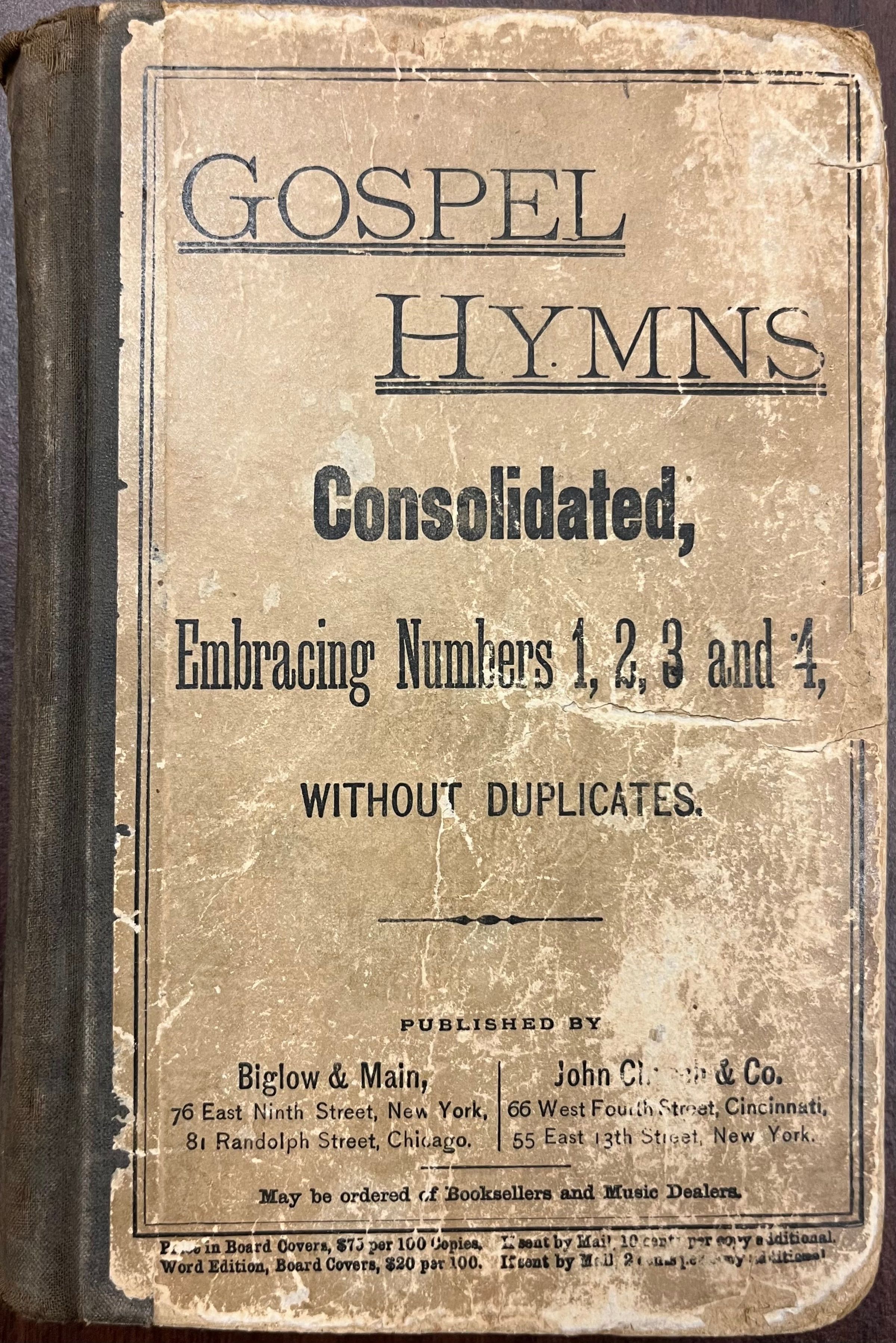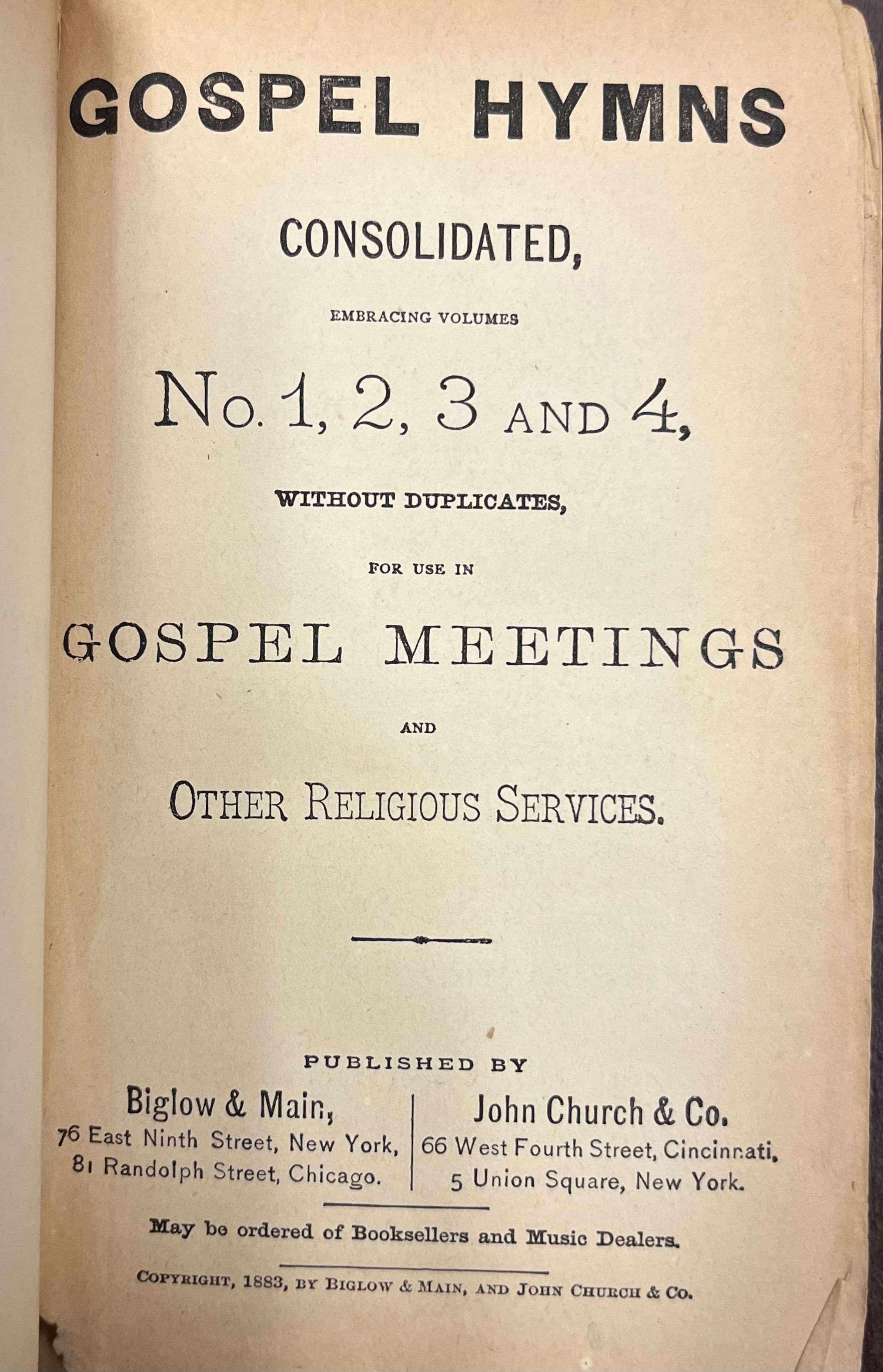 Gospel Hymns, Consolidated, Embracing numbers 1,2,3 and 4 without duplicates for use in gospel meetings and other religious servicesAcquisition