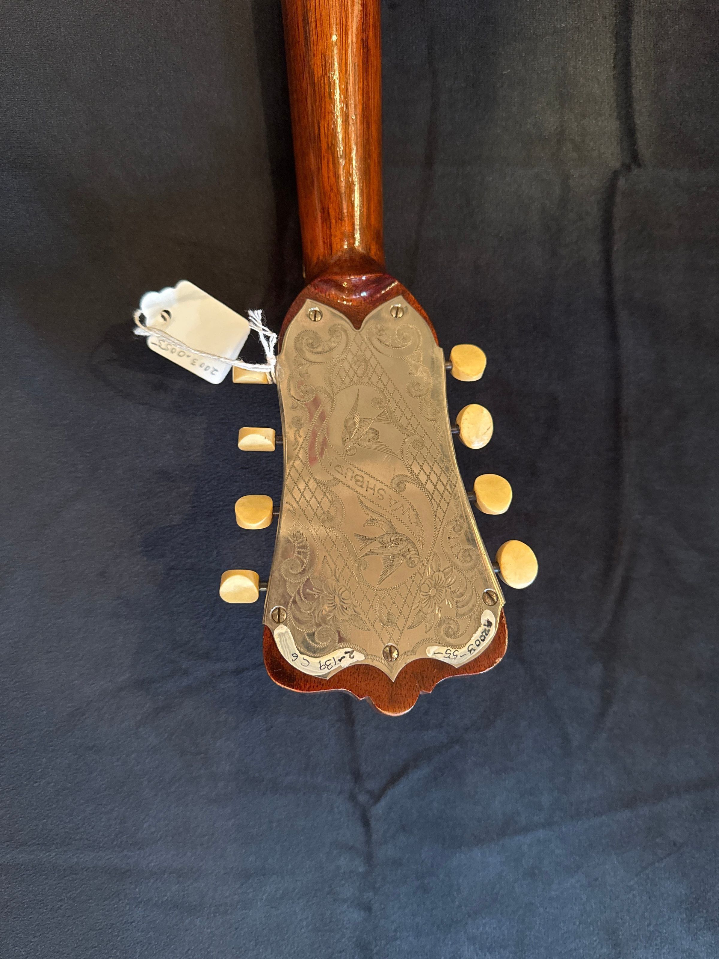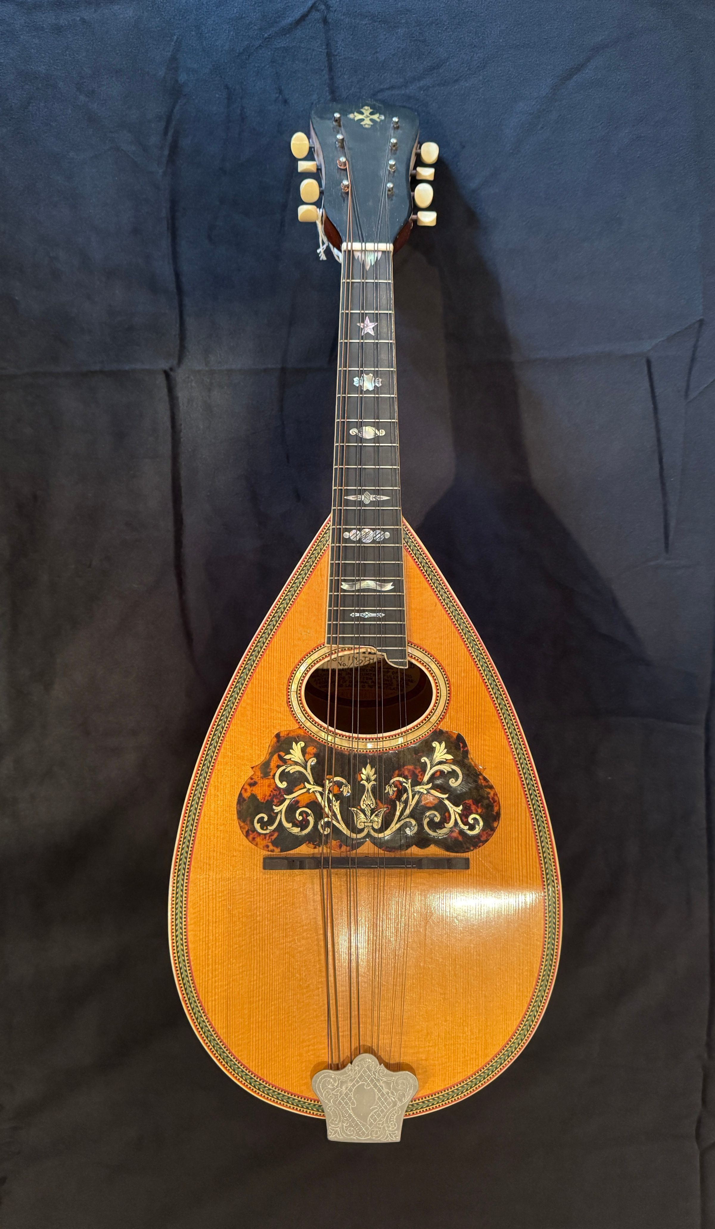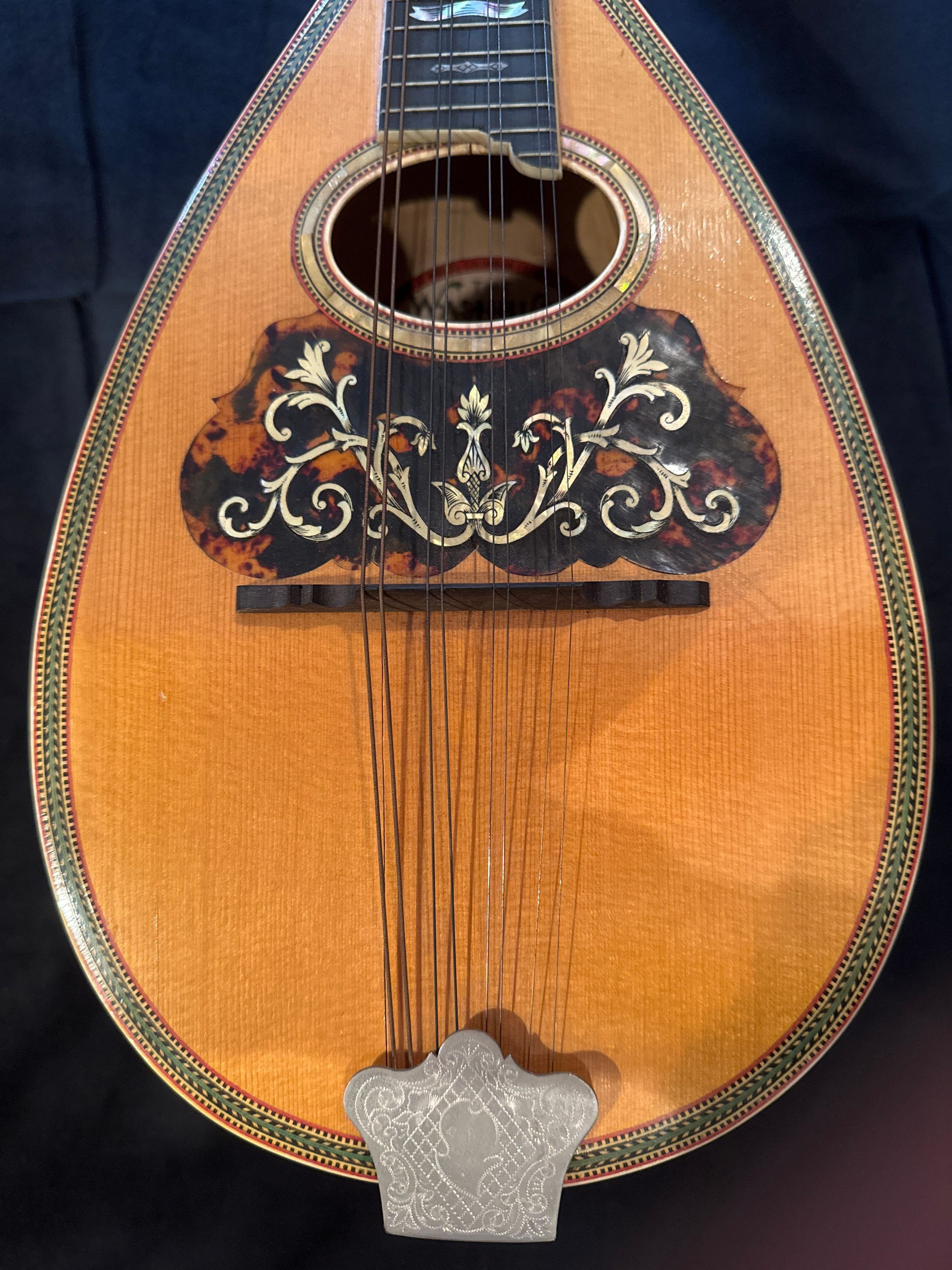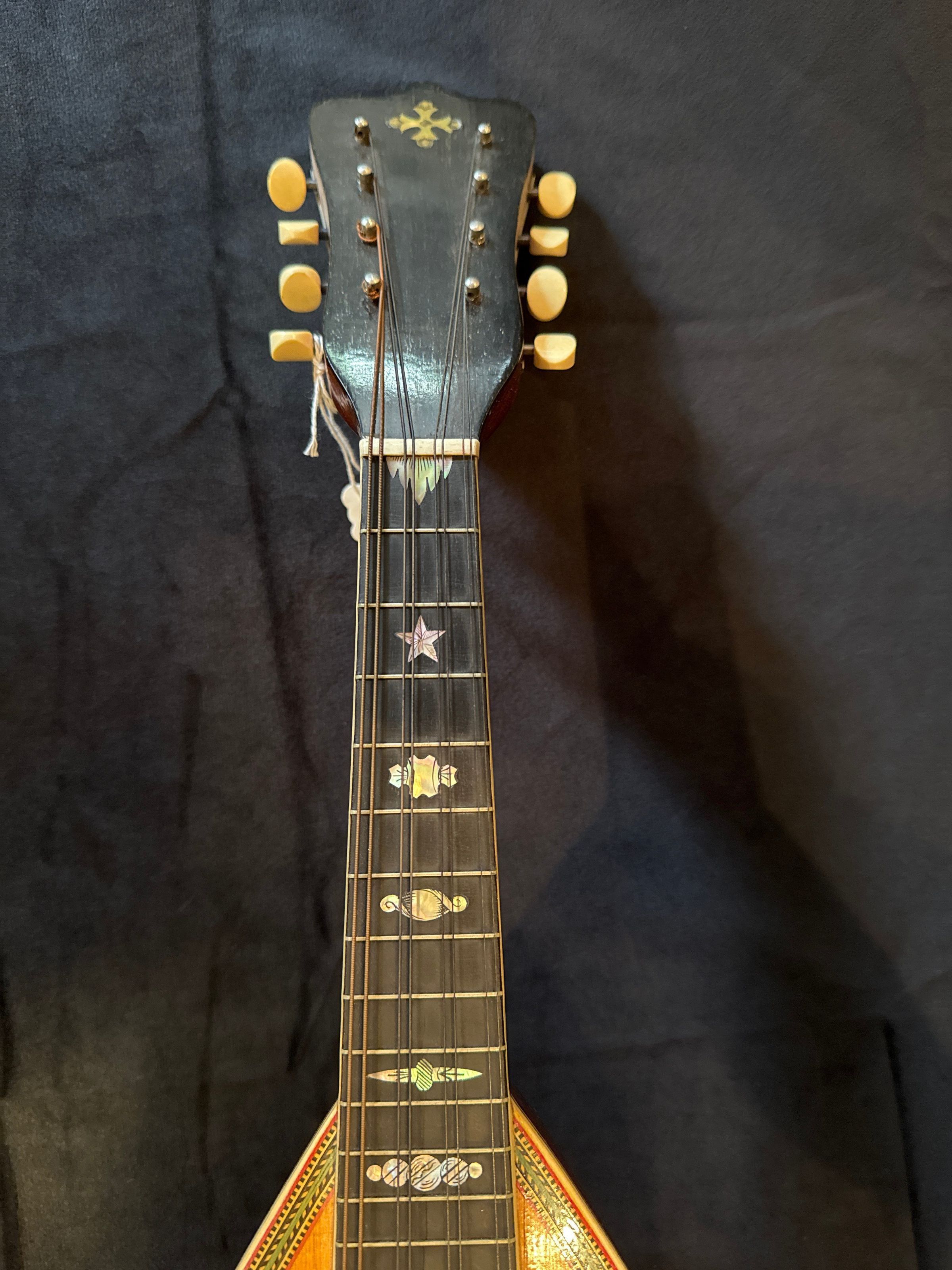 Mandolin made of wood with inlaid decoration including some tortoise shell and mother of pearl and ivory keys. Has 8 intact strings. Label visible inside says "The Washburn Best in the World" No. 19924 '" "Highest Award at World's Columbian Exposition Chicago 1893 - Gold medal and diploma of Honor Antwerp 1894." Slight wear from use but no inlay missing and finish almost like new. Probably dates to c. 1900 and used by Edgar Zobel. Also includes leather mandolin case. Handle broken, leather deteriorating but case still solid with clasps intact. In November 2010 mandolin on Pickard House piano top with case on floor below it.