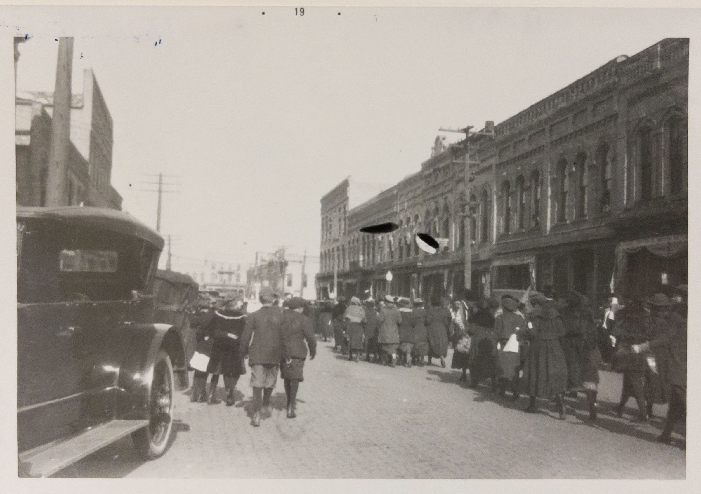 Black & white 3.5 x 5 photograph of march up 200 block of Watson. Marchers appear to be women but purpose unclear. Back says Henry Eaton.