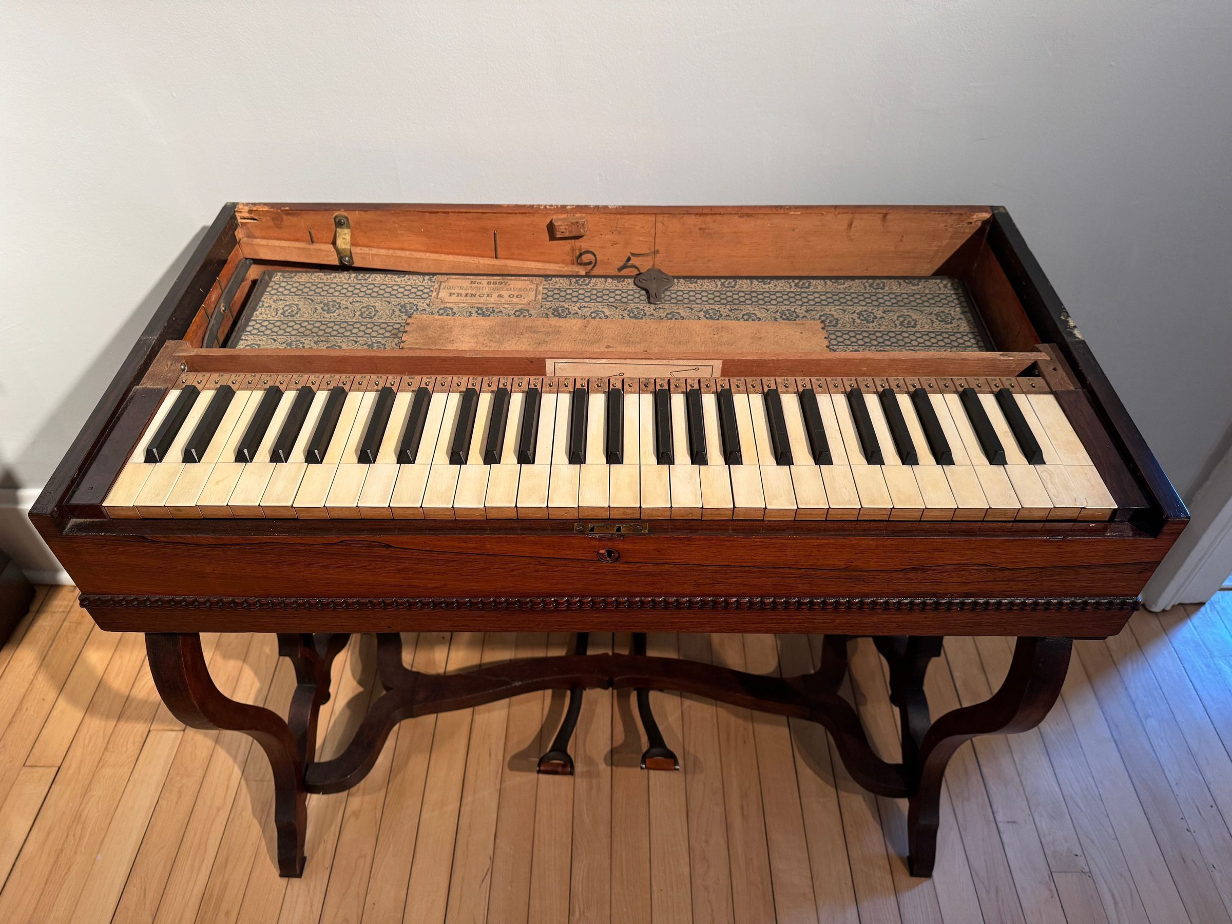 With the invention of the “improved melodeon,” the mechanism, patented by Jeremiah Carhart in 1846, became very popular in the mid-1800s. Melodeons look like small, square grand pianos with a rectangular box atop four legs.