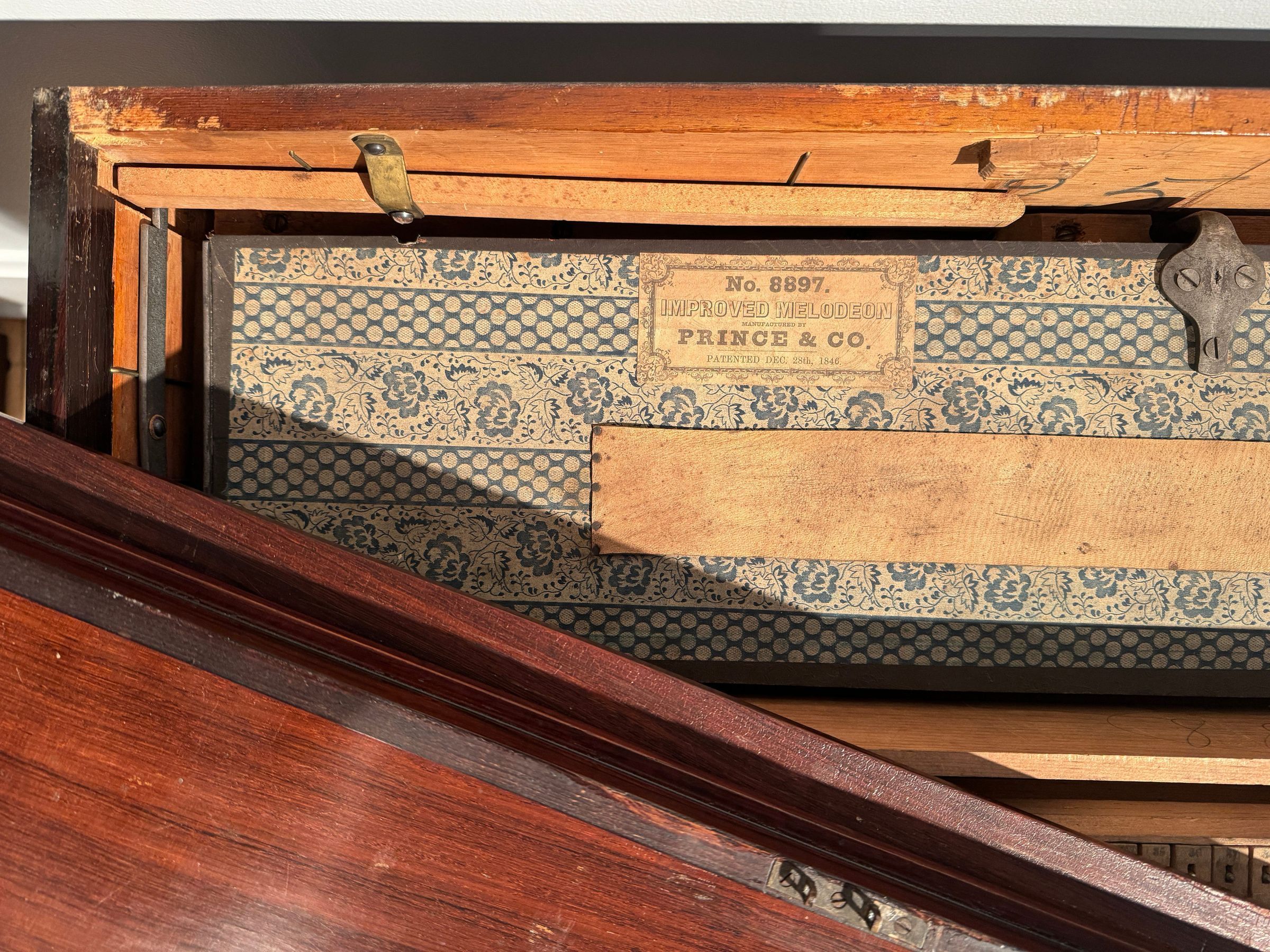 A melodeon. This is an early version of a type of reed organ. The melodeon uses suction to draw the air through metal reeds. No. 8897, Patented Dec. 26, 1846. George A. Prince & Co., Buffalo, NY.