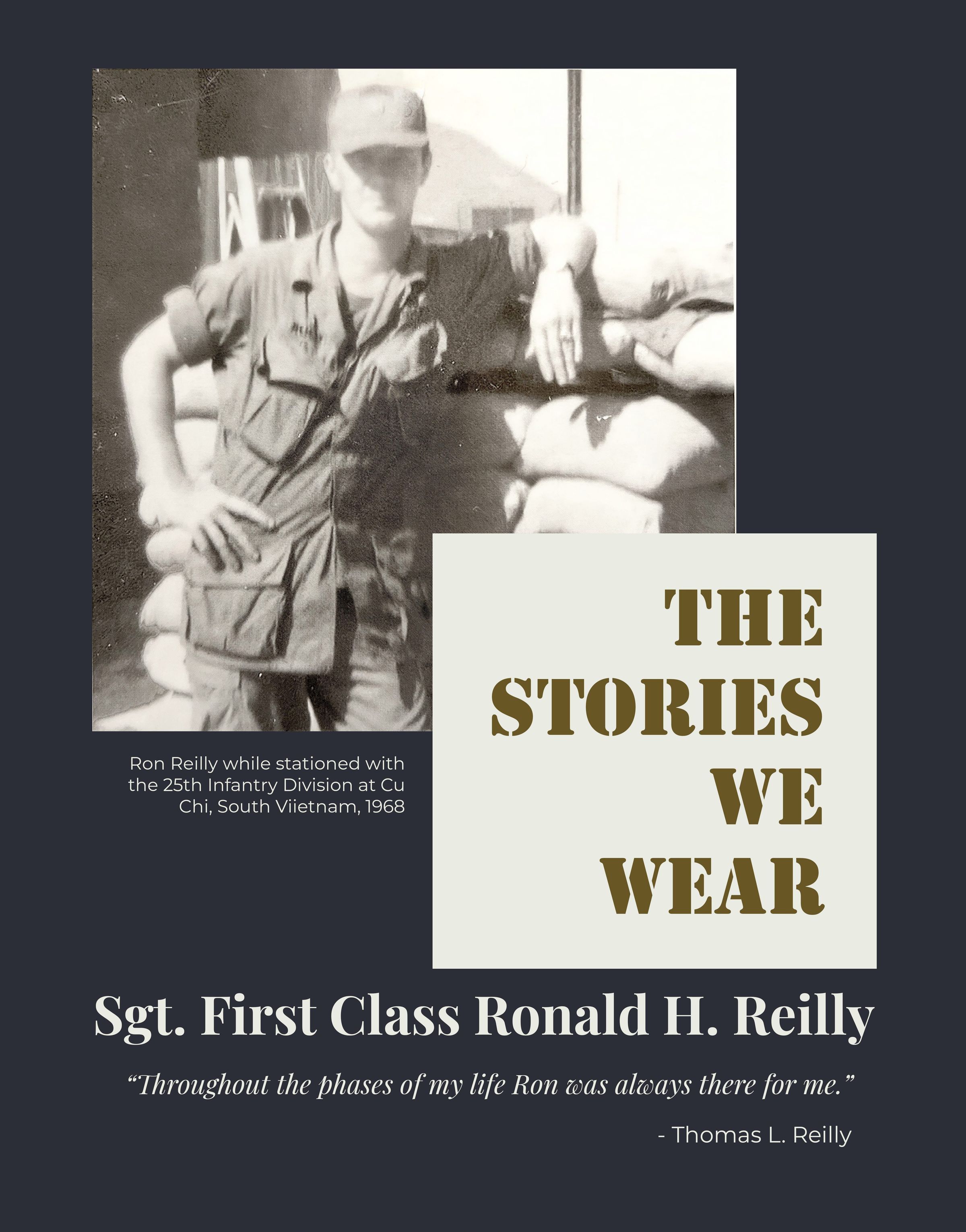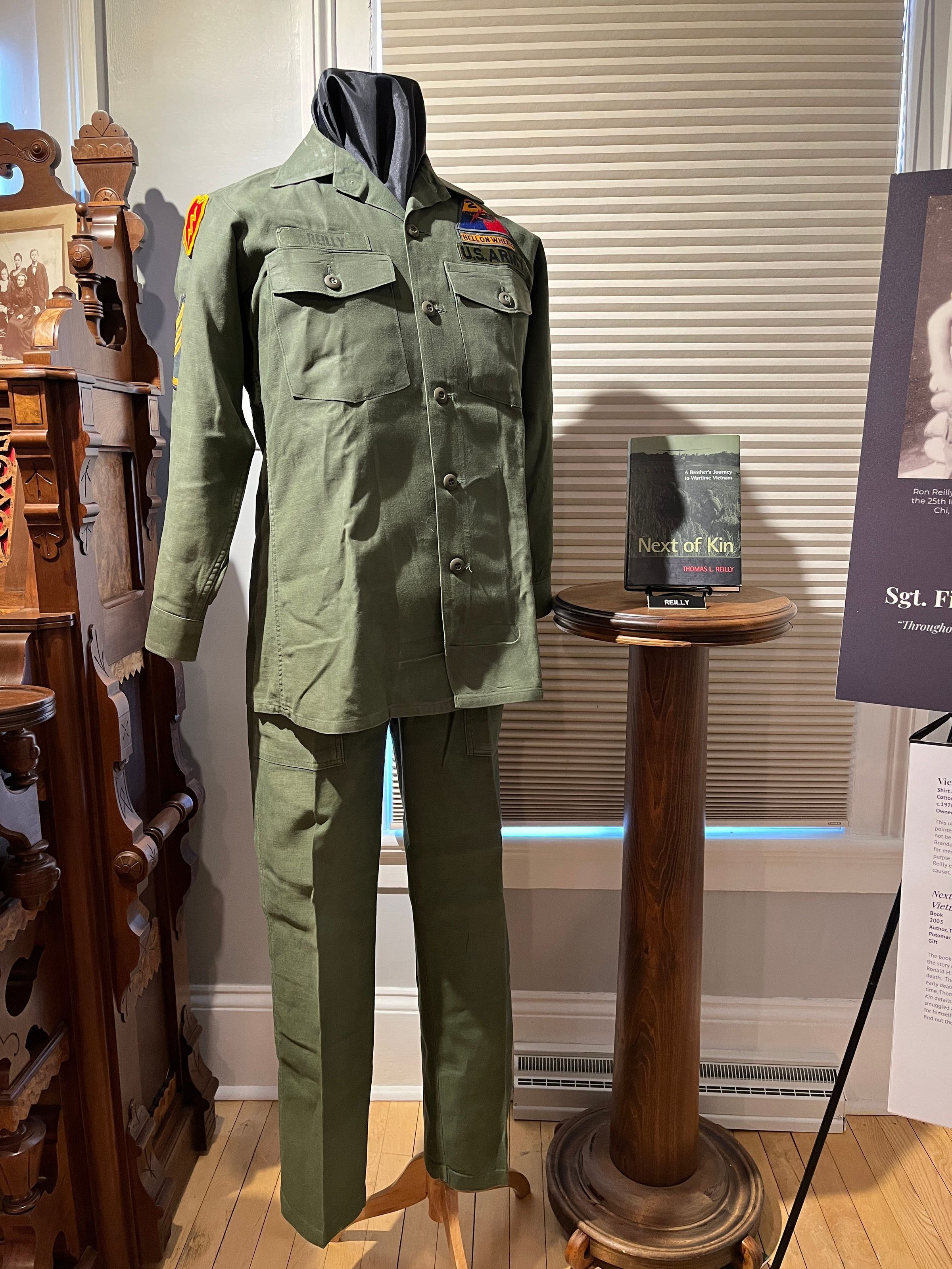 Vietnam era U.S. Army military uniform. This uniform is ‘Type III’ model, as indicated by the two shirt chest pockets with pointed pocket flaps and button cuffs at the wrist. It was traditional for the jacket to not be tucked in and to have the sleeves rolled up. The uniform belonged to former Brandon resident, Sgt. First Class Ronald H. Reilly who was a bronze star recipient for meritorious achievement against hostile forces, as well as a recipient of two purple hearts and battle ribbons issued by the South Vietnam government. Sgt. Reilly enlisted in April of 1970 and died on July 16, 1970, in Vietnam of non-hostile causes.Context