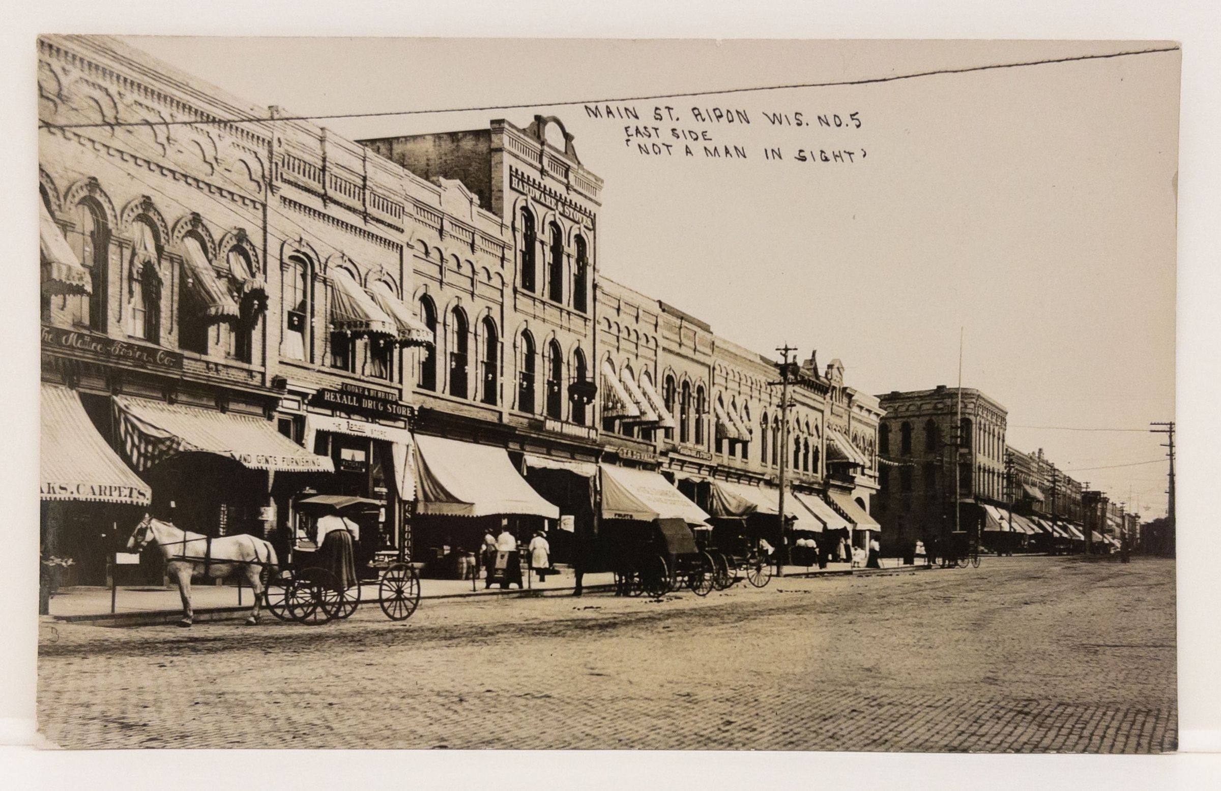 Postcard of Public Square. "Not a Man in Sight" Main St. Ripon, No. 5, east side on front of card. Businesses visible: Mattice & Foster, Cooke & Hubbard Rexall Drug Store, Ripon Hardware, Du Vall. Bricked street. Horses and carriages.