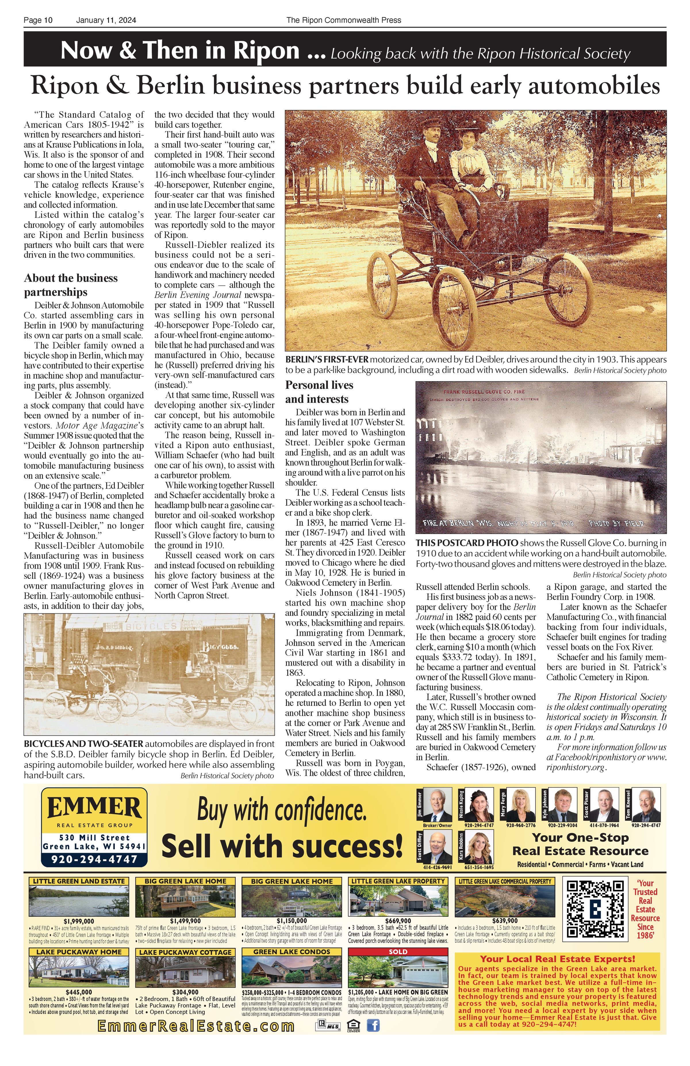 Article title: "Ripon and Berlin business partners build early automobiles," January 11, 2024, Issue 2.