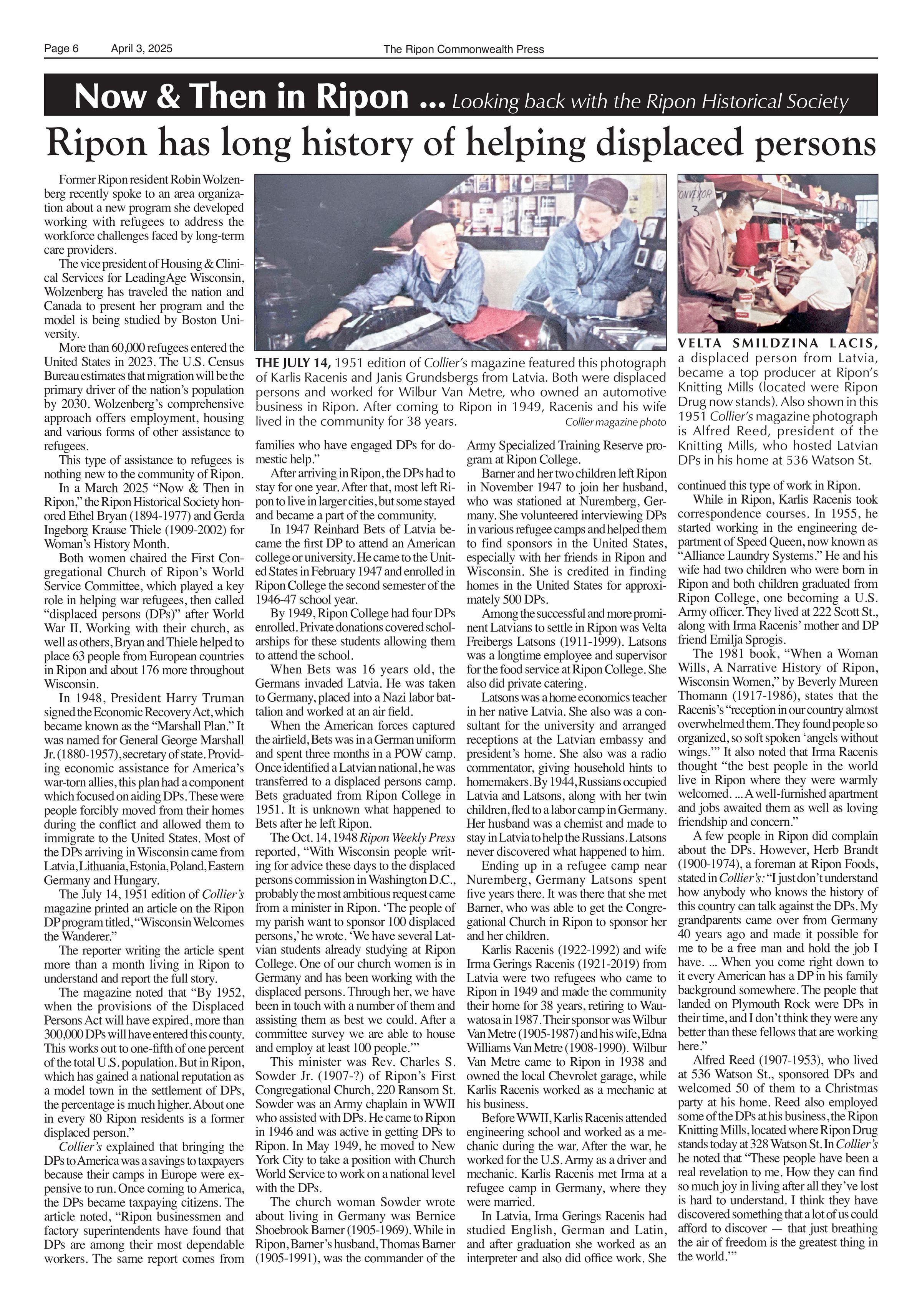 Article title: "Ripon has a long history of helping displaced persons," April 3, 2025, Issue 13.