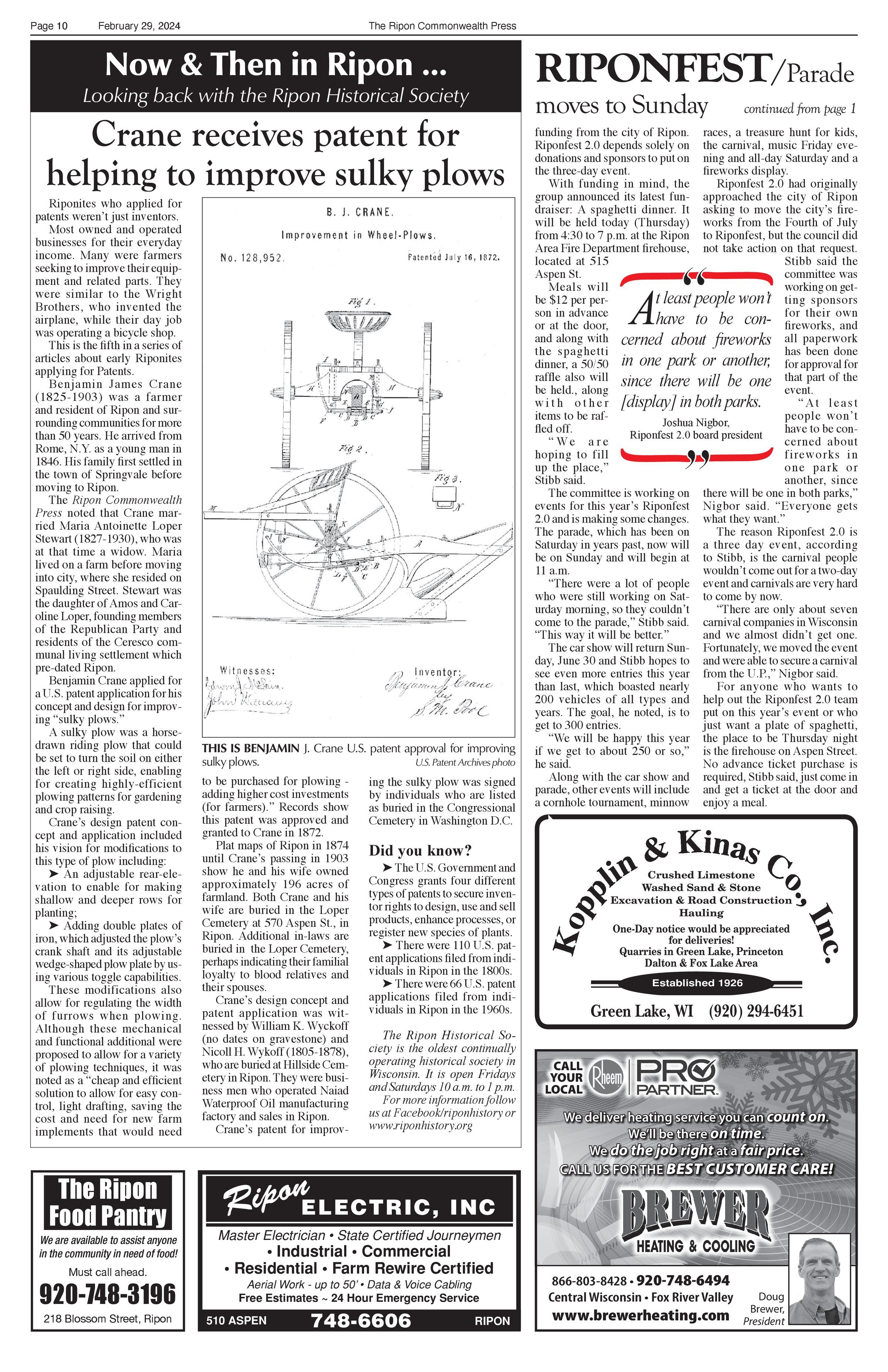 Article title: "Crane receives patent for helping to improve sulky plows," February 28, 2024, Issue 9.