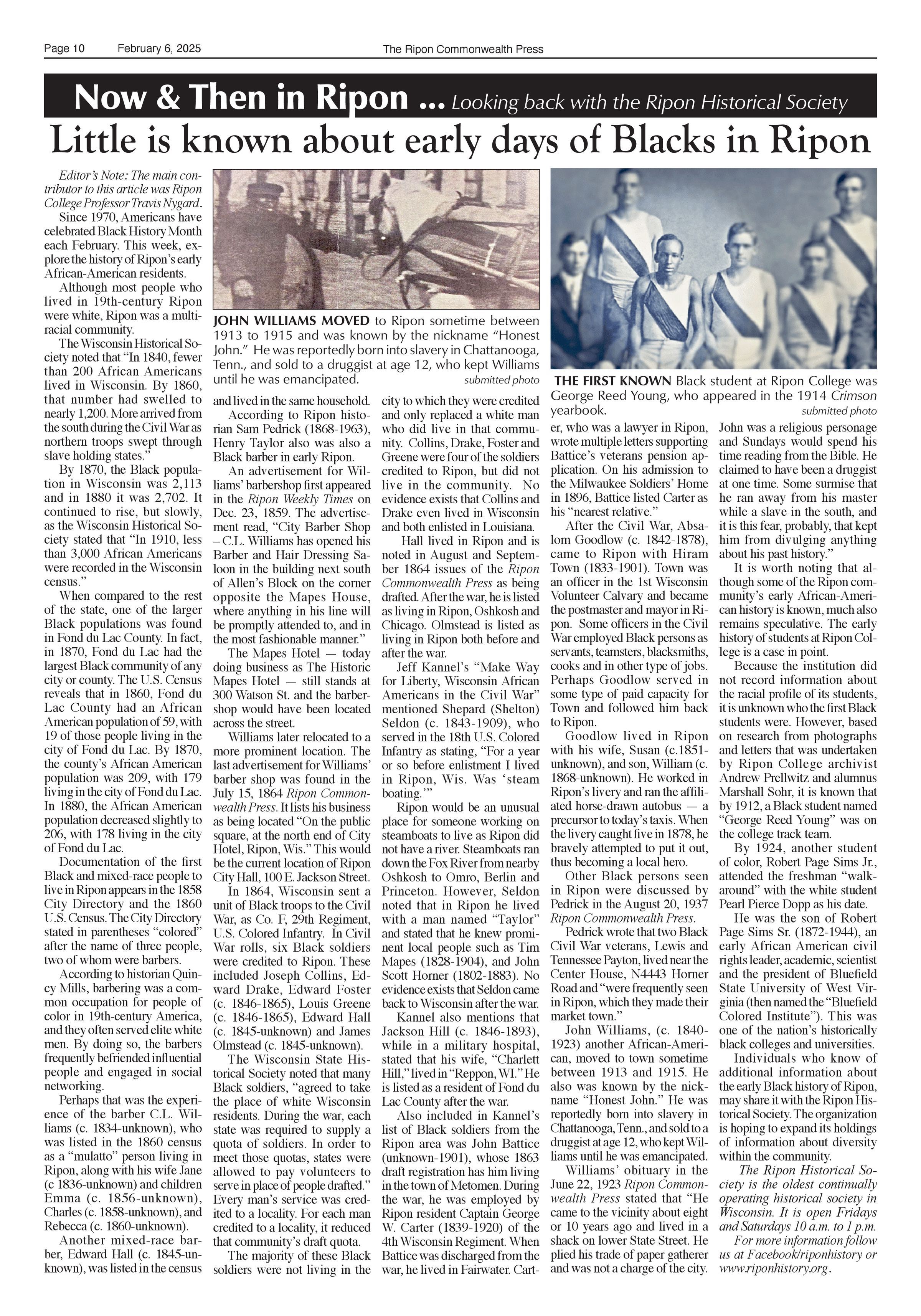 Article title: "Little is known about early days of Blacks in Ripon," February 6, 2025, Issue 6.