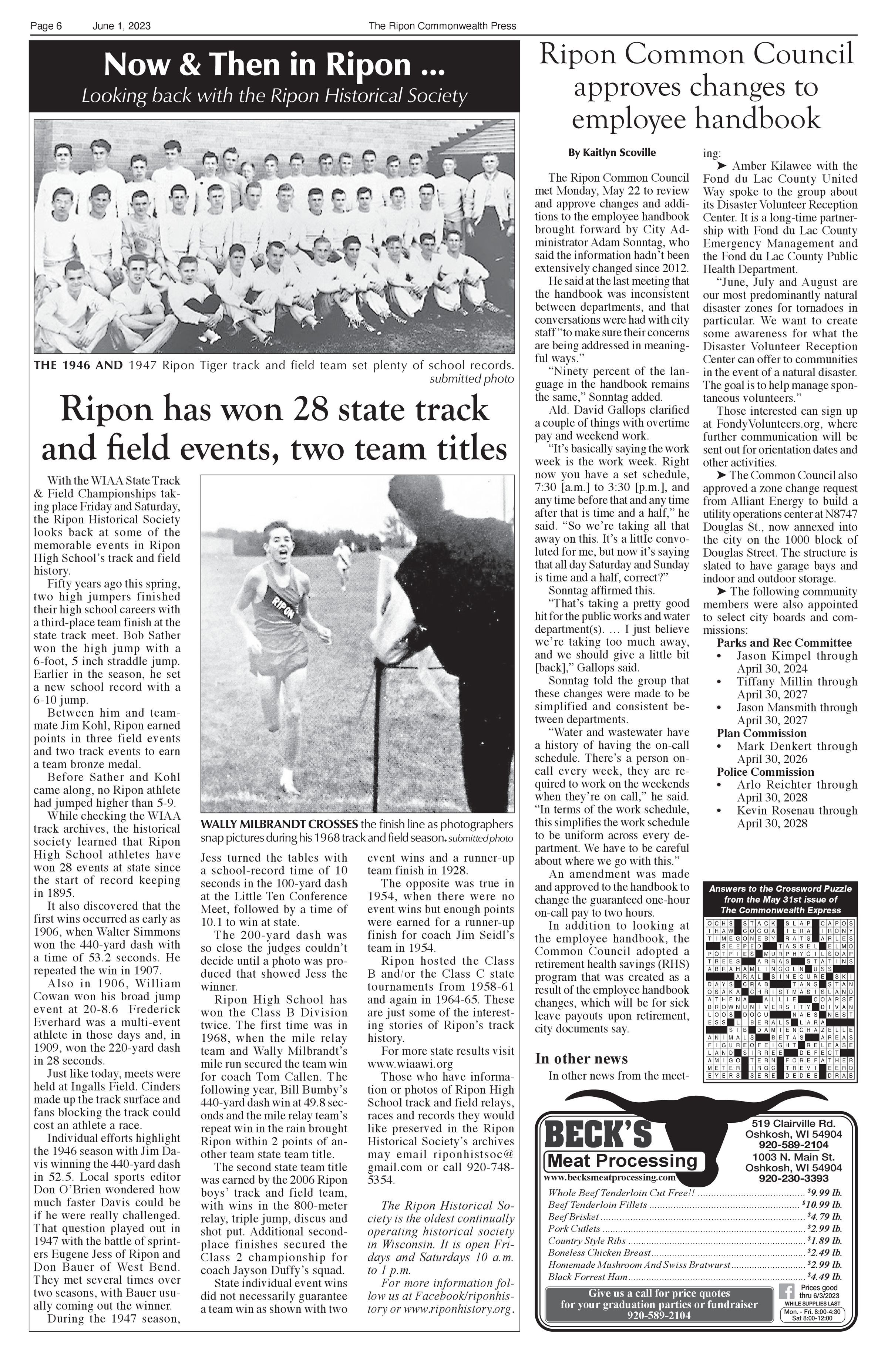 Article title: "Ripon has won 28 state track and field events, two team titles," June 1, 2023, Issue 22.
