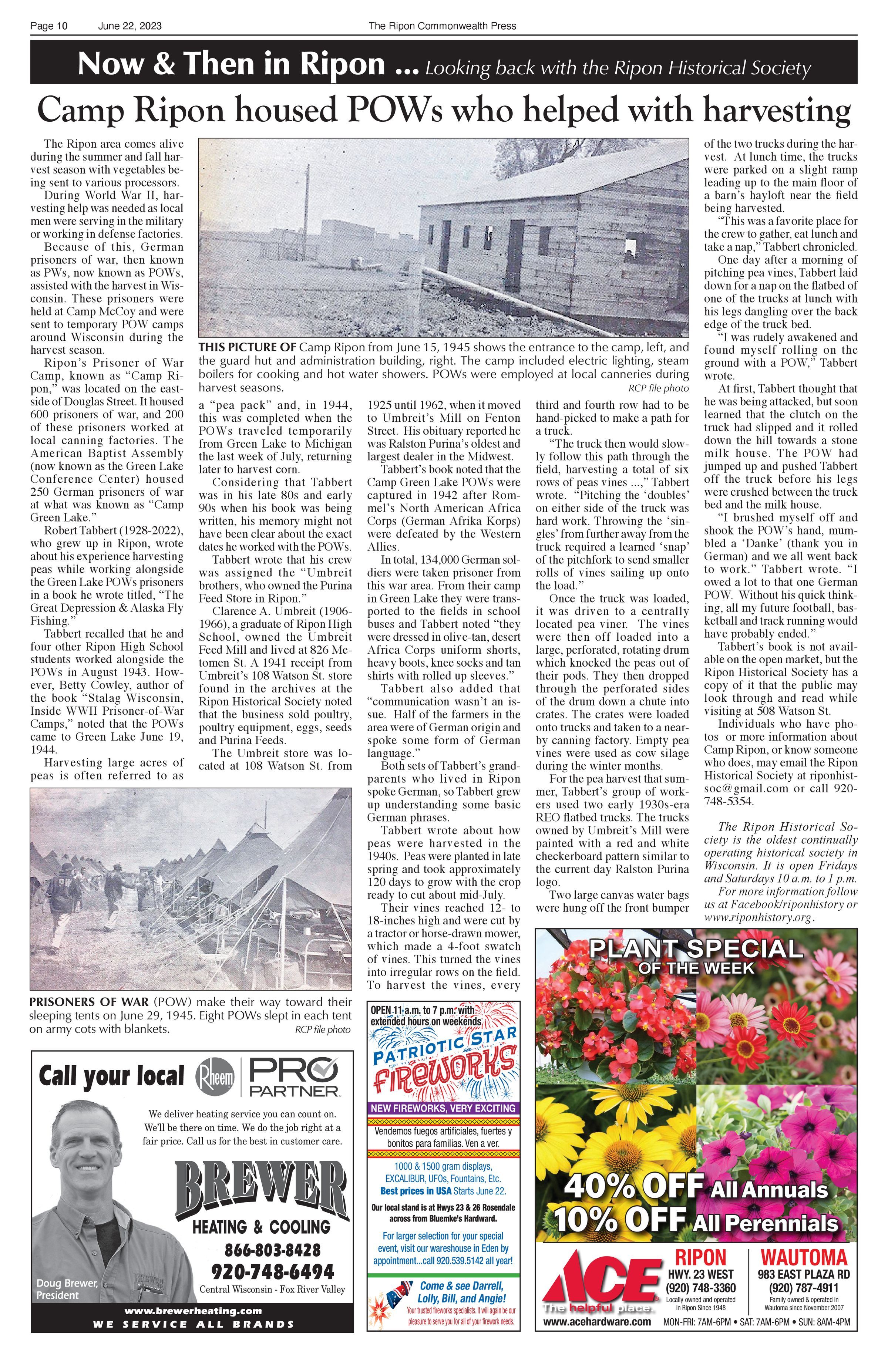 Article title: "Camp Ripon house POW's who helped with harvesting," June 22, 2023, Issue 25.