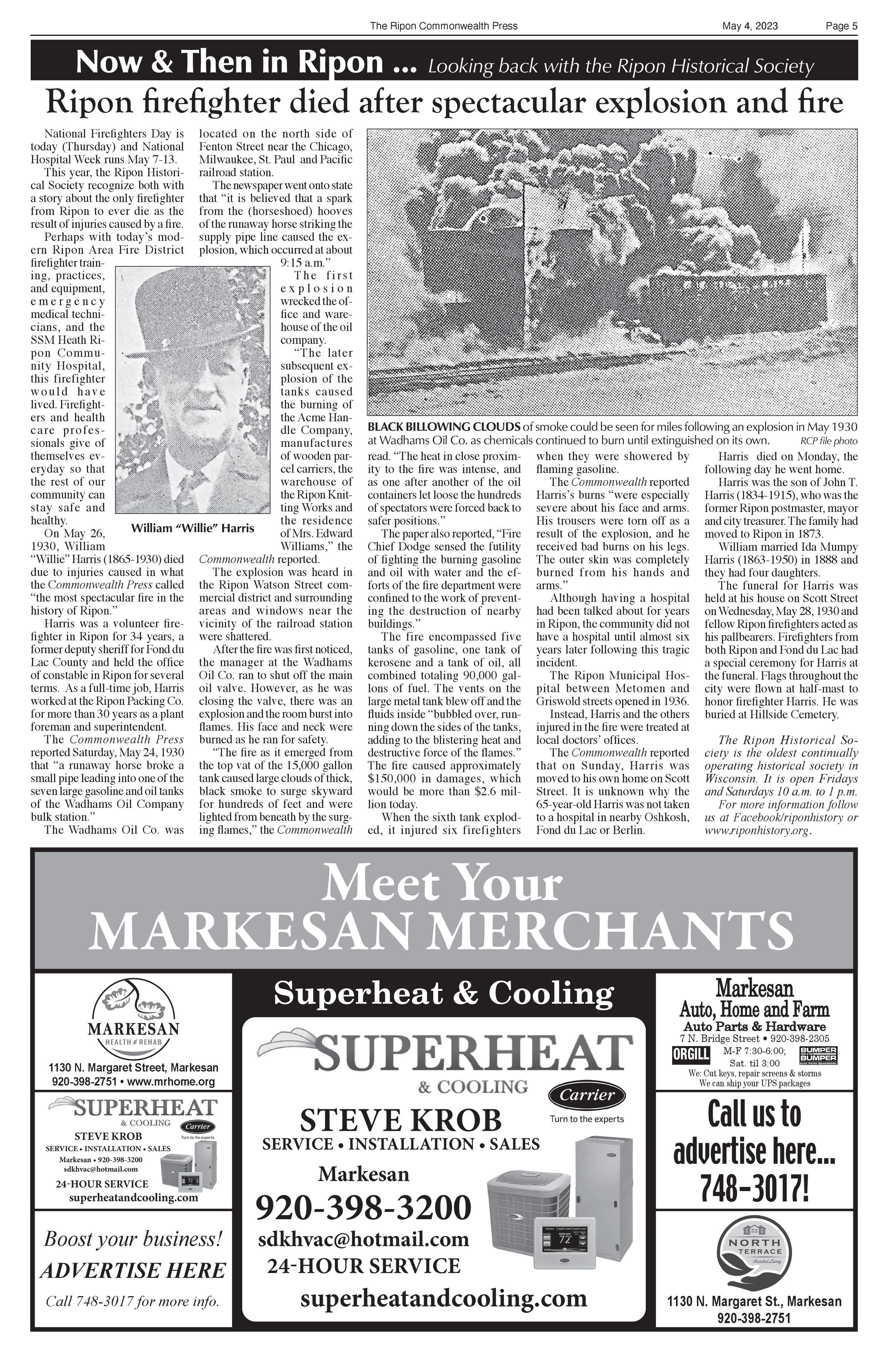 Article title: "Ripon firefighter died after spectacular explosion and fire," May 4, 2023, Issue 18.