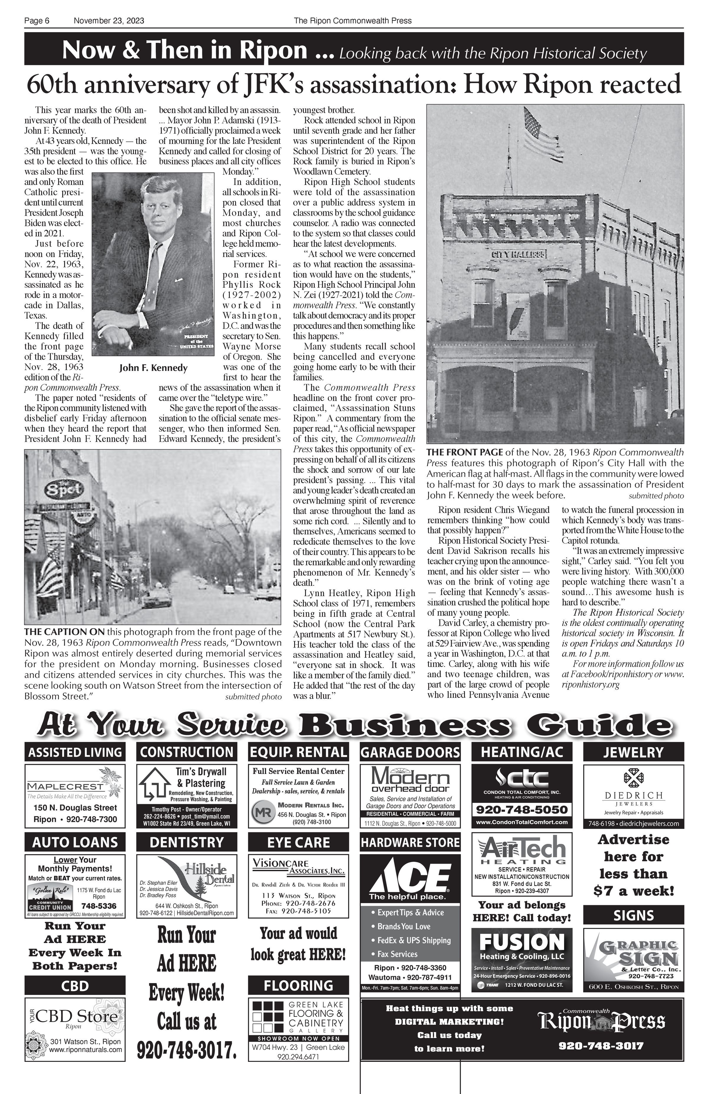 Article title: "65th anniversary of JFK's assassination: How Ripon reacted," November 23, 2023, Issue 47