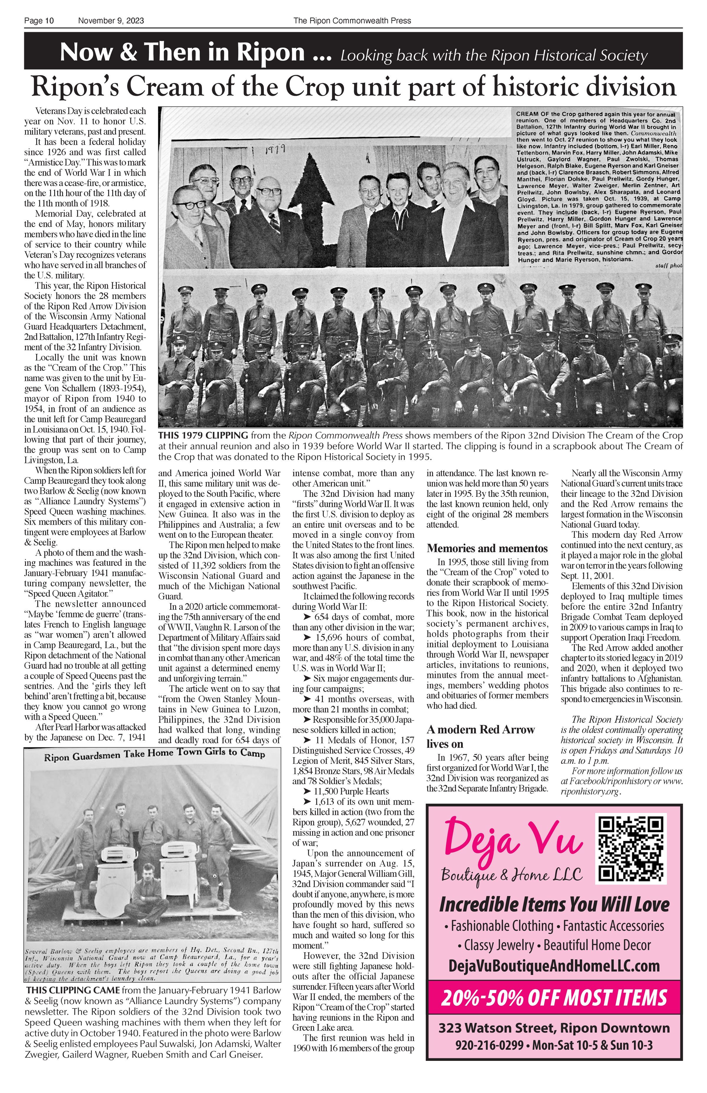 Article title: "Ripon's Cream of the Crop unit part of historic division," November 9, 2023, Issue 45.