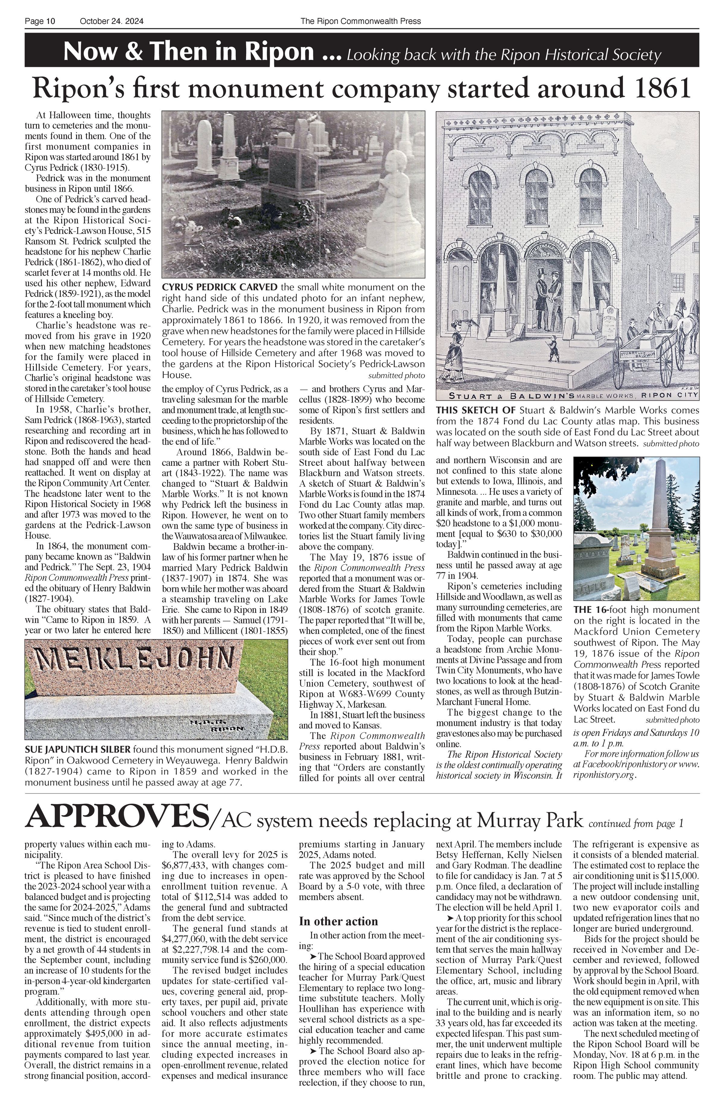 Article title, "Ripon's first monument company started around 1861." October 24, 2024