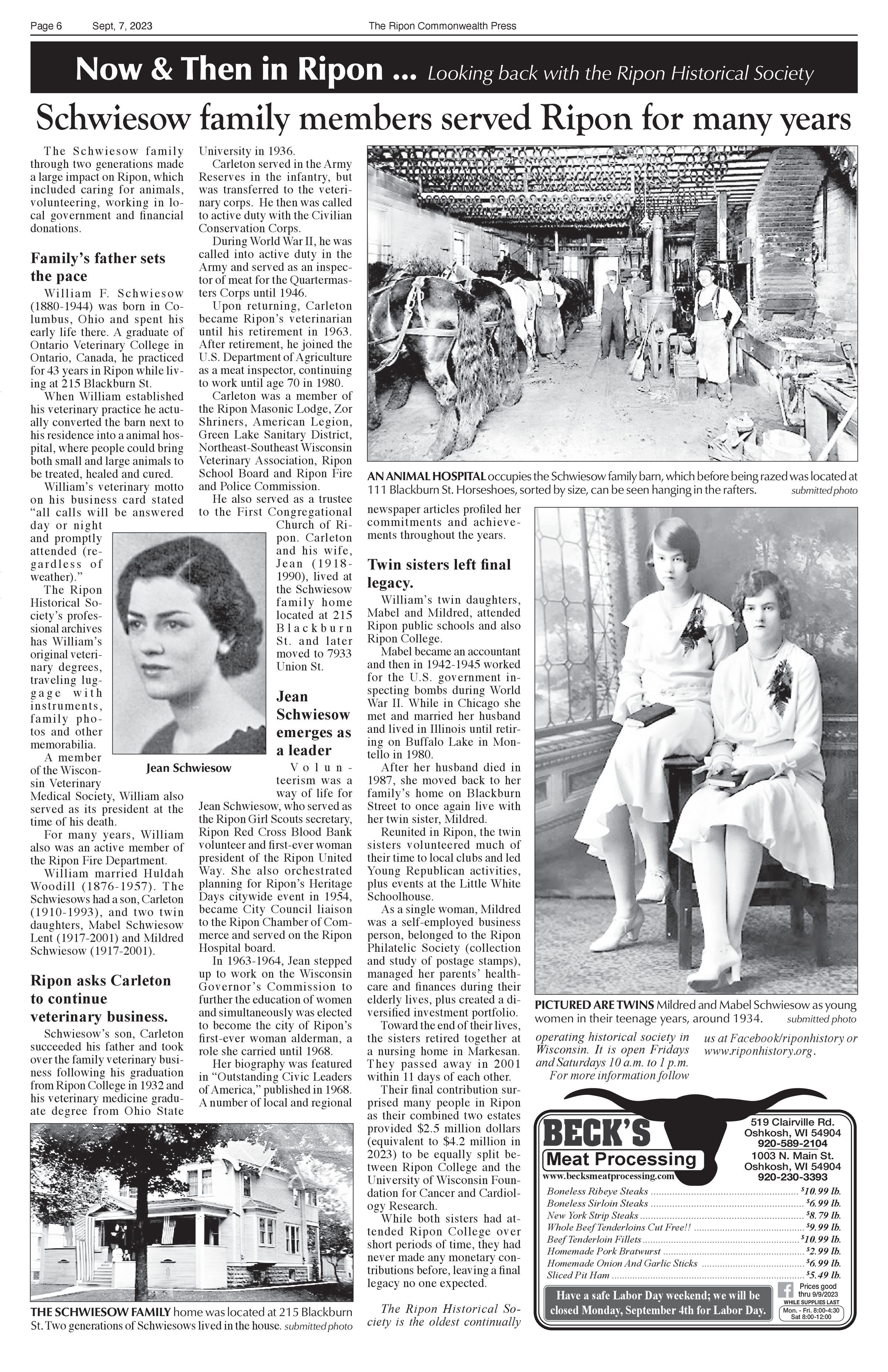 Article title: "Schwiesow family served Ripon for many years," September 7, 2023, Issue 36.