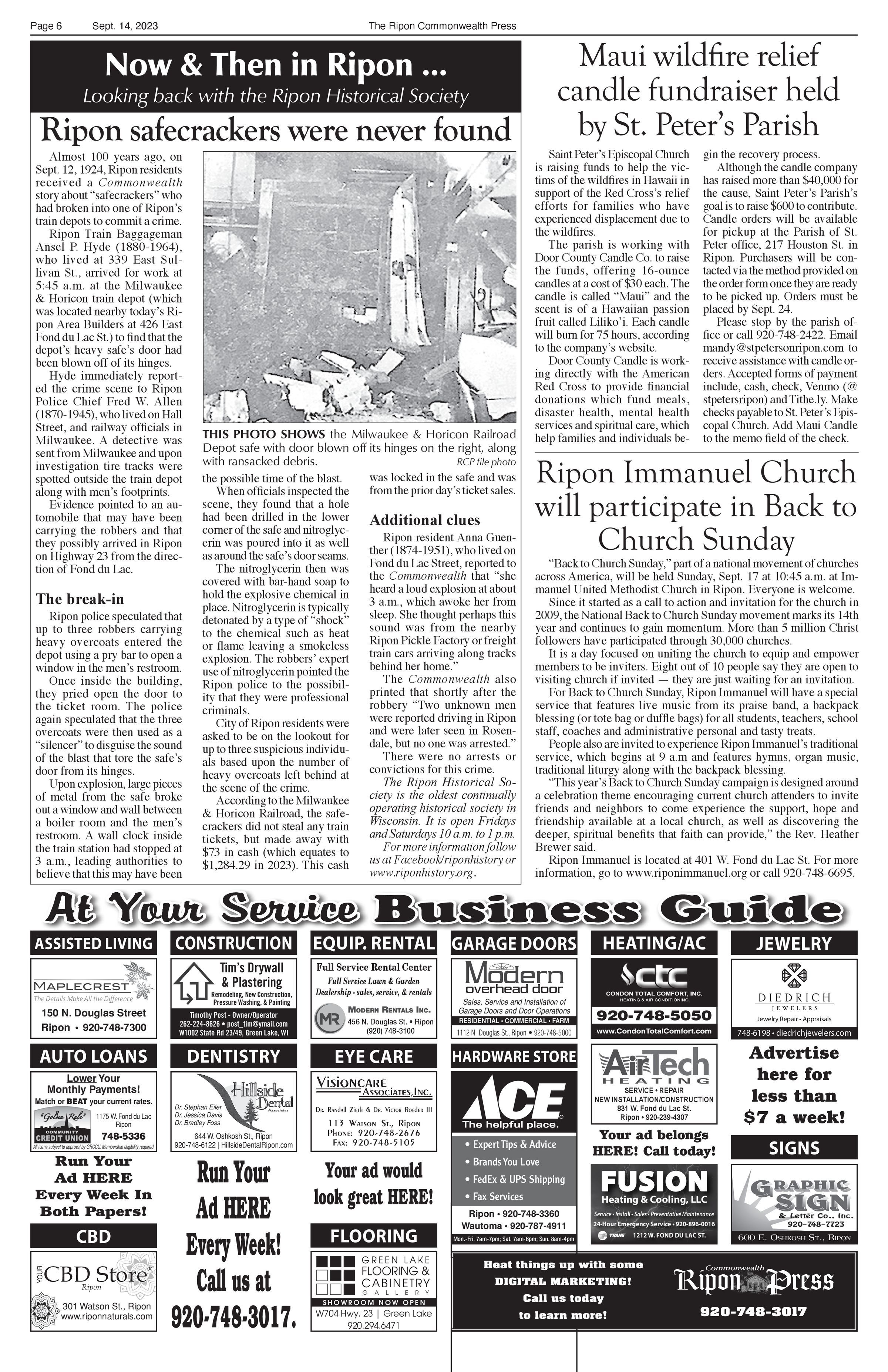Article title: "Ripon safe crackers were never found," September 14, 2023, Issue 37.