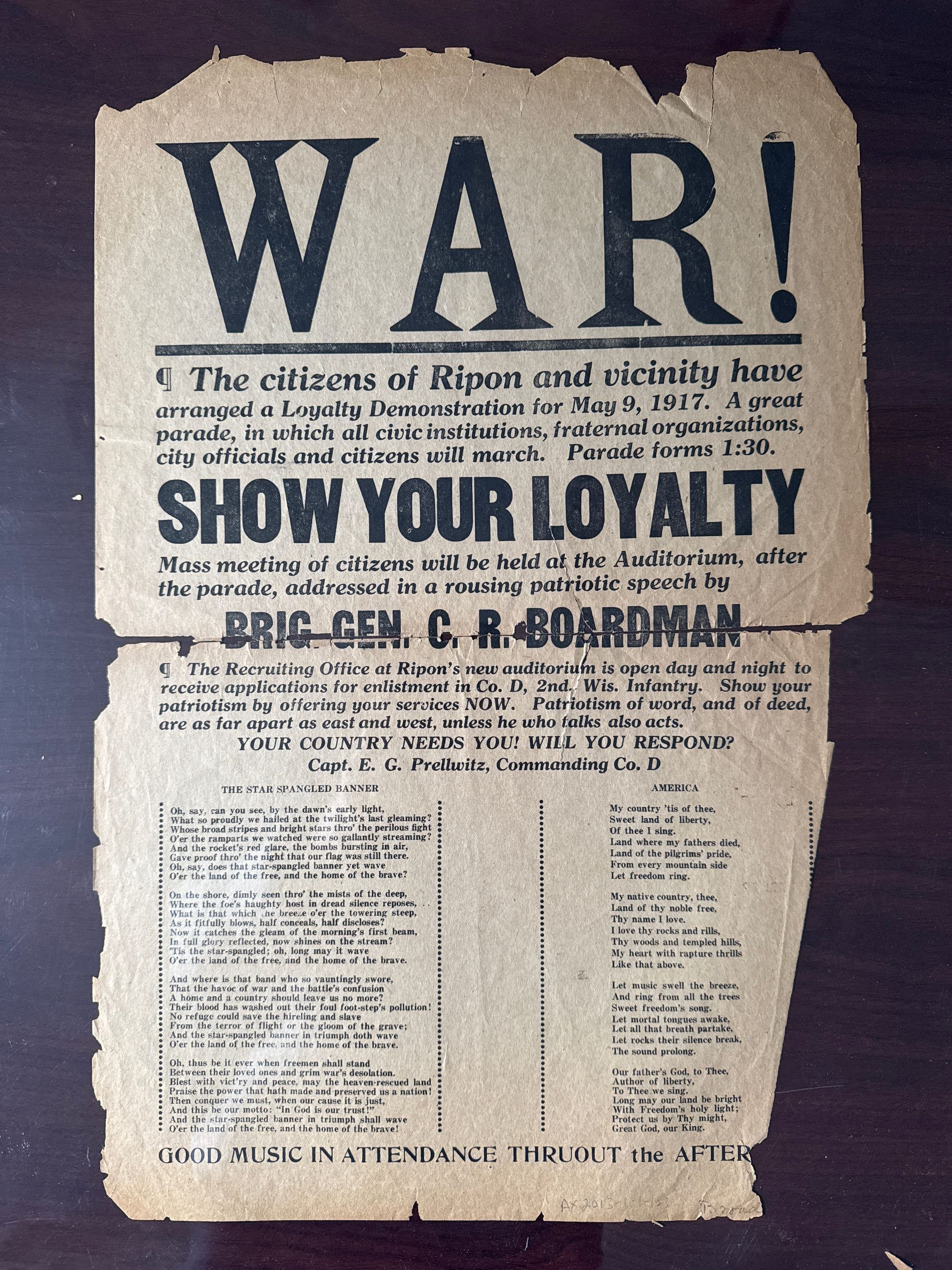 Newsprint poster advertising a loyalty demonstration and enlistment drive in to Co. D, 2nd Wisc. Infantry for World War I. Event date May 9, 1917.