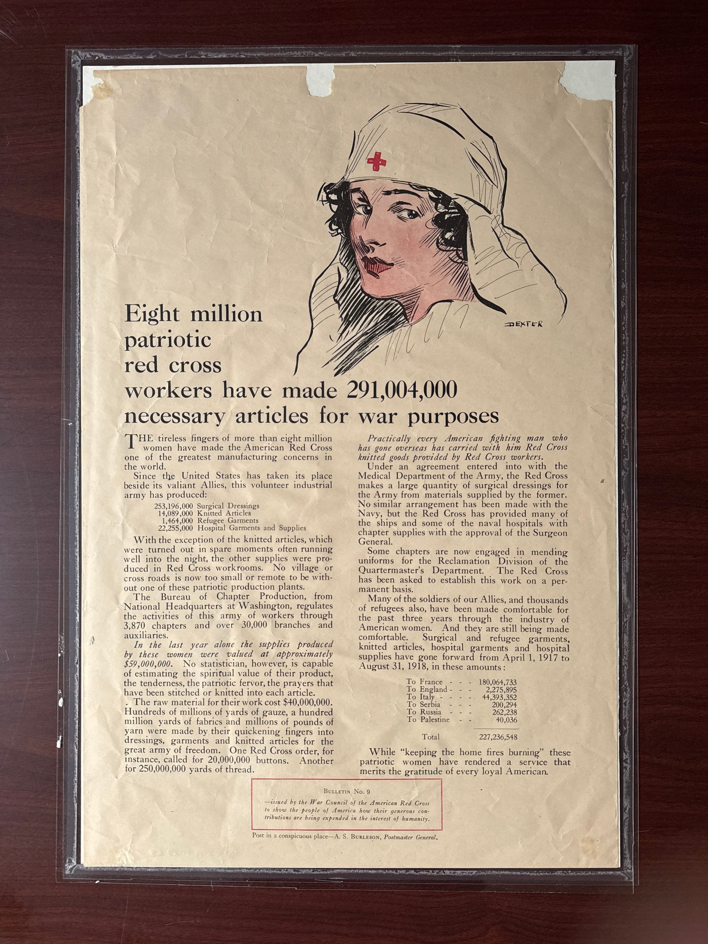 21" x 14" paper World War 1 poster, yellowed probably white with black printing. Red cross and pink face on head of Red Cross woman worker. Informational printing on the work of more than 8 million women making dressings, knitted articles, refugee garments, hospital garments and supplies for the WWI efforts by civilians in the U.S. The information covers the period from April 1917 to August 31, 1918. It is Bulletin No. 9 issued by the War Council of the American Red Cross. To be posted "in a conspicuous place" by order of the Postmaster General. Intact and legible except for 3 torn off pieces of top edge apparently from posting.Collection