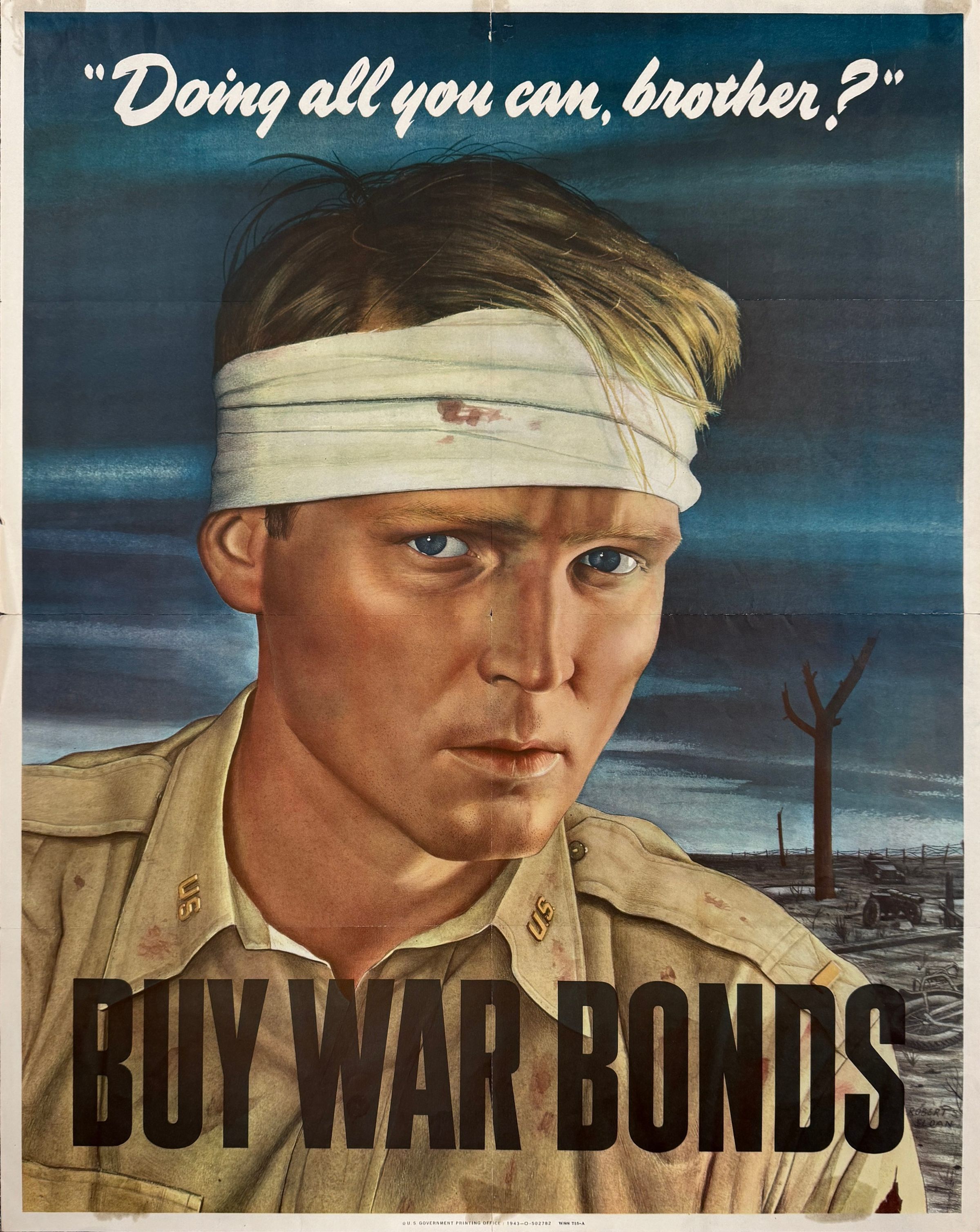 22" x 28" World War 2 poster on white paper with picture in color of head bandaged U.S. soldier. Promotes buying of war bonds - Robert Sloan artist. Published by U.S. Govt. Printing Office in 1943. So during World War 2. Paper is yellowed and has 6 oil stains at top and bottom where putty-like substance was used for displaying. Folds into 4 sections horizontally and 2 sections vertically for mailing. Torn for about one inch down from top on fold. Picture intact.
