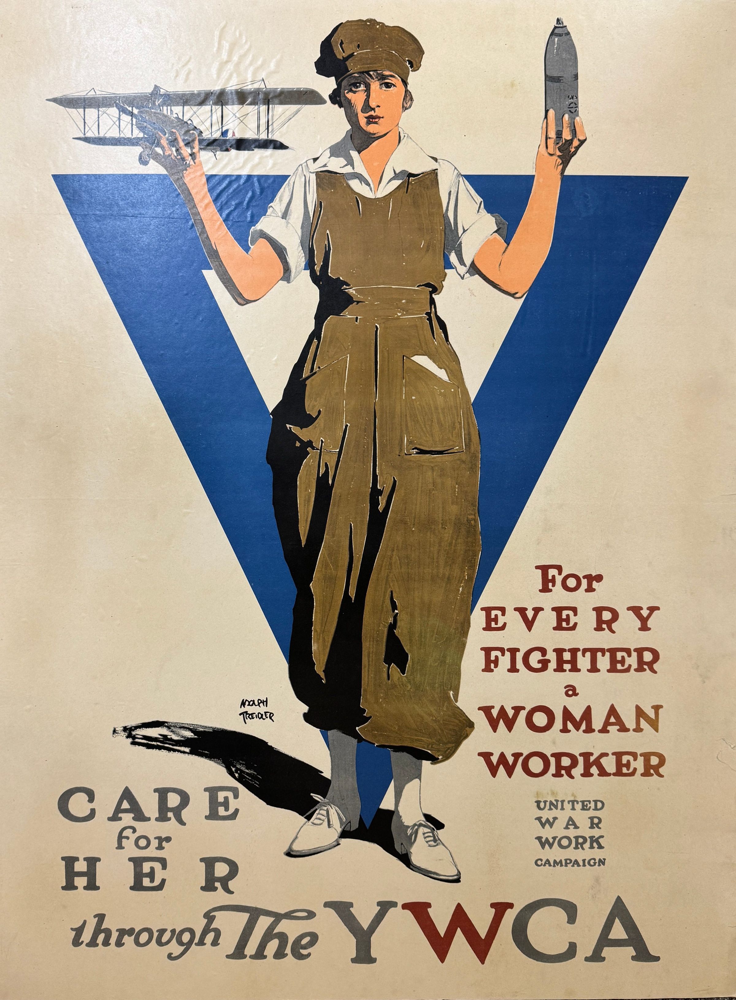 30" x 40" WWI poster mounted on paper board. Picture of woman in colors wearing coveralls with airplane and torpedo in hands. Painted by Ralph Treidler says "For every fighter a woman worker" "Care for her through the YWCA." From WWI and the United War Work Campaign. Could date from 1917 or 1918. Soiled, some bubbles in poster in upper left area caused by mounting. Intact and legible.Collection