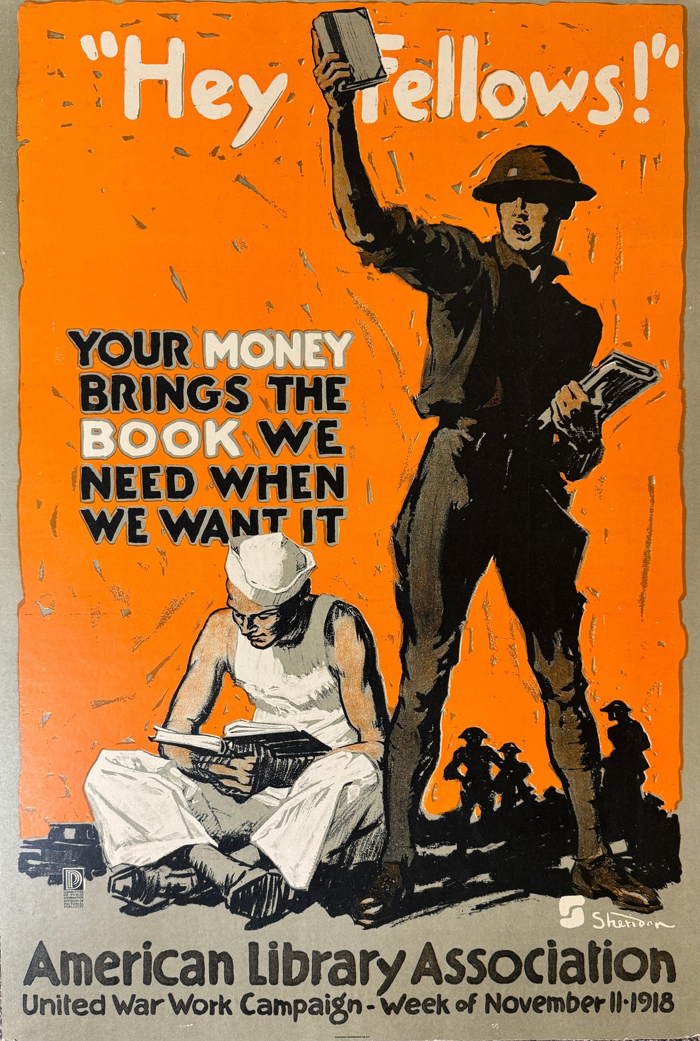 20" x 30" WWI poster starting "Hey Fellows" mounted on heavy cardboard. Promotes the American Library Association's participation in the United War Work campaign the week of Nov 11, 1918. Shows a soldier and sailor with books. Worn on edges, slightly soiled, does not appear faded - legible. Signed by artist, Sheridan.Collection