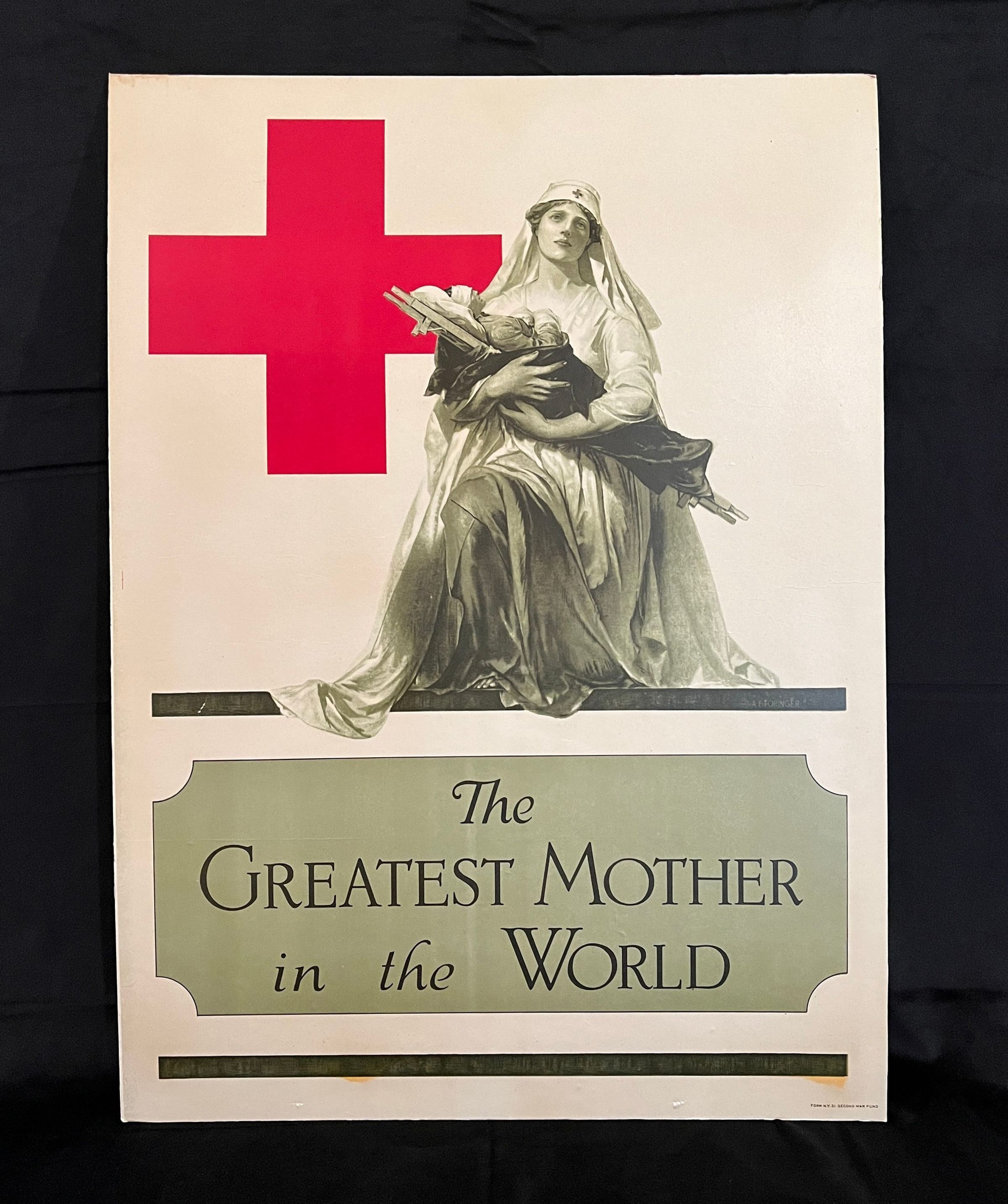 20 1/2" x 27 1/2" WW I poster mounted on heavy cardboard. White background yellowed with age and soiled. Has large Red Cross symbol in red in upper left hand corner with Red Cross nurse cradling in her arms a reduced sized wounded soldier on stretcher. Only other colors used are black and a pale grey-green. At bottom in black print says "The Greatest Mother in the World." Appears from clothing to be a WW I poster for the Red Cross. In small print in lower right corner says "Form N.Y. 31 Second War Fund."