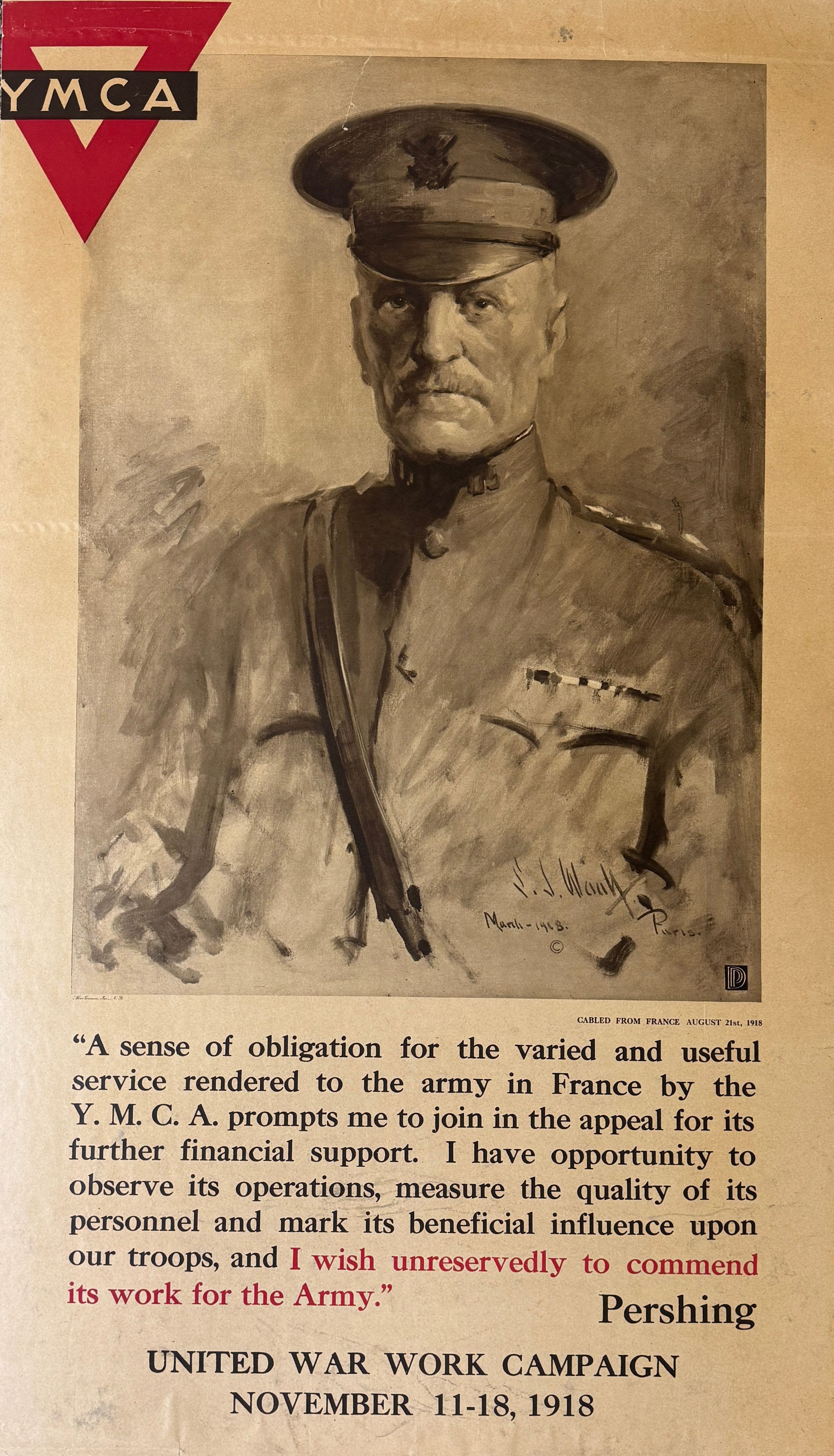 18" x 31" poster, mounted on paperboard, has black and white portrait of General Pershing and a quote from the General praising the YMCA's work. The poster was sponsored by the YMCA for the United War Work Campaign November 11 - 18, 1918. Picture soiled but intact and legible. Note: Signature of portrait painter not readable but dated March 1918 Paris.