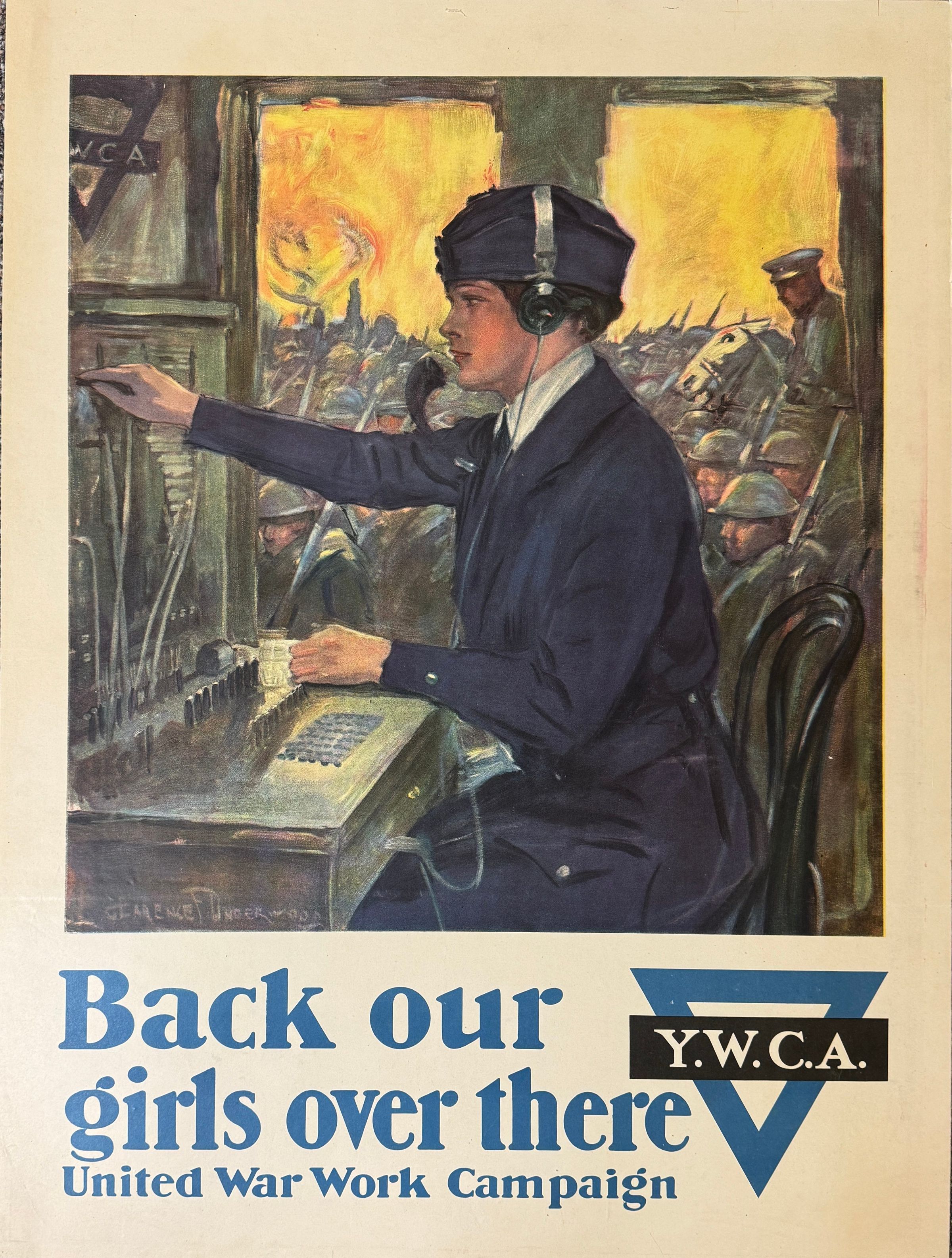 31" x 18" WWI poster mounted on paper board. Poster sponsored by the YWCA with picture of a woman in uniform at a telephone switch-board with soldier behind her. Printing says "Back our girls over there". United War Work Campaign. Cream background with colored picture and lettering. Discolored and soiled but intact and still clear. Painted by Clarence F. Underwood. Poster probably made between 1917 and Nov. 1918.