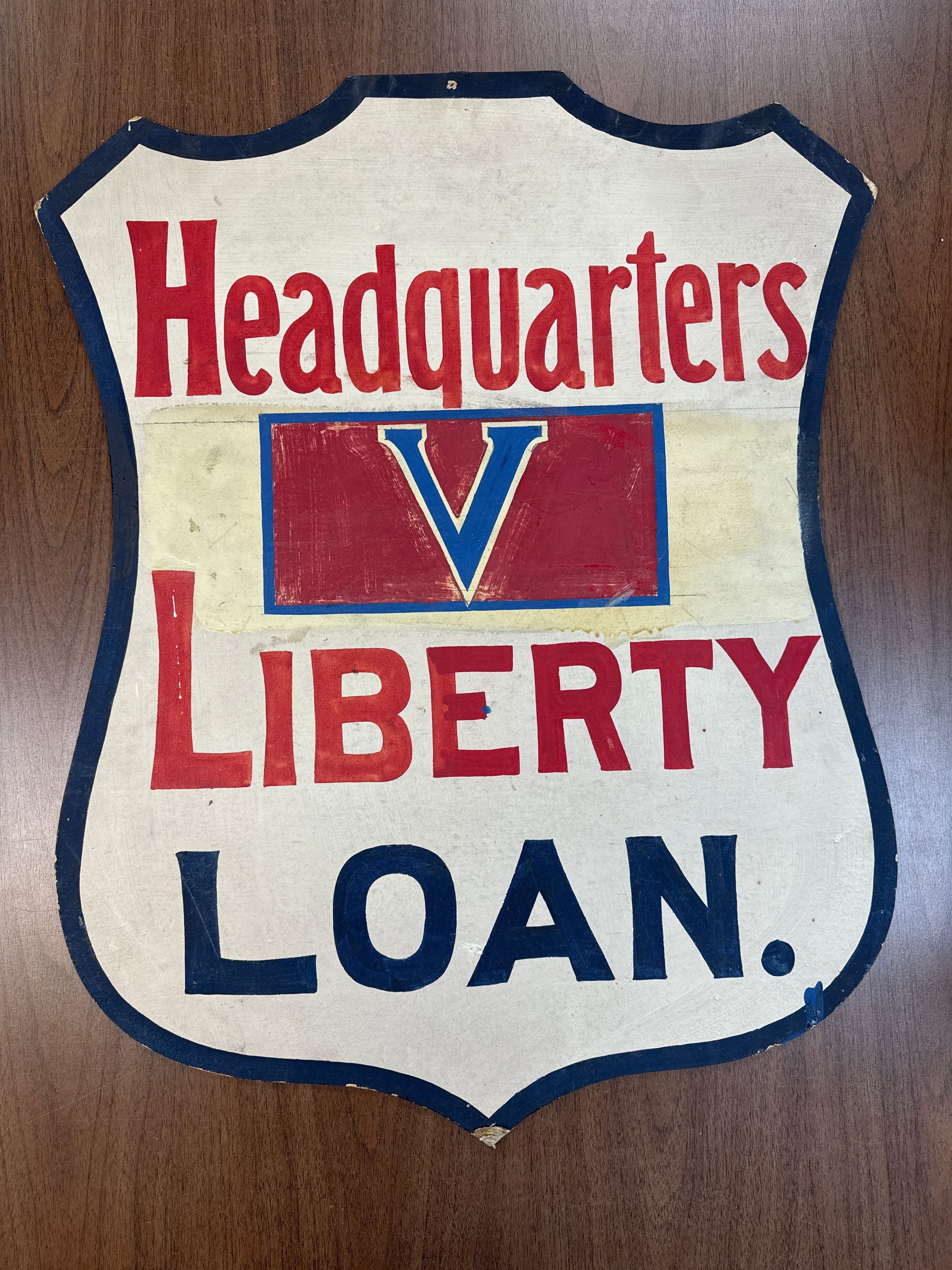 Shield shaped WWI 30" x 23" at widest point, hand made on heavy cardboard. Painted in two shades of blue and red on white board now yellowed and soiled. Poster appears to be a sign indicating the location of the "Headquarters for the 5th liberty Loan of WWI " so probably dates to c. 1918. Artist not known.Collection