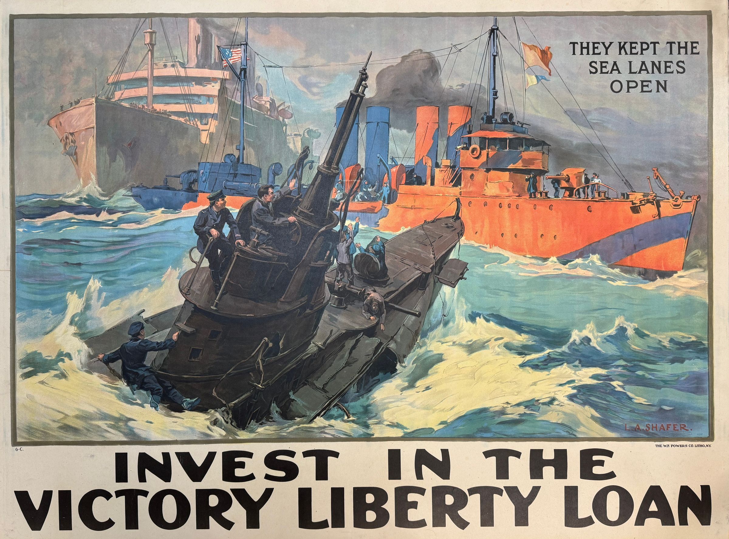 39 1/2" w x 29 1/2" h WWI poster mounted on heavy cardboard. In color picture of 3 ships in action at sea. At least one is a Naval destroyer. Printed in the picture is "They kept the sea lanes open." The black ship is a German submarine, surrendering. The third ship possibly an Am-passenger ship. Below the picture is printed "Invest in the Victory Liberty Loan". Painting is by L. A. Shafer. Not dated but it is a WWI poster probably 1918 or 1919. Slightly soiled but intact.Collection