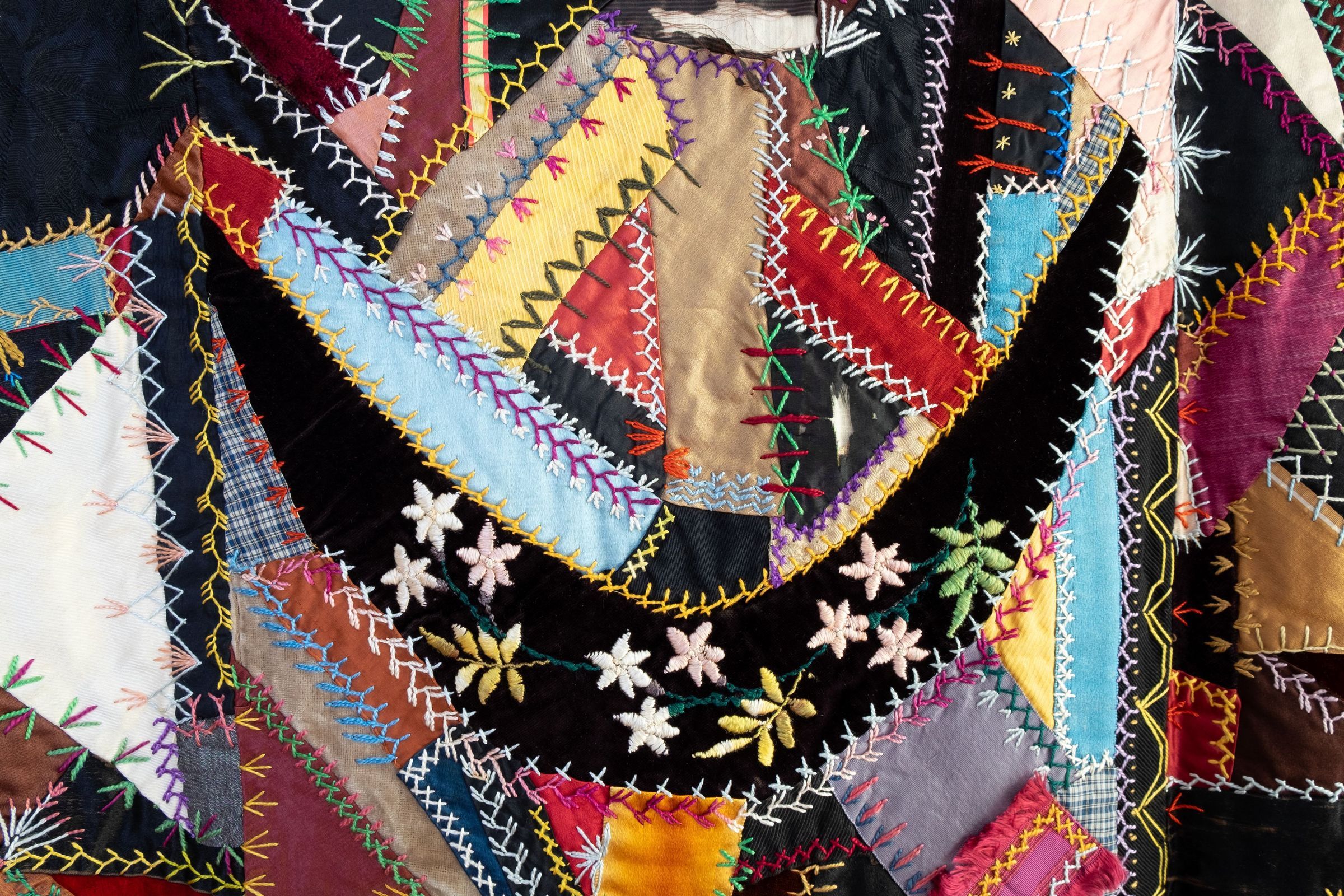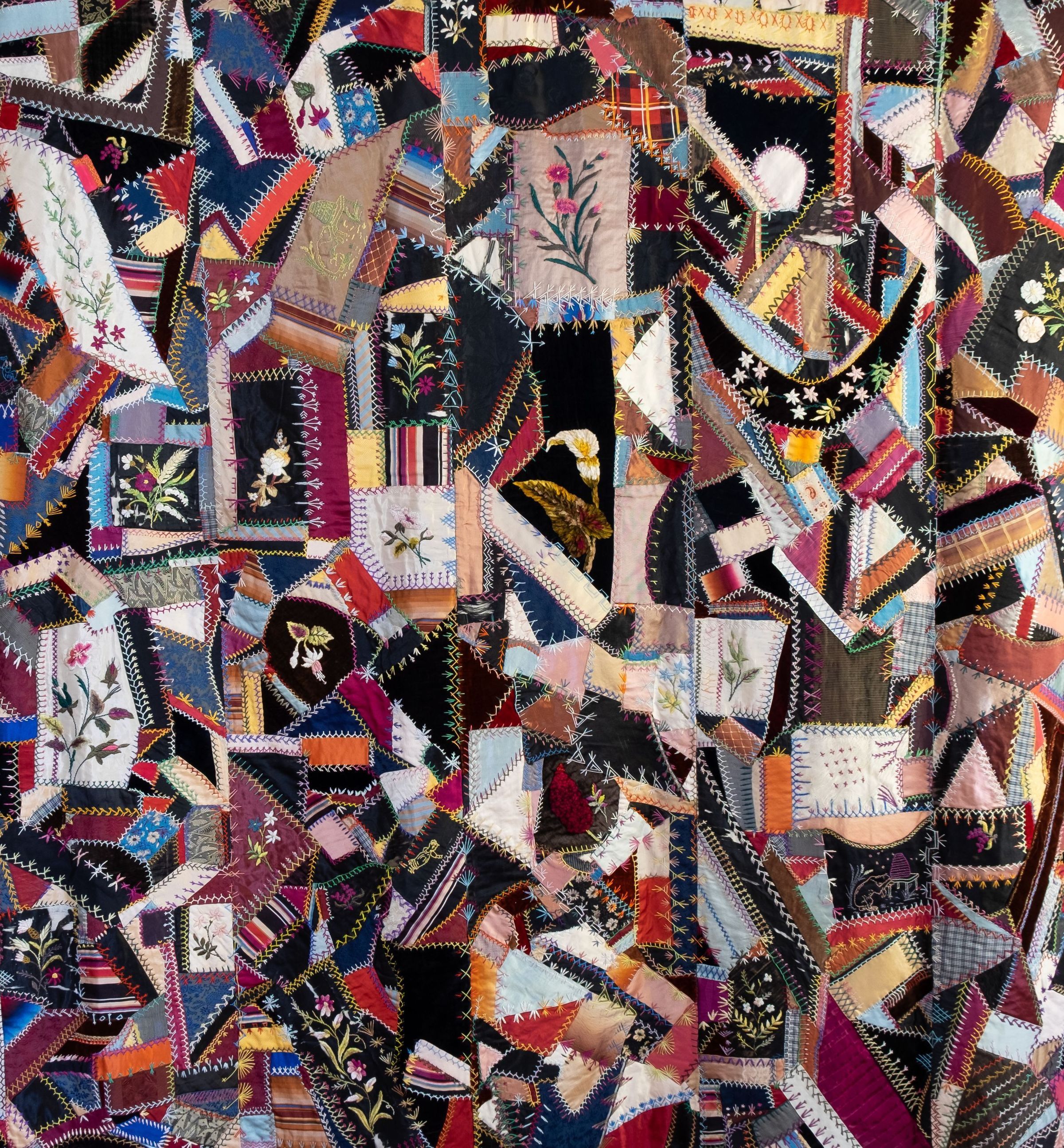 Crazy quilt. Ca. 1890. Appr. 70 x 73-1/2. Light green backing material. Purchased by donor at a rural Ripon farm auction in the 1980s. Appraisal description discusses needlework patterns, technique, finish. Blue sateen backing described in appraisal. Overall condition good. Some silk pieces disintegrating.