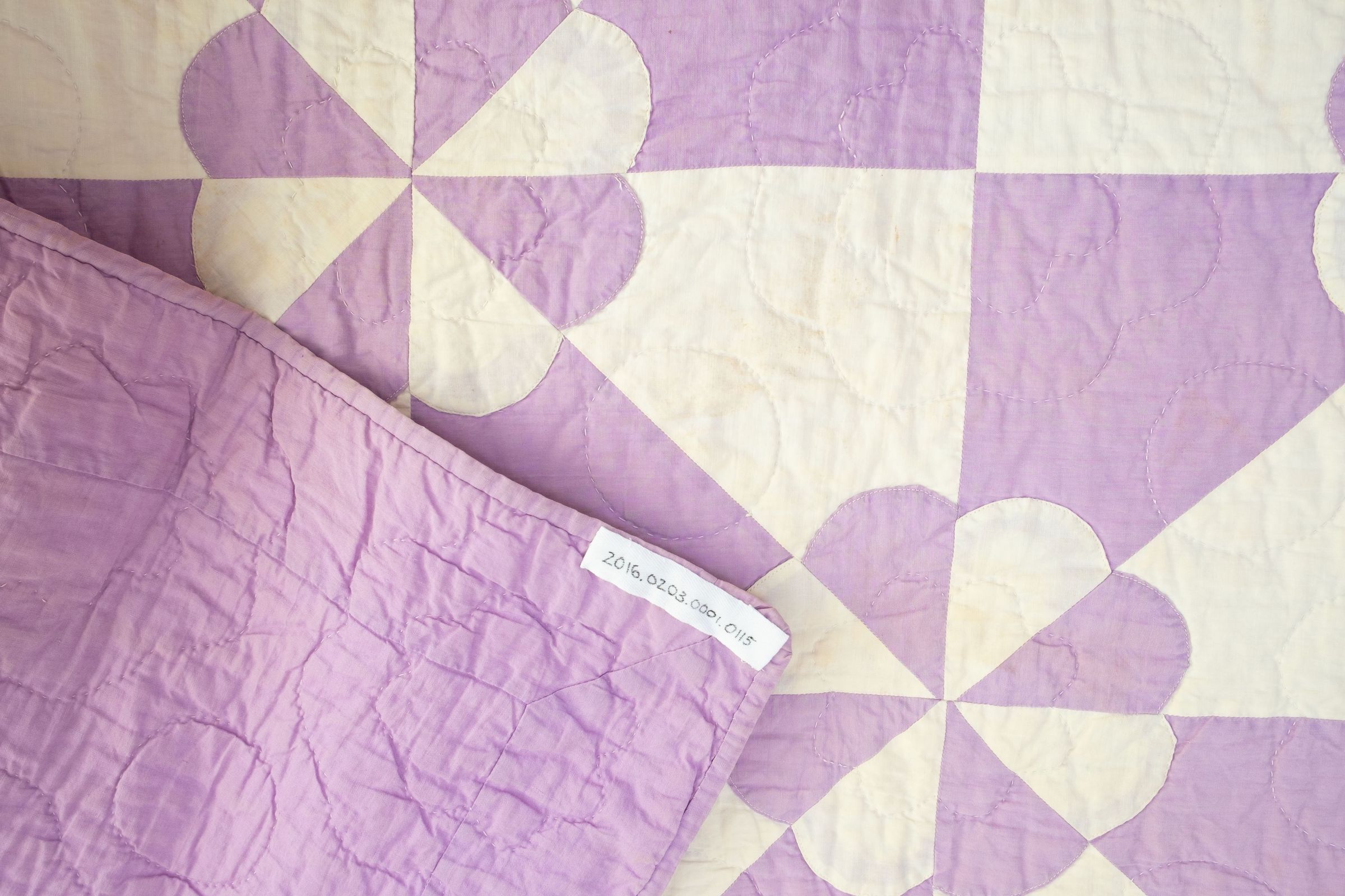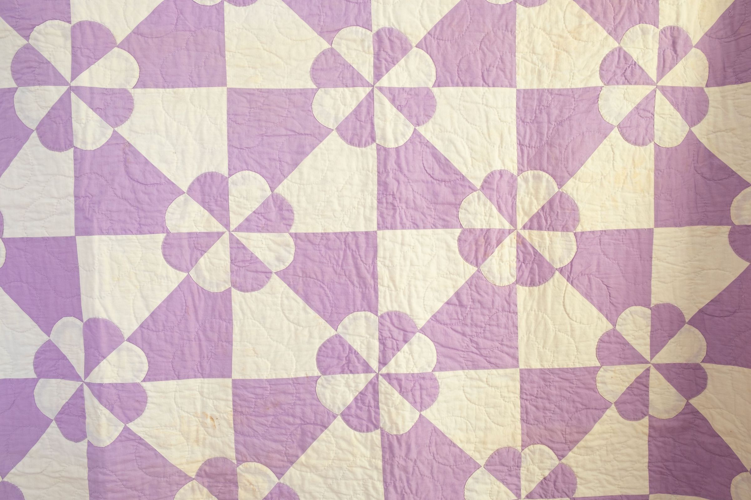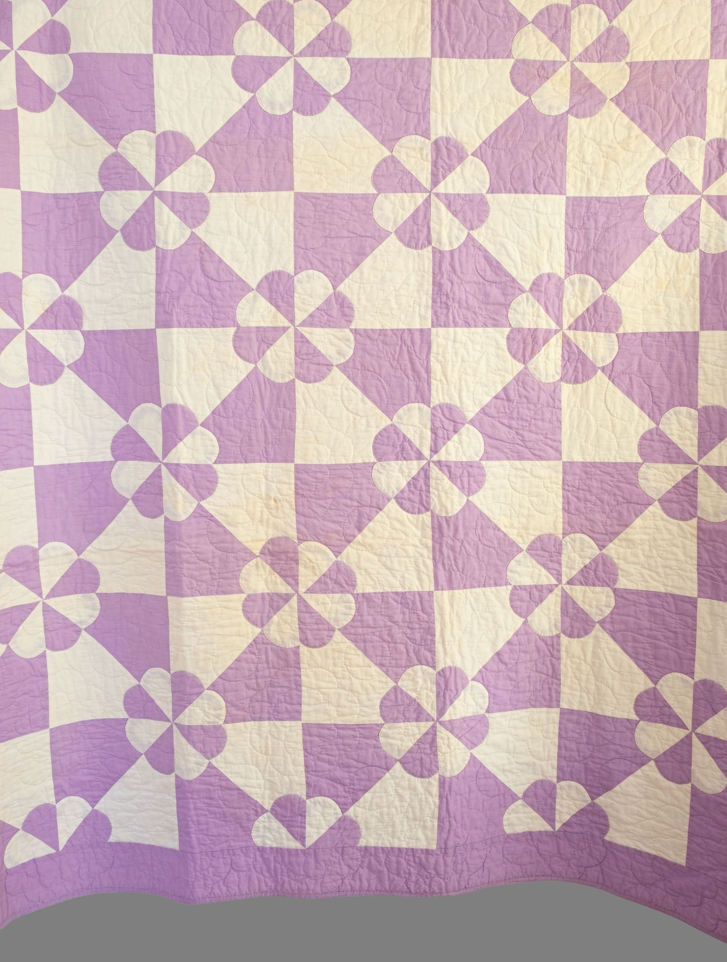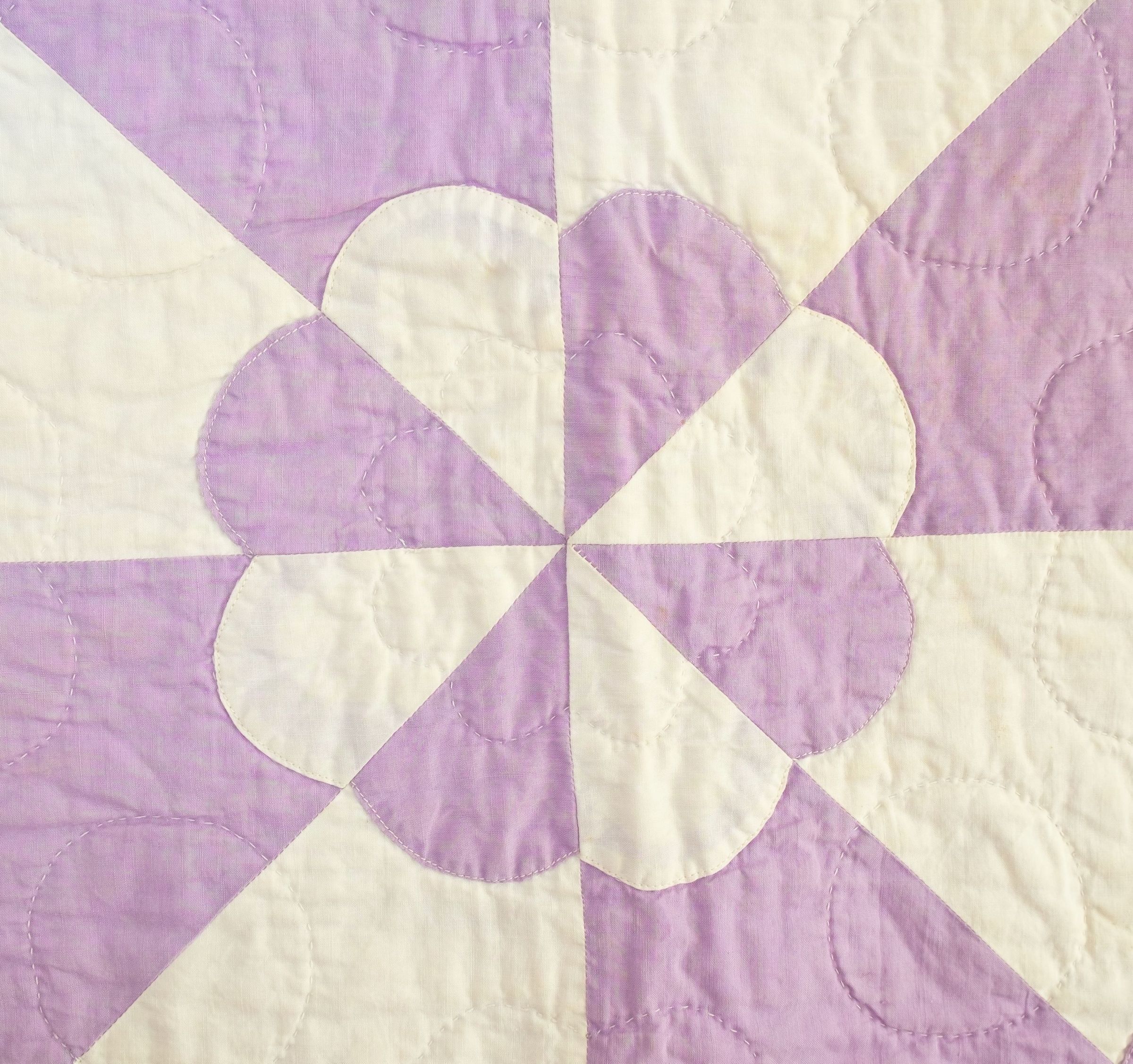 Lavender and white quilt Robbing Peter to Pay Paul pattern. Quilt made by quilting group which met at Lillian Steinbring's house, 610 Liberty Street (Octagon House). Per son John (aka Jack) others in the group included Mrs. Delia Zick, Mrs. Howard Durland, Mrs. Chester Whiting, and Mrs. Albright. Mrs. Steinbring had a frame and the ladies all sat around it in the dining room (library as of 2016). According to Jack quilt was made during WWII era. Lavender and white eight-petal flowers in alternating colors. Lavender back and border. White shows some staining but displayable. Another name for pattern is Hearts and Gizzards.