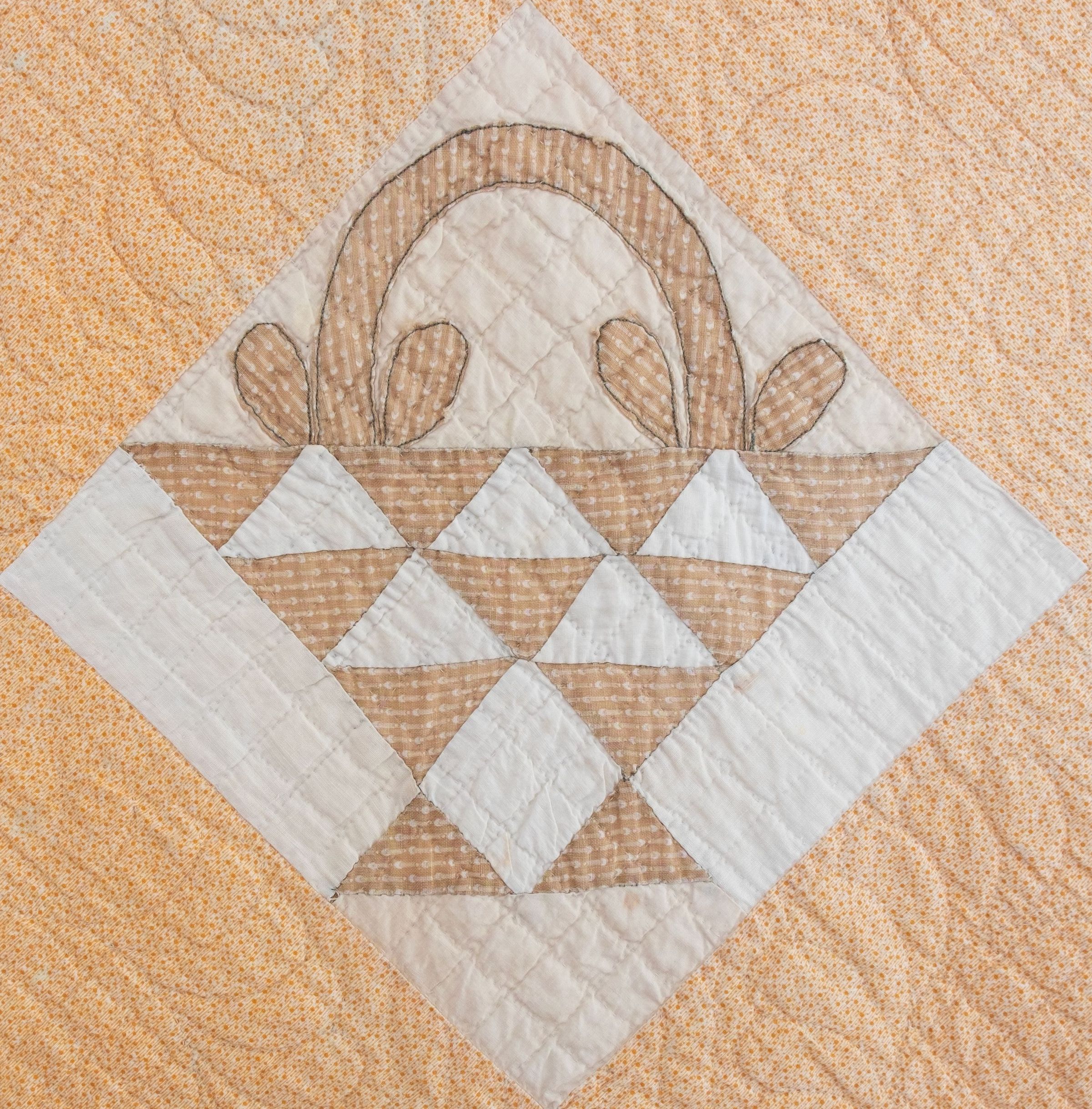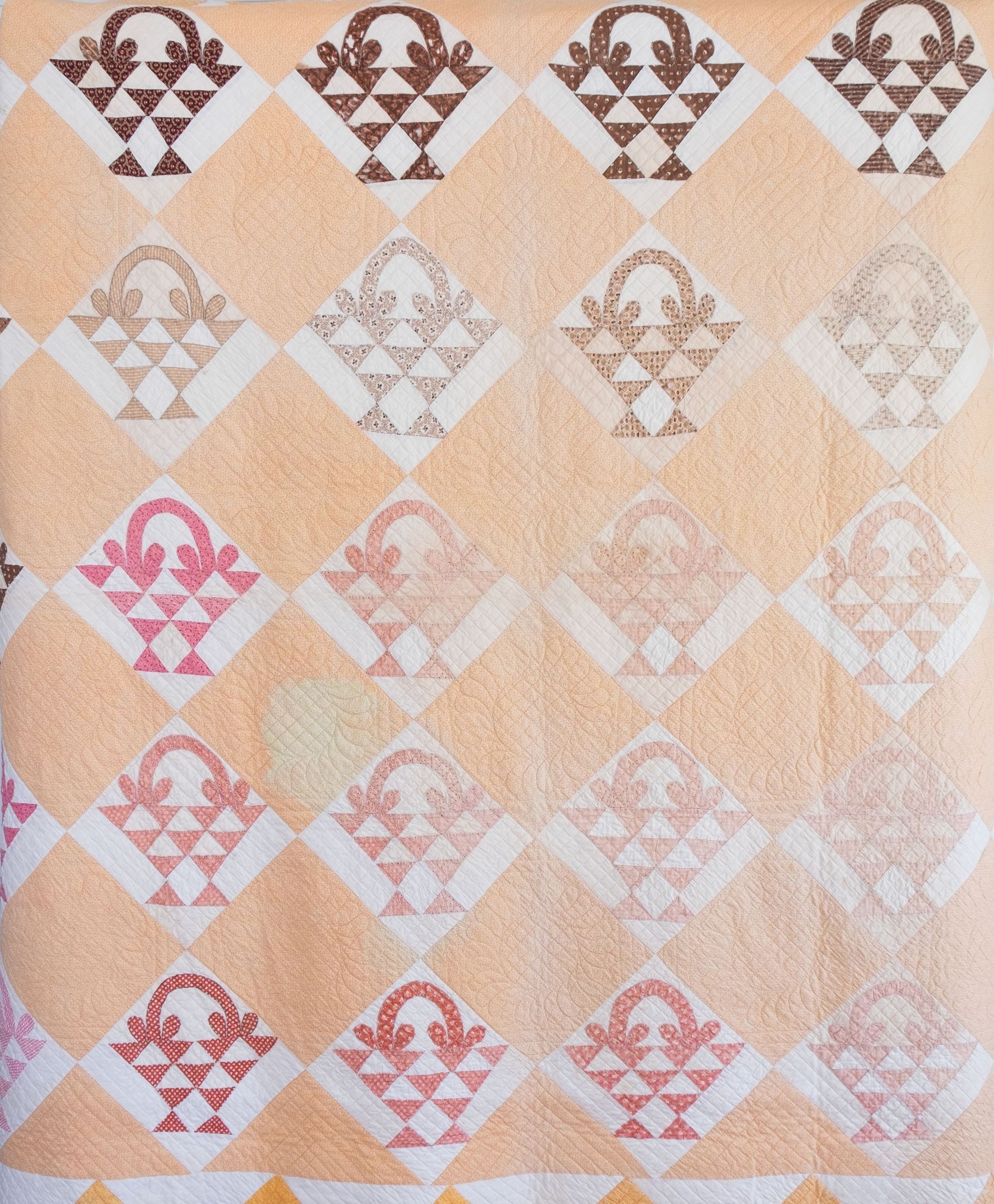 Quilt. Basket pattern of pink/red/tans. 90-1/2" x 76". Hand stitched and quilted. Blocks of butterscotch with round quilted pattern. 4-1/2" border of cream with 9" long triangles. Backed in cream cotton fabric.