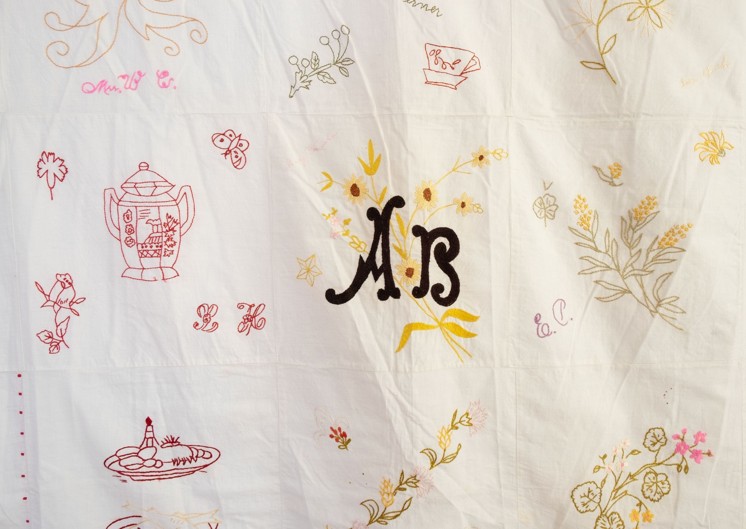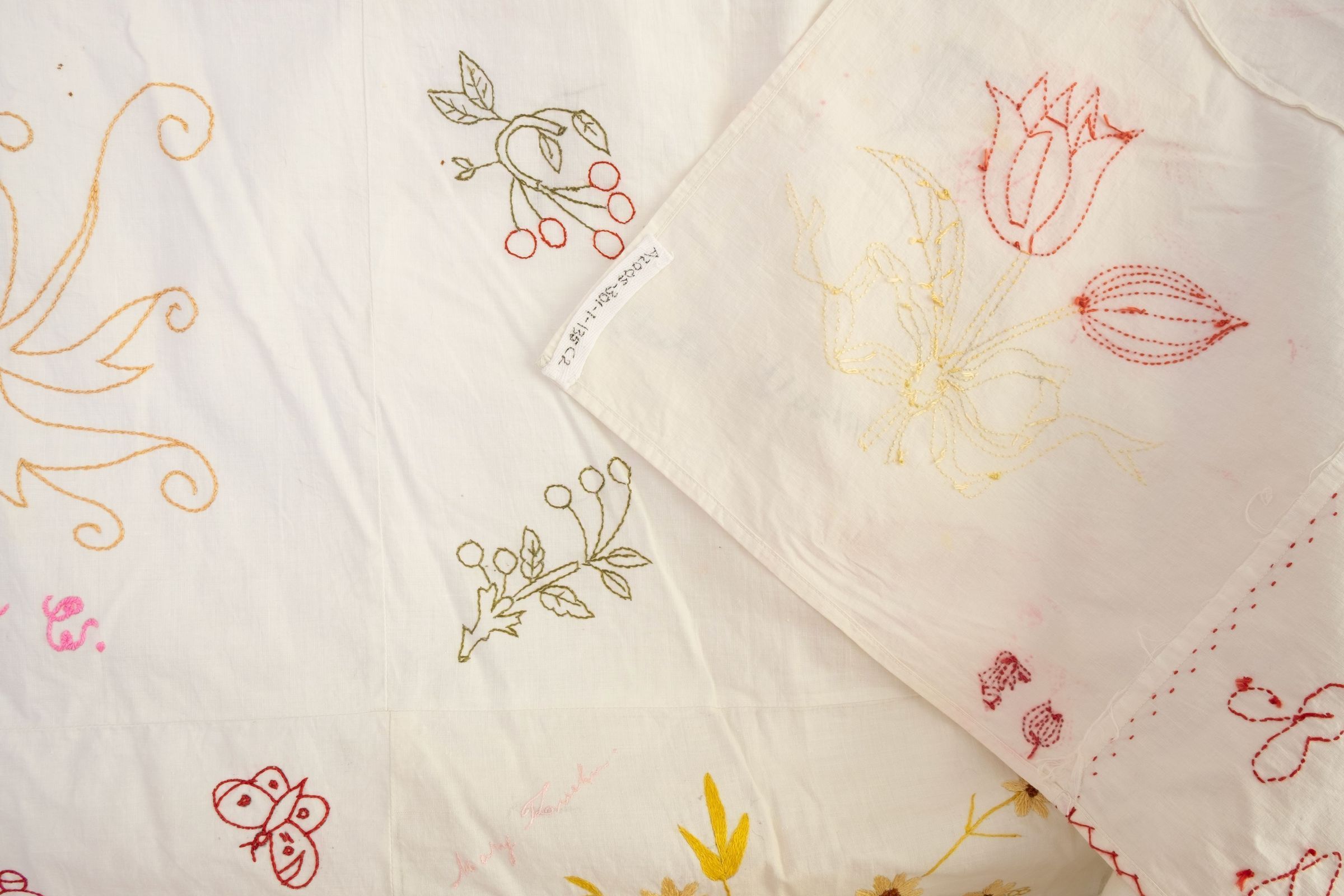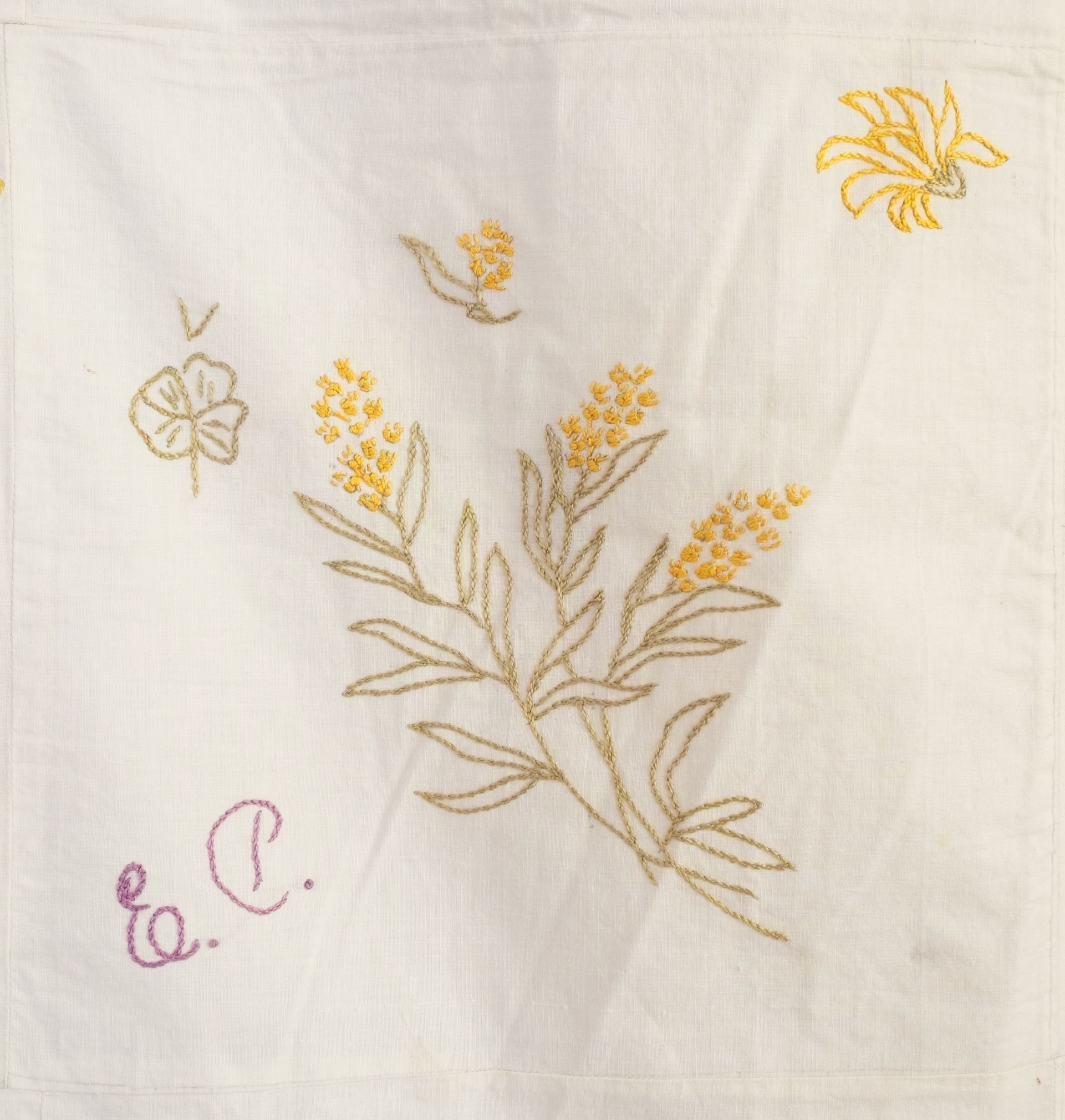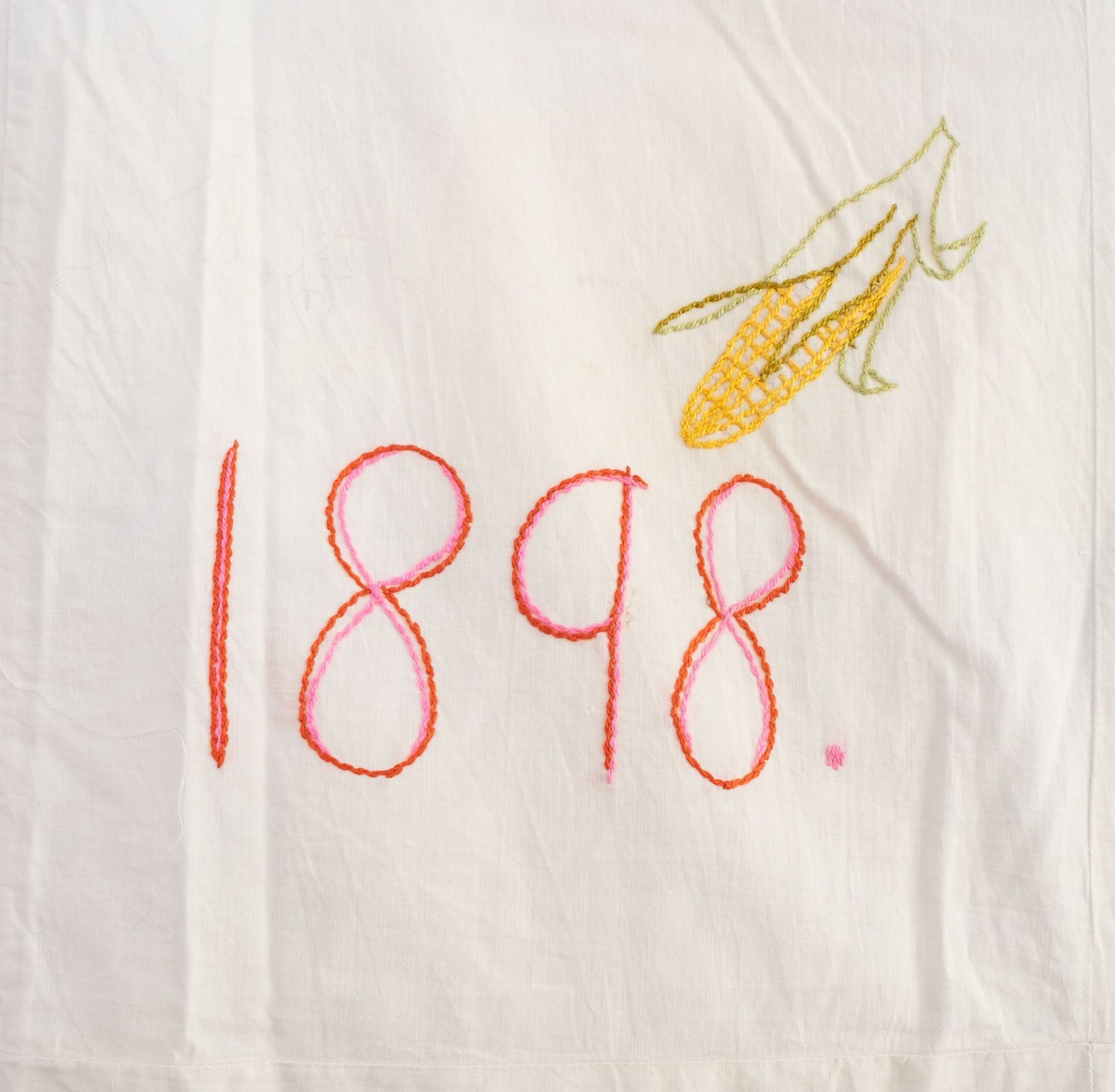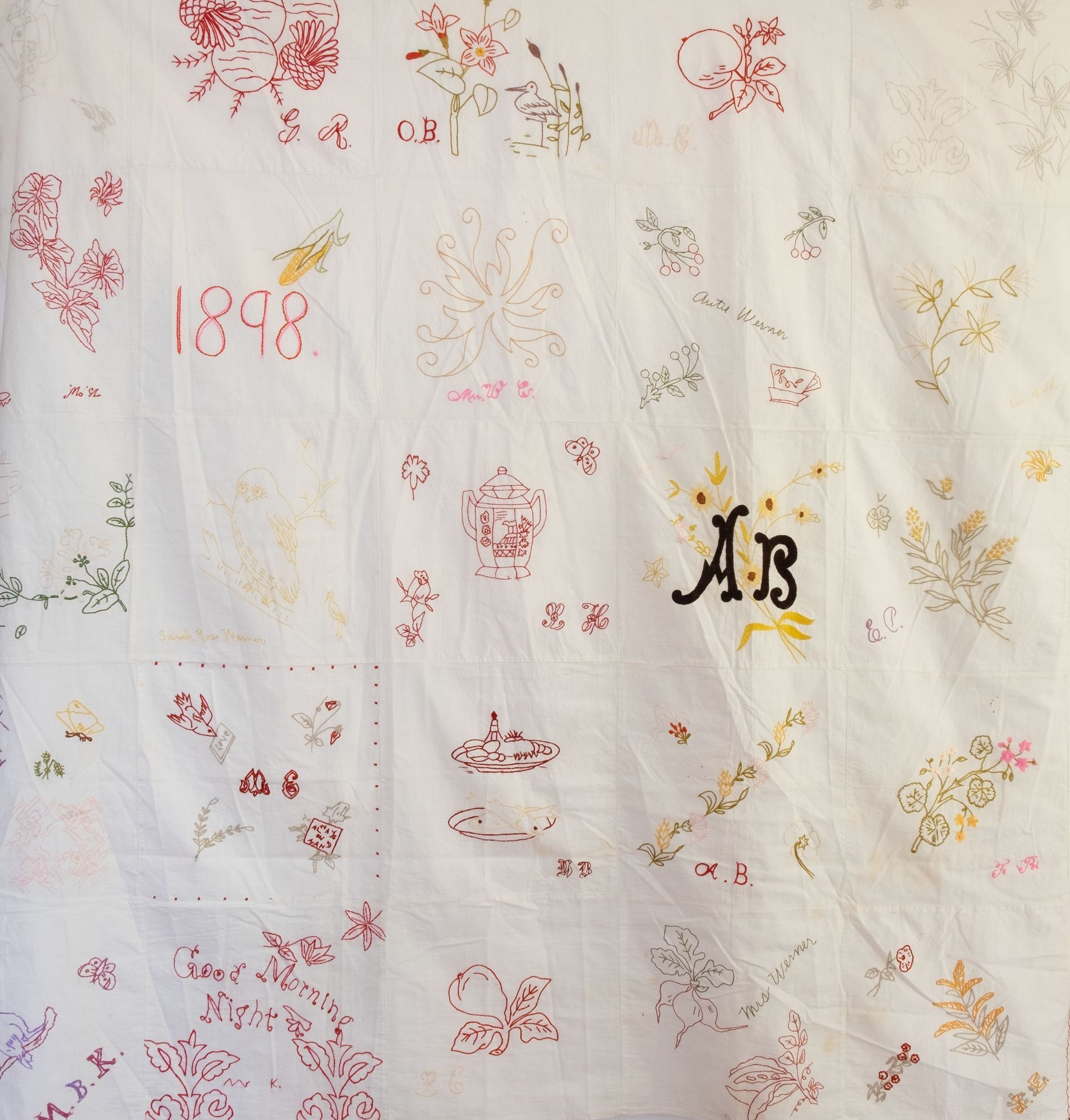 Quilt cover c. 6'6" x 6'6", with hemmed edge. Embroidered in colors on natural muslin squares. Appears to have been made by several sewers with different stitches. The dates 1896 and 1898 are in two separate squares and the names "Auntie" Werner, Sara Rose Werner, Mrs. Werner and Ida Kuehn in other squares. Relation of these persons to the donor, Mayvin Witt, and no history of or date of the cover is known. Slightly discolored with age but intact fabric and embroidery. Mayvin Witt was born in 1909, never married, and died in Ripon in 1990.Collection