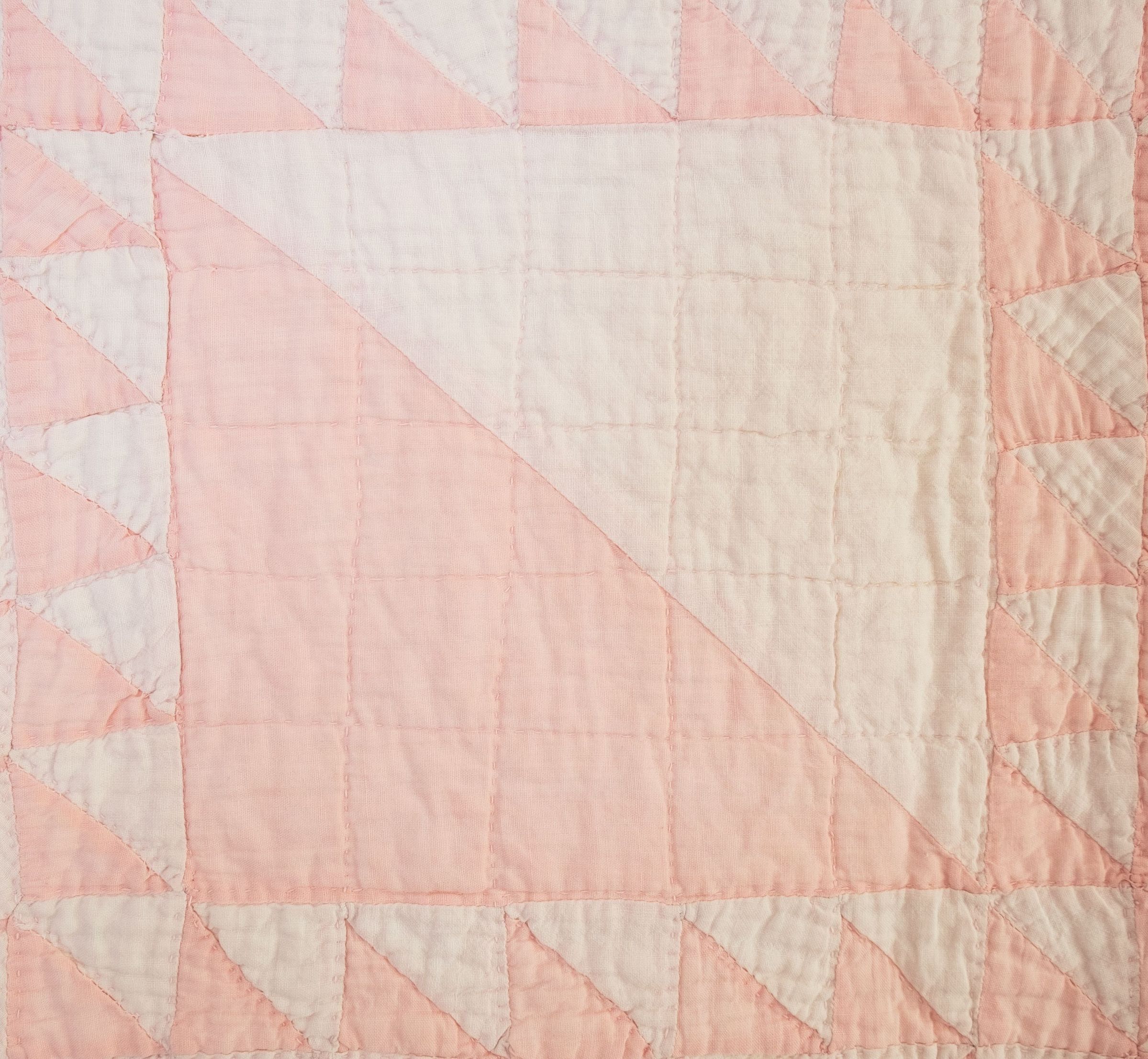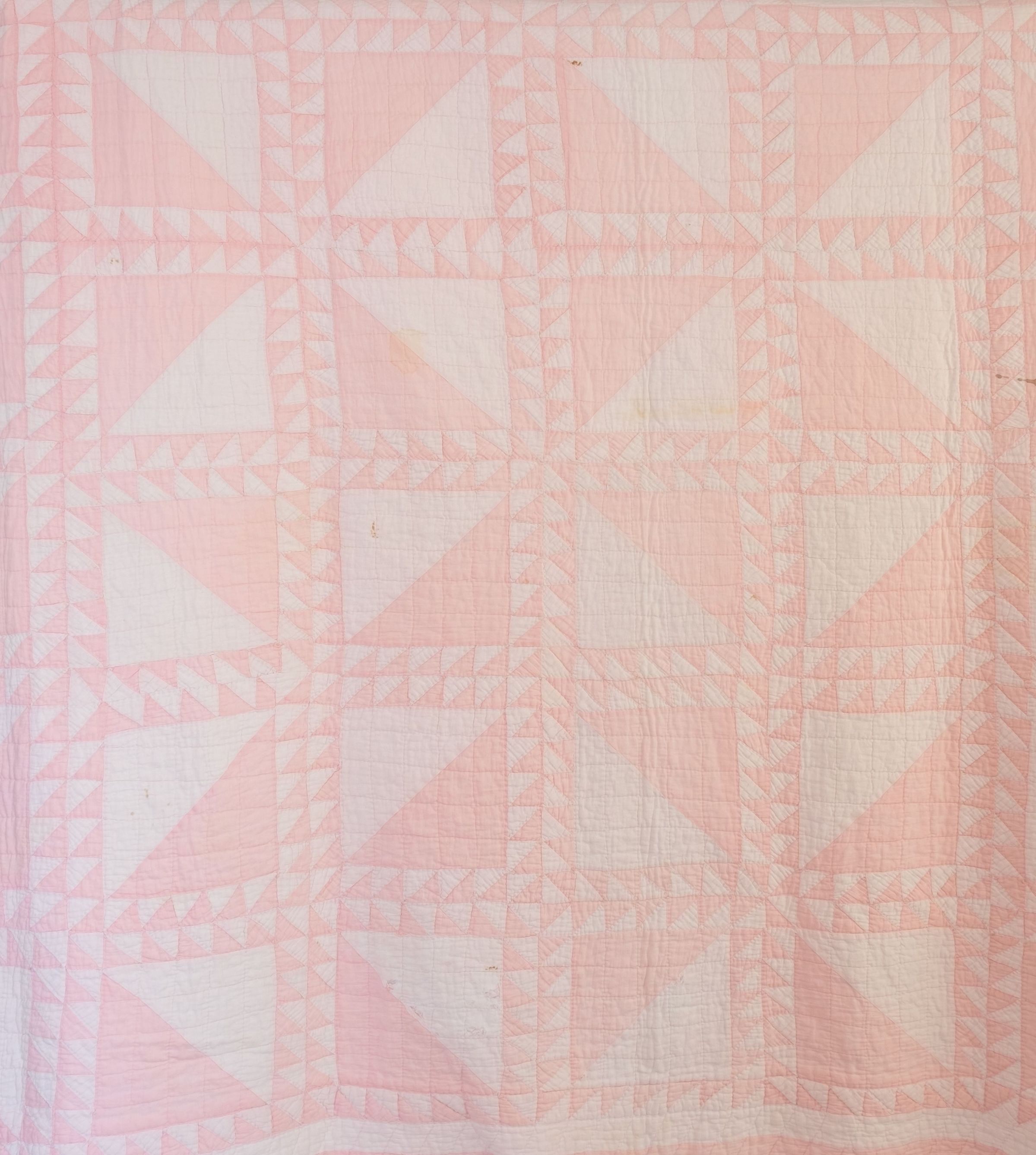 The quilt is light pink basket pattern with a 2" pink border and .5" white border. White backing. Hand quilting. Some fraying along the borders. 74.5' x 65".Collection
