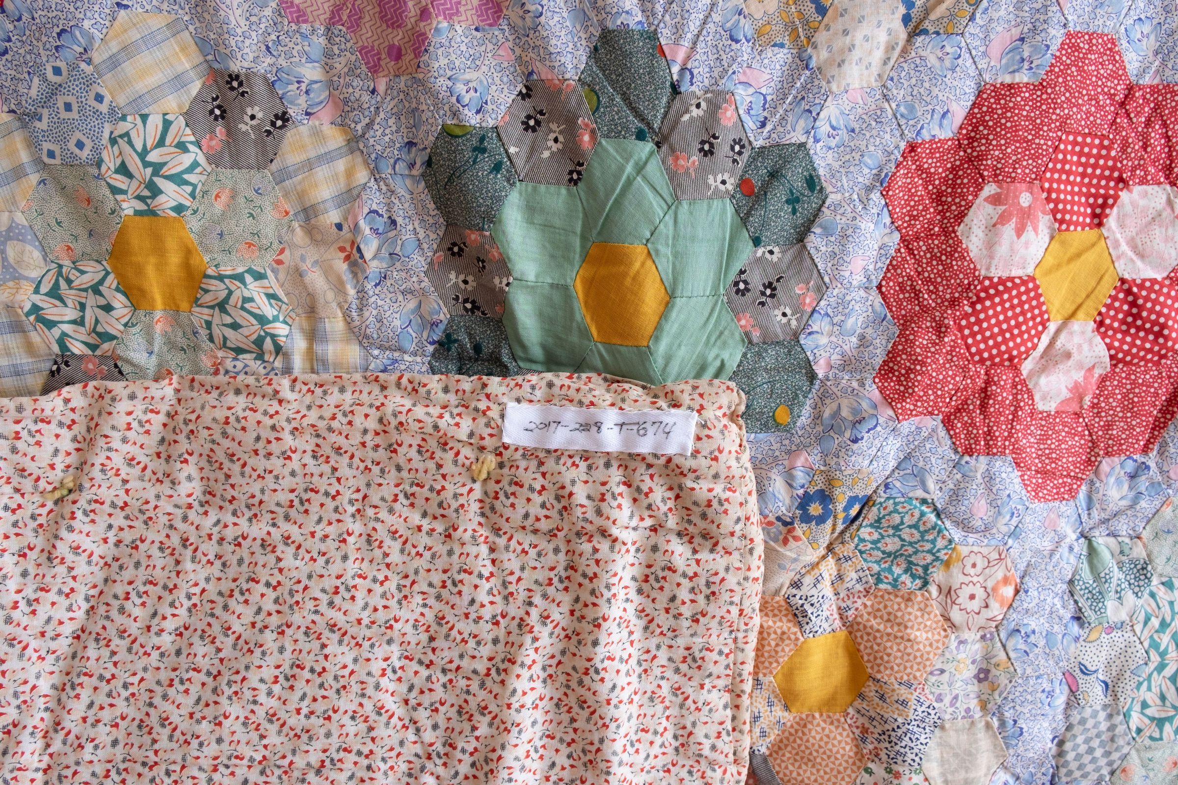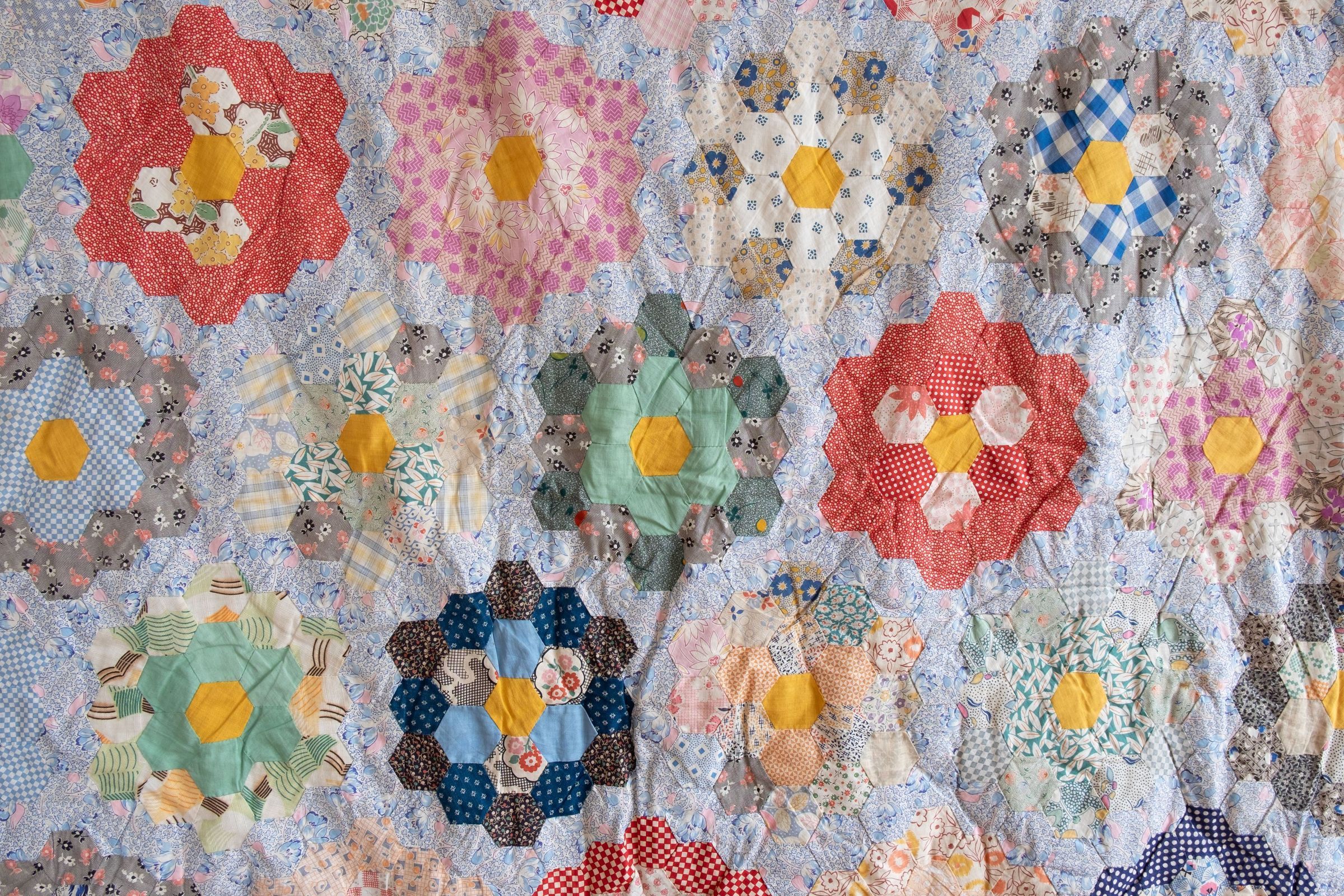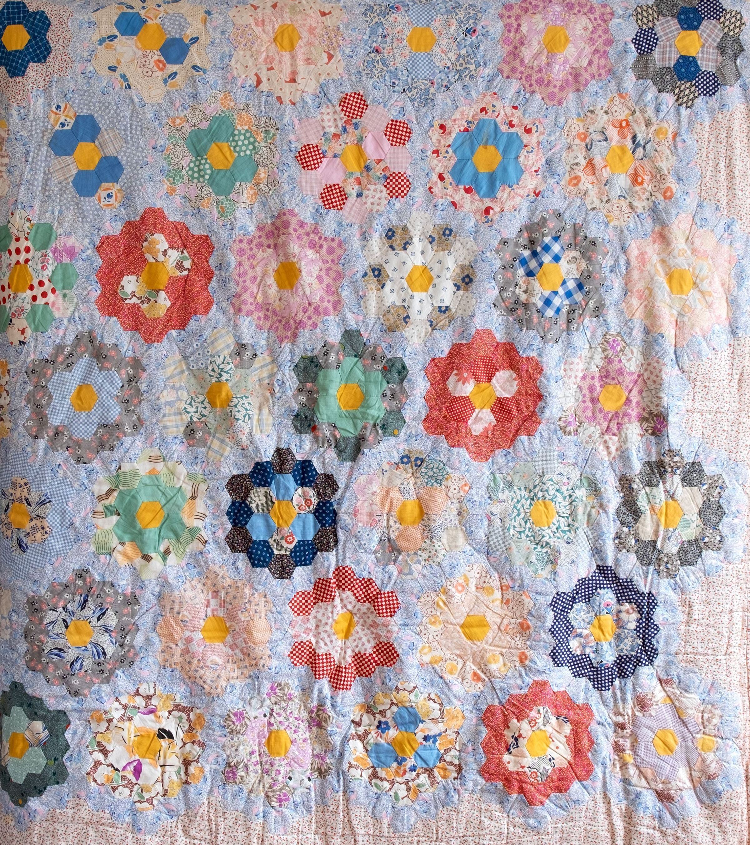 Adamski family quilt. 1930s era. 71"x01" Assumed to be made by the women of the Adamski family: Balbina (mother), Agnes, Mary, Gertrude (daughters). Hexagon Grandma's Flower Garden pattern. Yellow fabric hexagon in the center of each flower. Up to 6" edge of orange/black/tan fabric. The edging fabric is found on the back. Batting filled and tied on the backside with green yarn. Some staining.