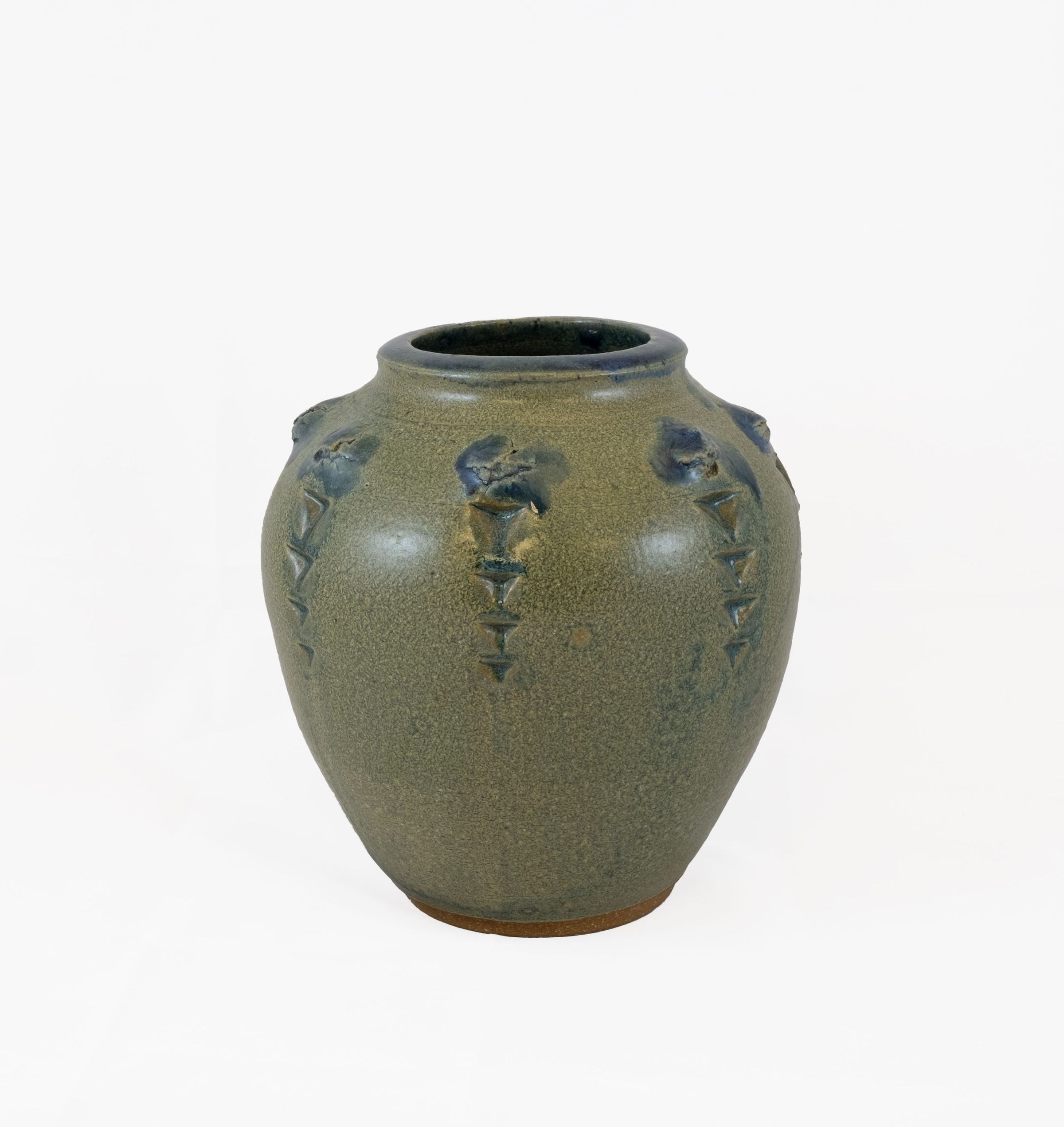 Raku style pot thrown by Eugene Kain. Pot features greens and grays with vertical designs around the upper portion of the pot. Approximately 6"x7".Context